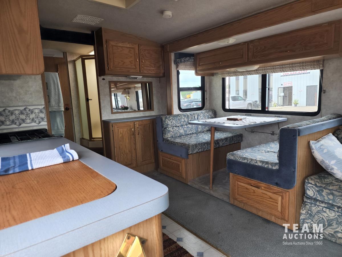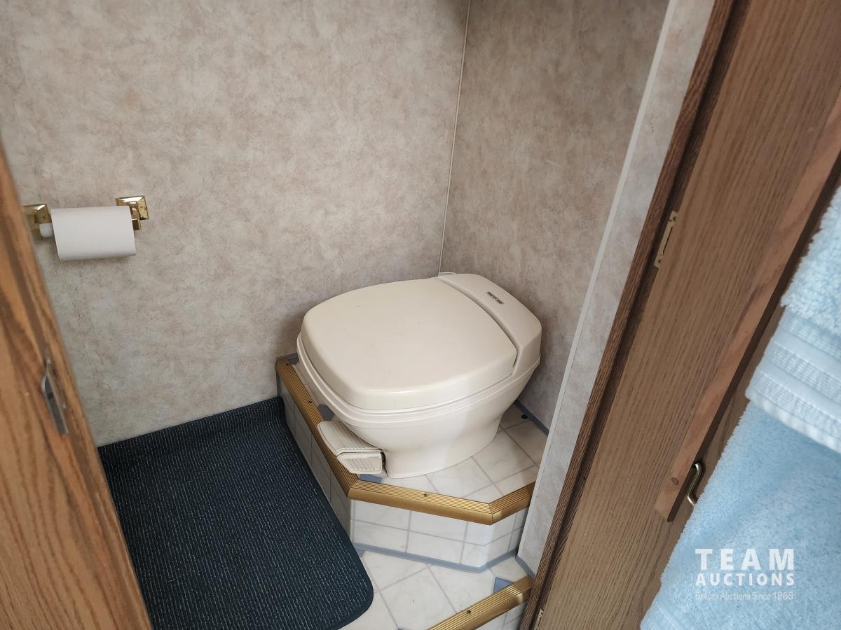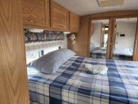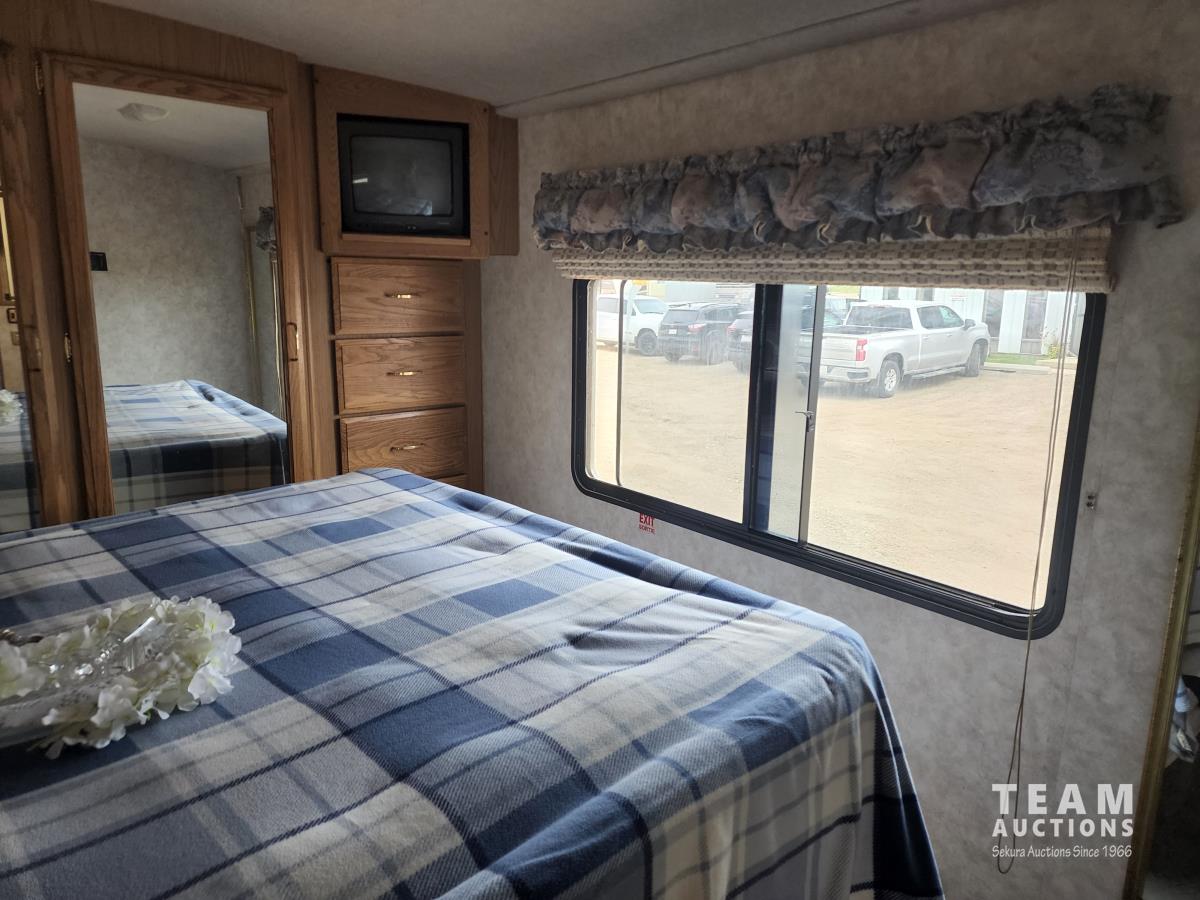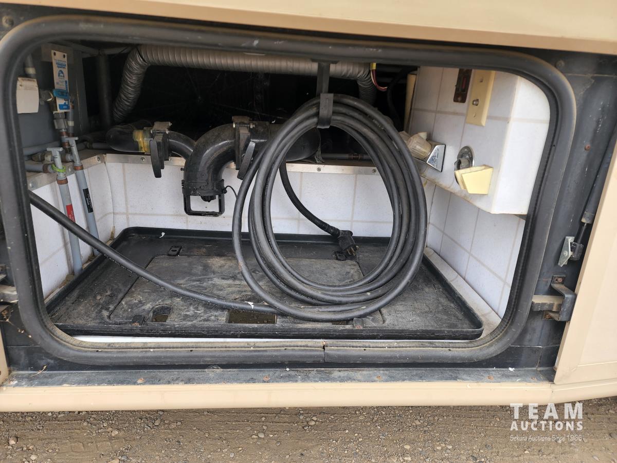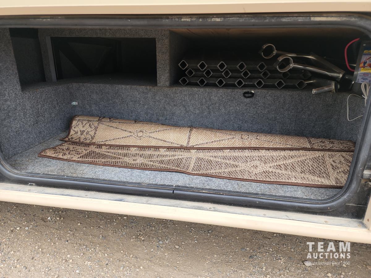460 Ford engine (fuel injected), one 13 ft slideout, 18 ft awning, (2) top a/c units, dash a/c, fridge, stove, microwave, sofa, (2) chairs, dinette, backup camera, new air mattress, (2) TV's, DVD player, tag axle, Onan 5000w generator, 1250w inverter, sleeps 4, 235/85R16 dual tires