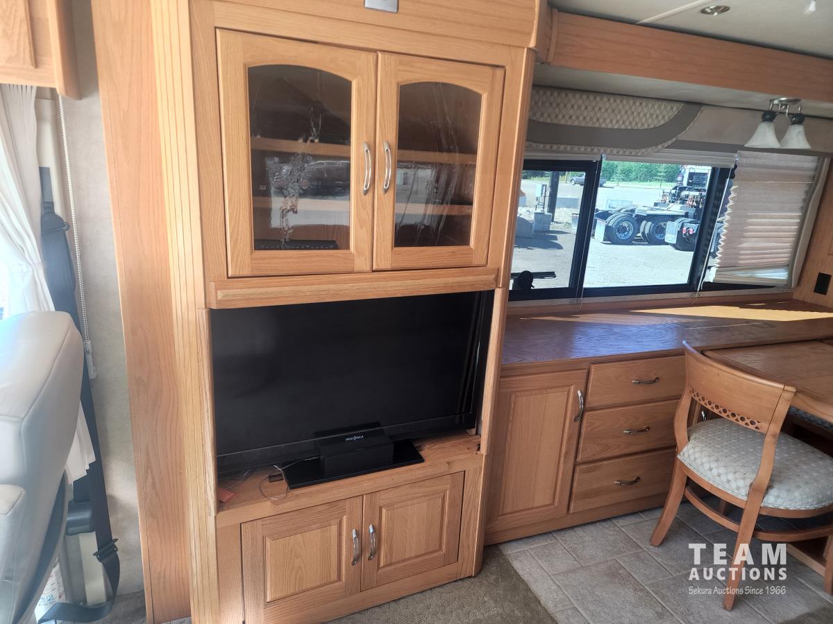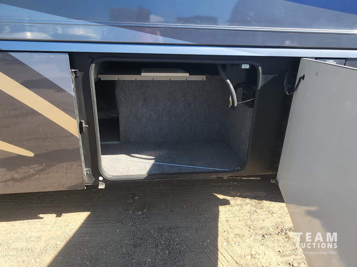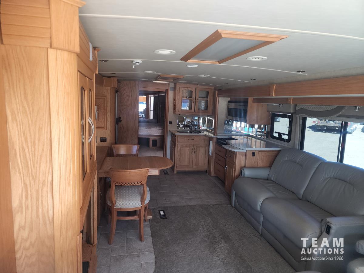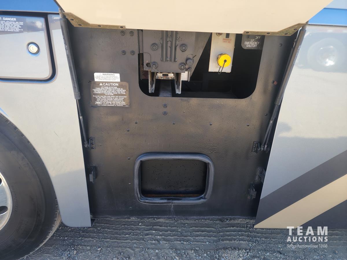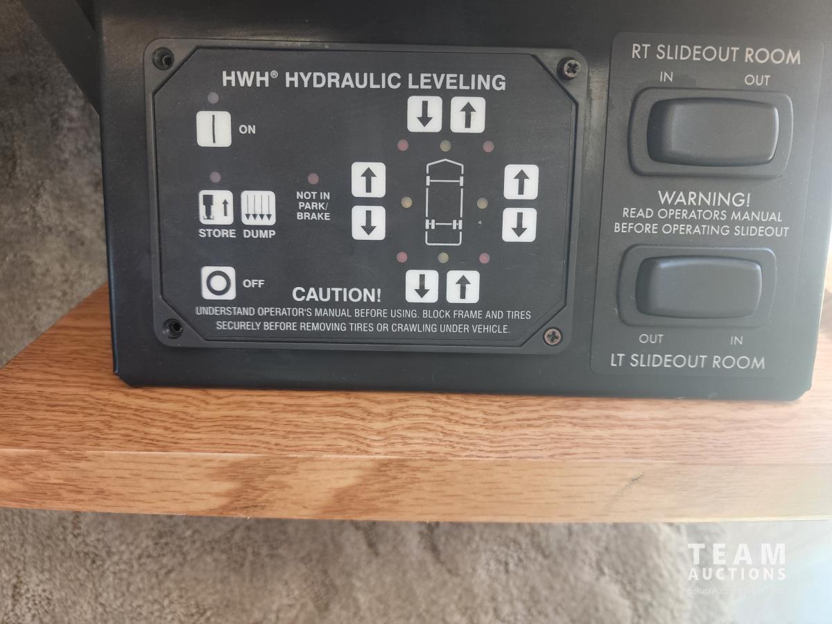 Cat 360 engine, Alison auto transmission, (3) slide outs, hydraulic leveling, fridge, stove, microwave, washer/dryer combo, queen bed, large bathroom, power reclining loveseat, TV, a/c, dinette, double fridge, side pantry, outdoor stereo, backup camera, 295/75R22.5 tires on aluminum rims