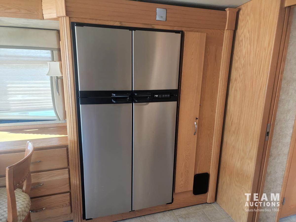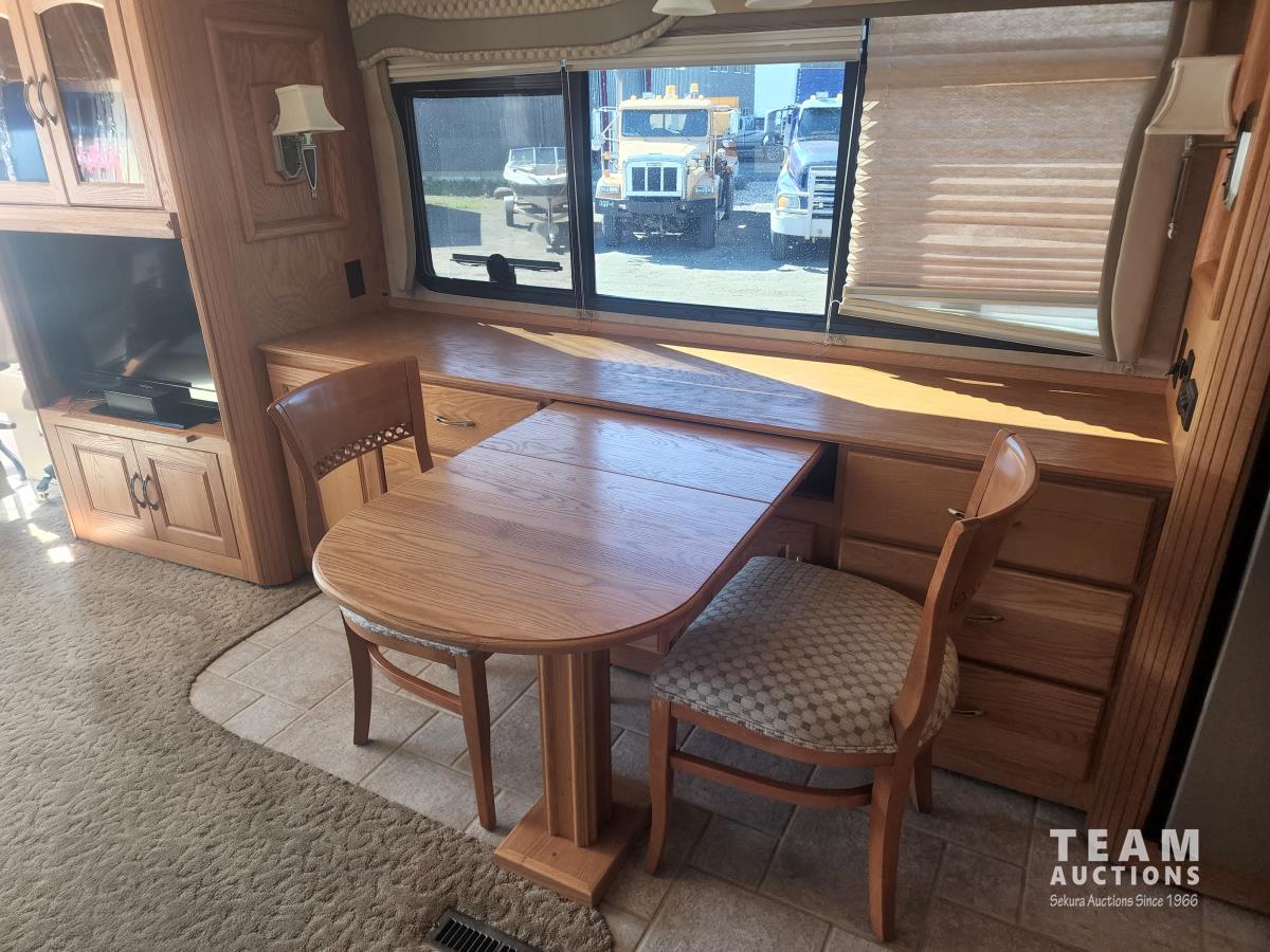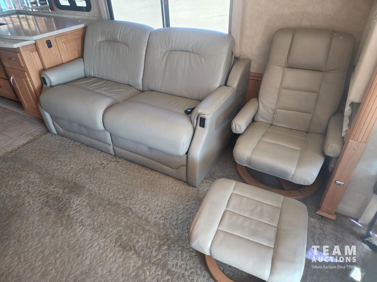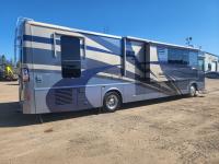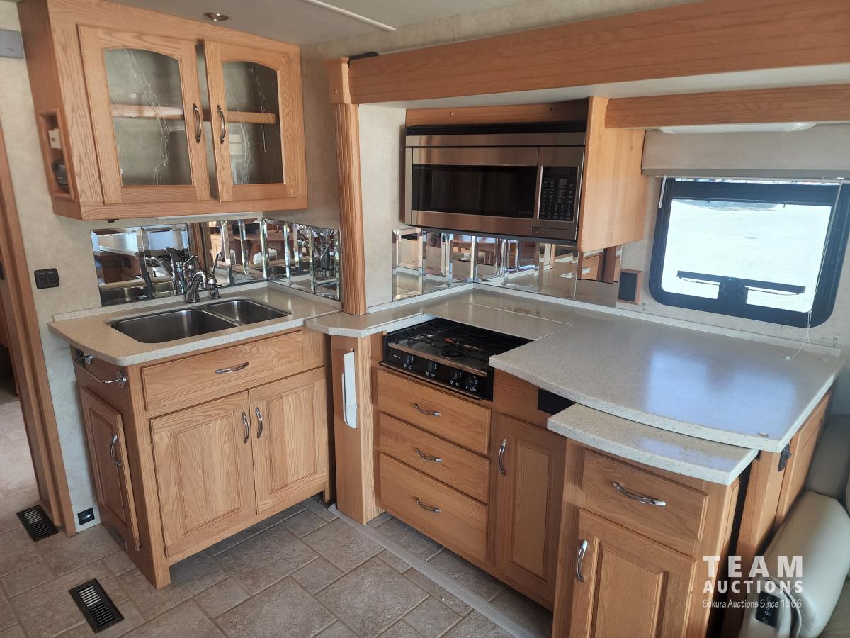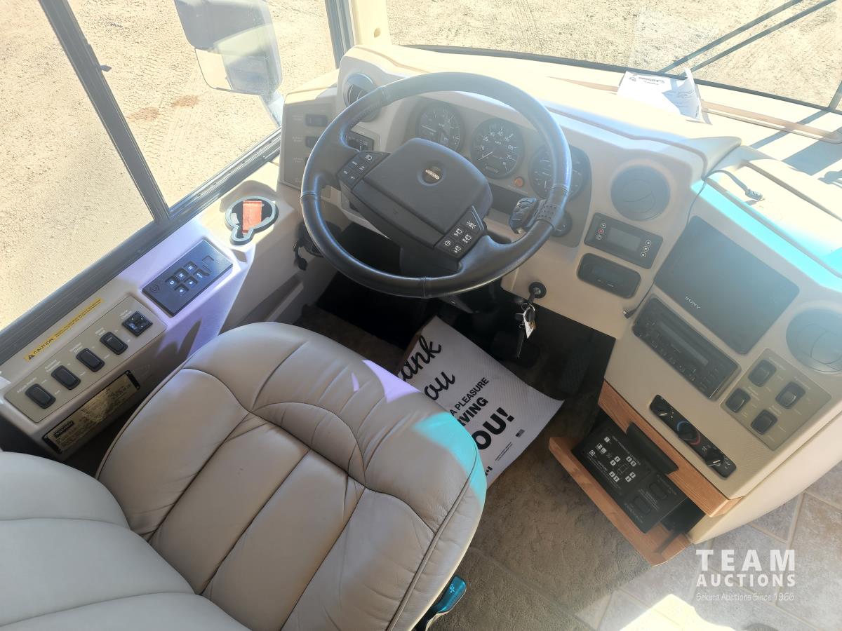 Cat 360 engine, Alison auto transmission, (3) slide outs, hydraulic leveling, fridge, stove, microwave, washer/dryer combo, queen bed, large bathroom, power reclining loveseat, TV, a/c, dinette, double fridge, side pantry, outdoor stereo, backup camera, 295/75R22.5 tires on aluminum rims