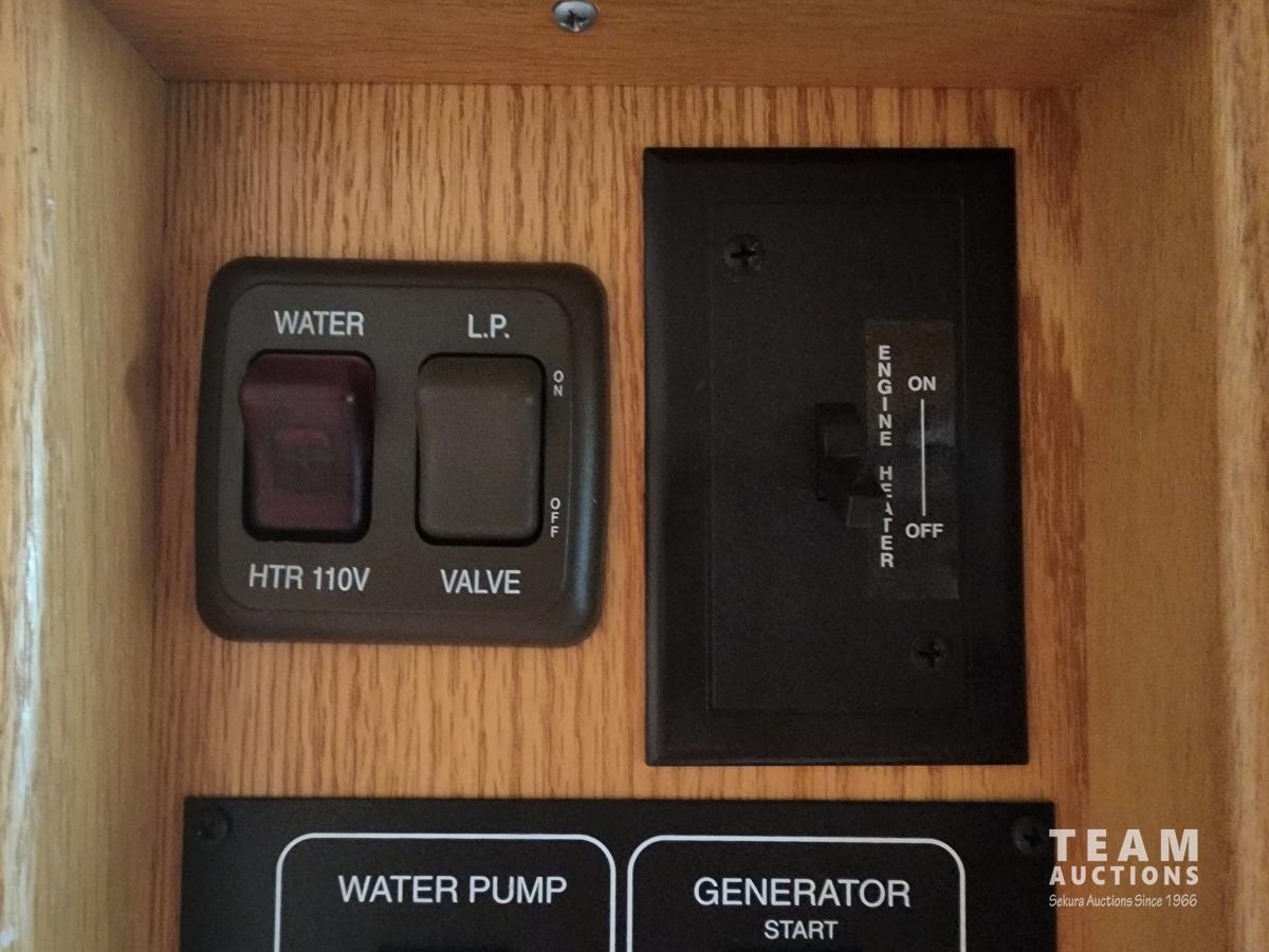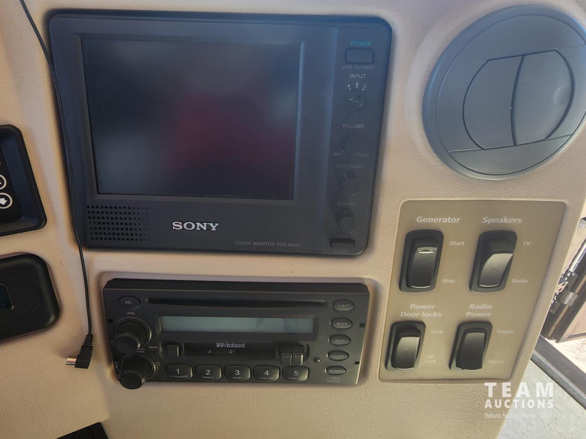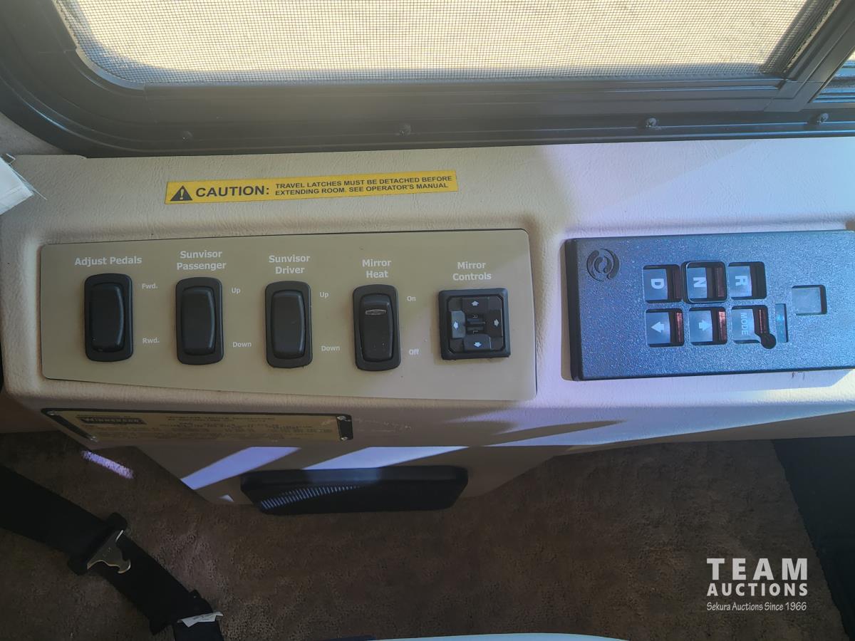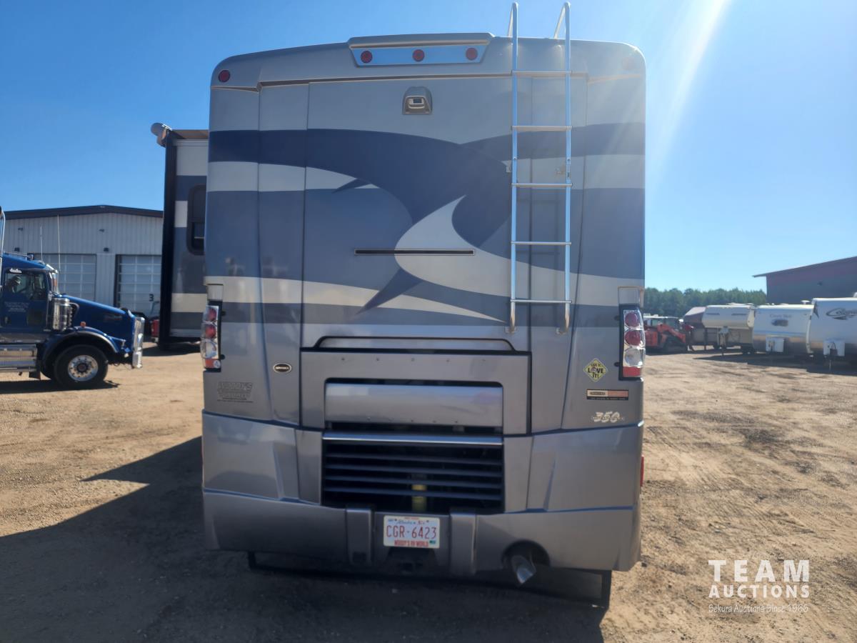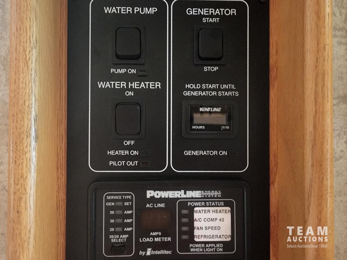 Cat 360 engine, Alison auto transmission, (3) slide outs, hydraulic leveling, fridge, stove, microwave, washer/dryer combo, queen bed, large bathroom, power reclining loveseat, TV, a/c, dinette, double fridge, side pantry, outdoor stereo, backup camera, 295/75R22.5 tires on aluminum rims