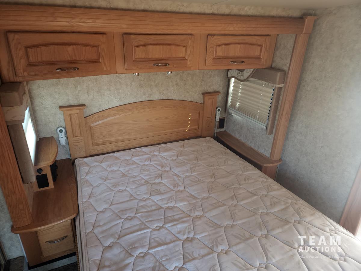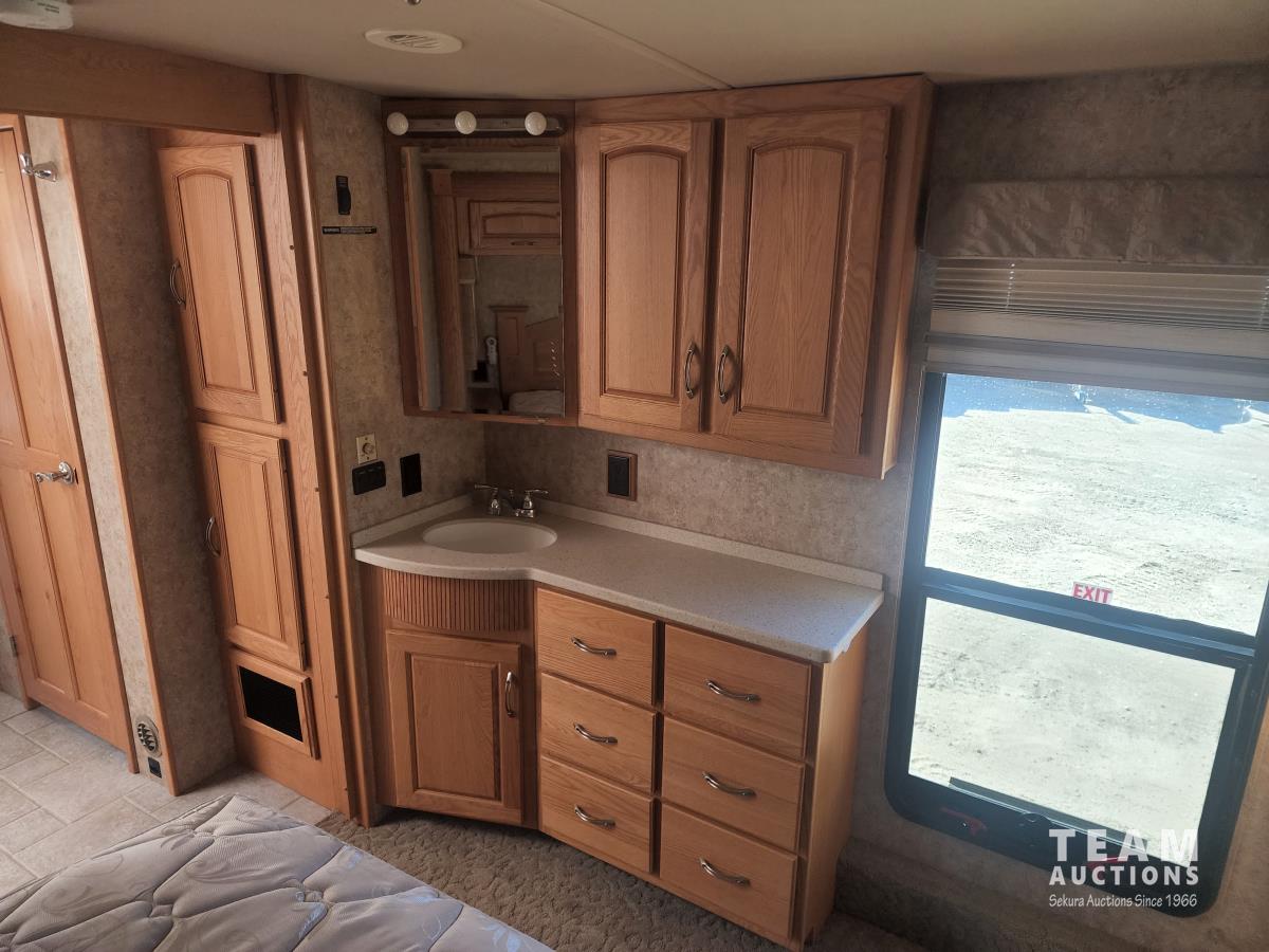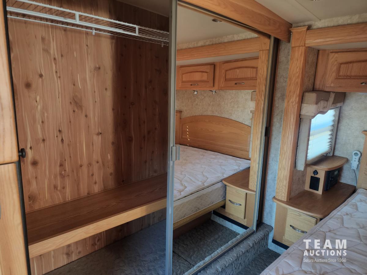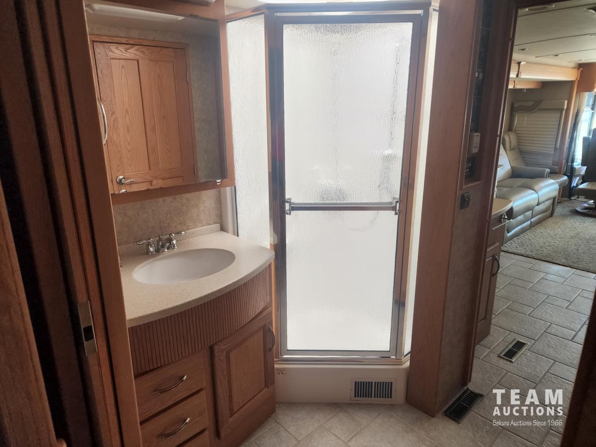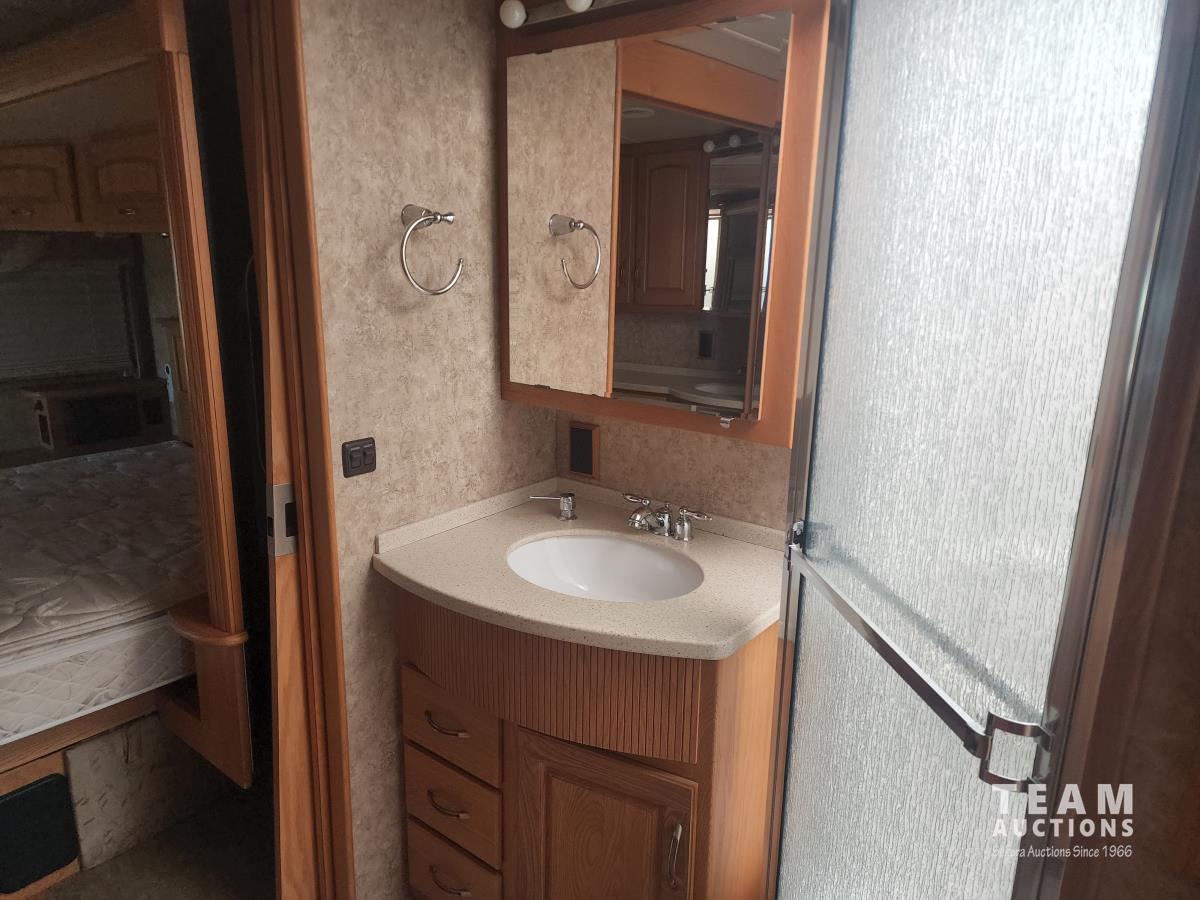 Cat 360 engine, Alison auto transmission, (3) slide outs, hydraulic leveling, fridge, stove, microwave, washer/dryer combo, queen bed, large bathroom, power reclining loveseat, TV, a/c, dinette, double fridge, side pantry, outdoor stereo, backup camera, 295/75R22.5 tires on aluminum rims