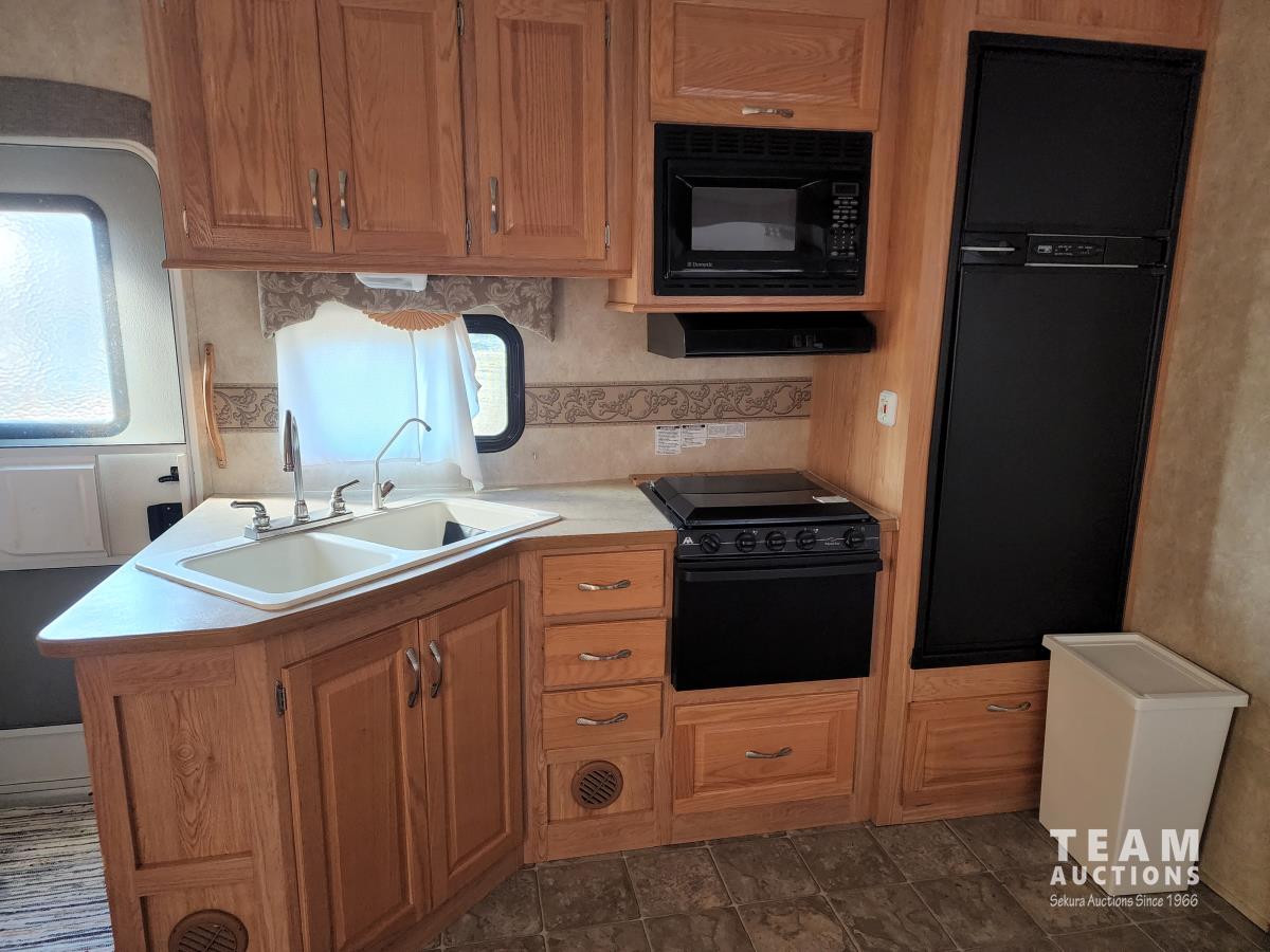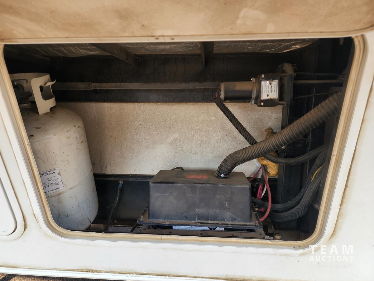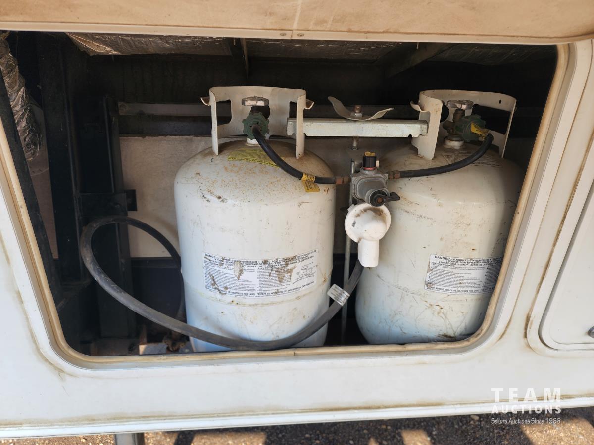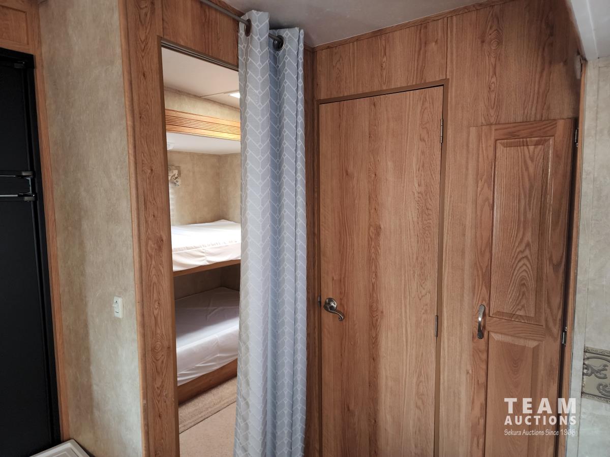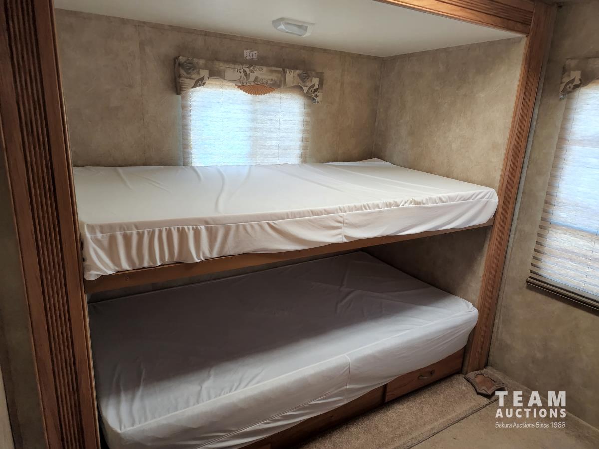 (2) slide outs, 2 bathrooms, a/c, furnace, fridge, stove, microwave, dinette, rear bunks, new mattress, fantastic fan, (2) propane bottles, front pass through storage, 225/70R15 tires