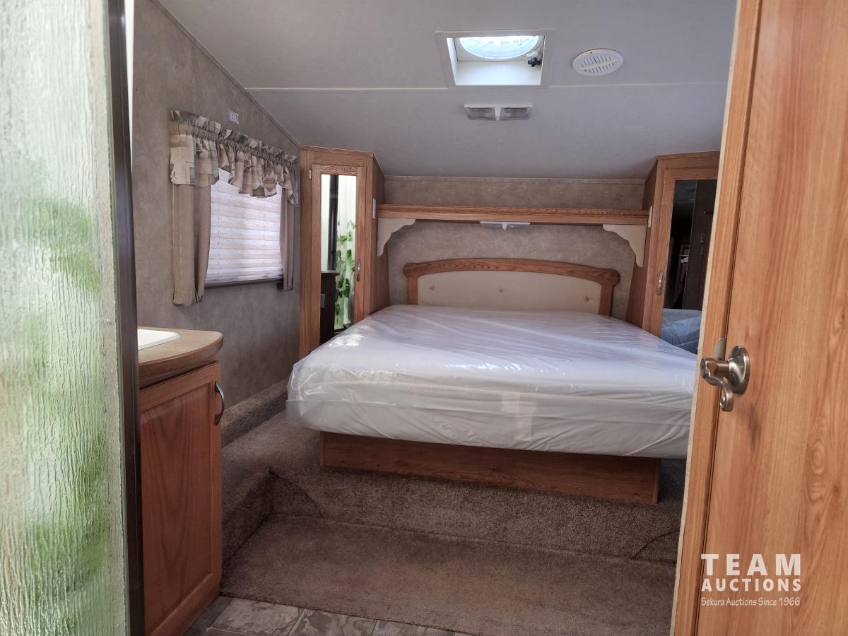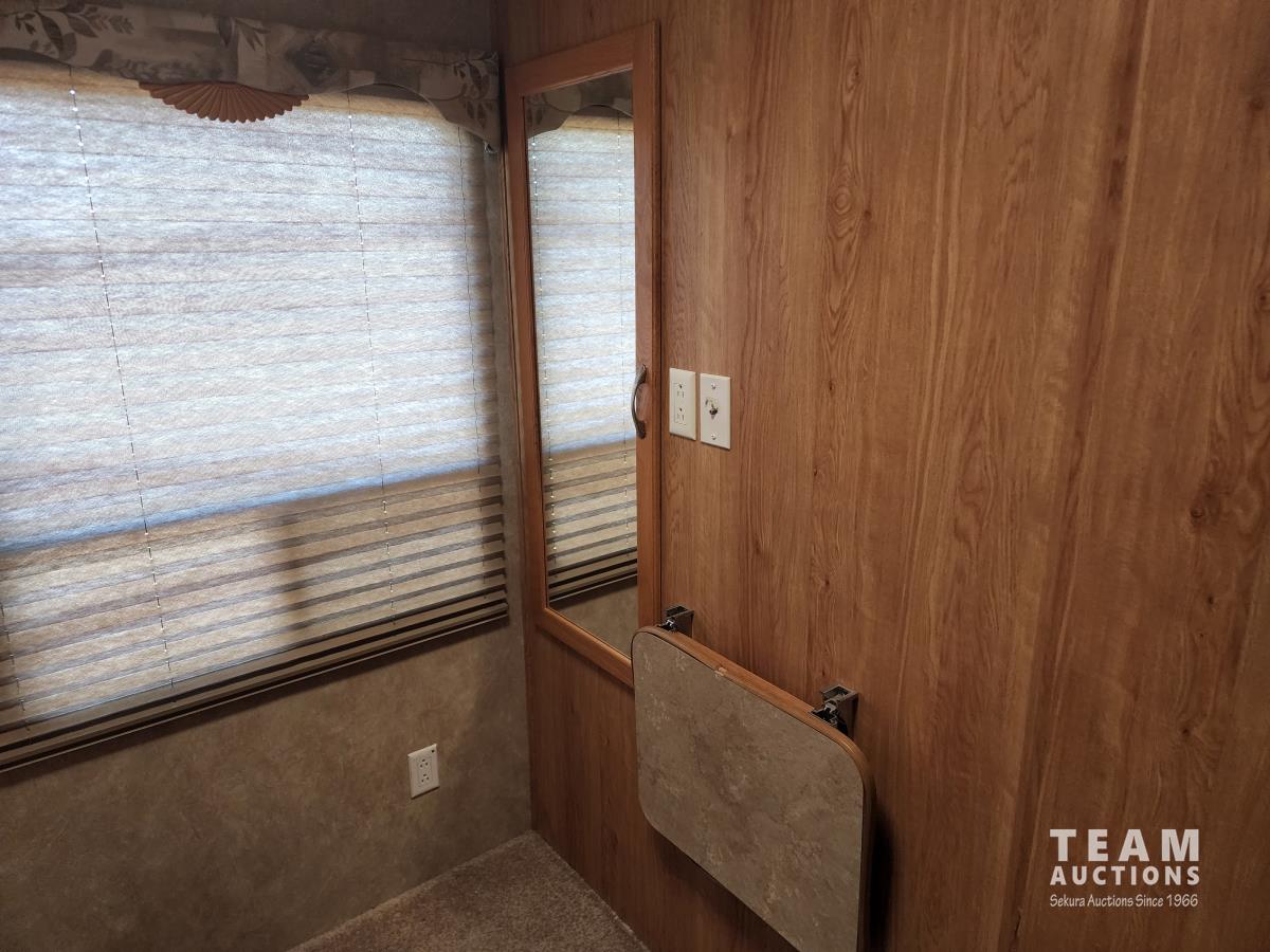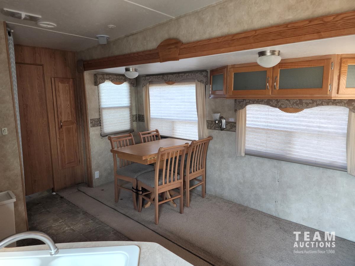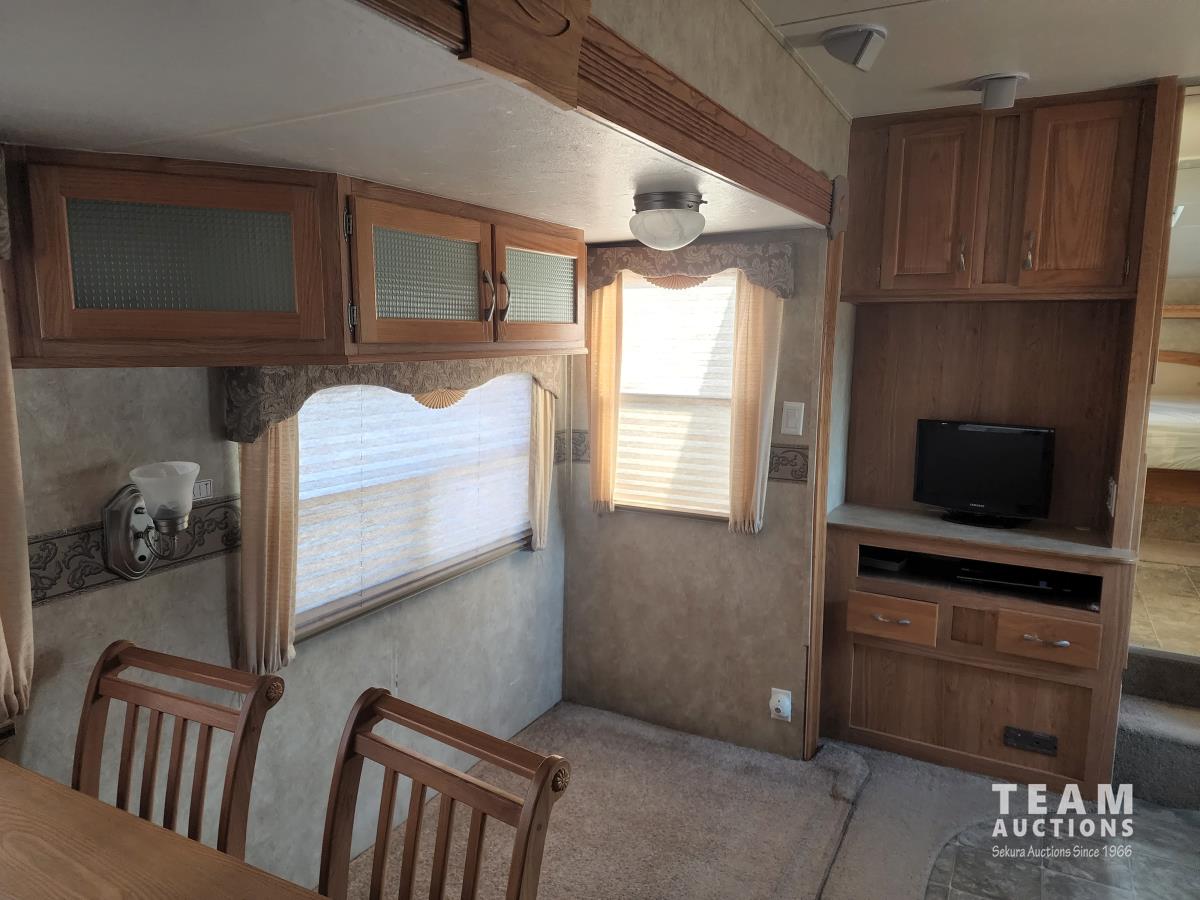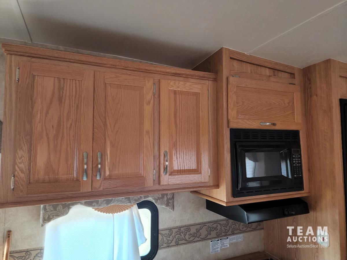 (2) slide outs, 2 bathrooms, a/c, furnace, fridge, stove, microwave, dinette, rear bunks, new mattress, fantastic fan, (2) propane bottles, front pass through storage, 225/70R15 tires