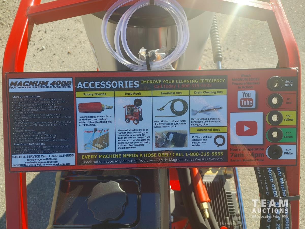 4000 PSI, 15 HP electric start gas engine, 30 ft hose wand, nozzles