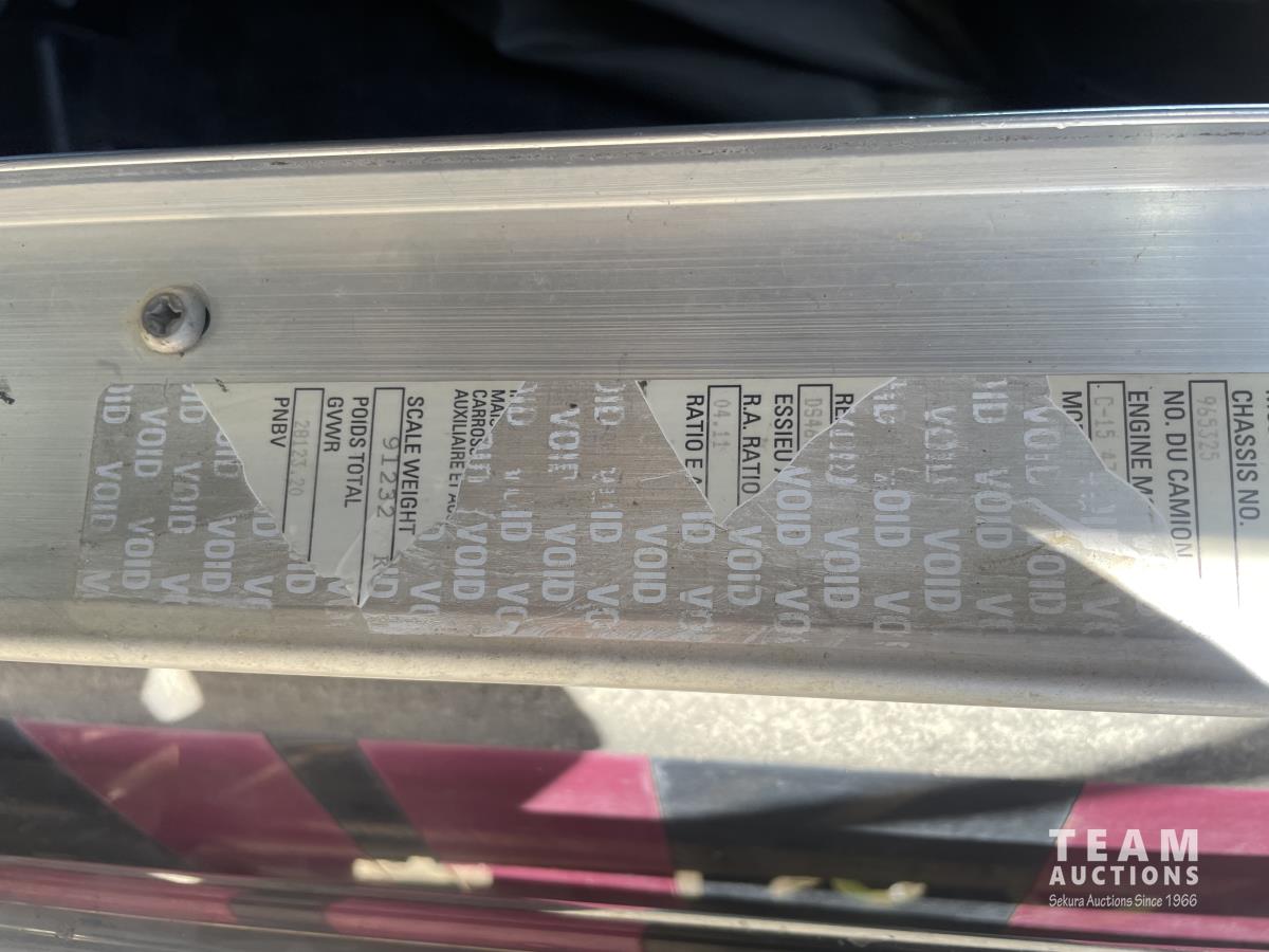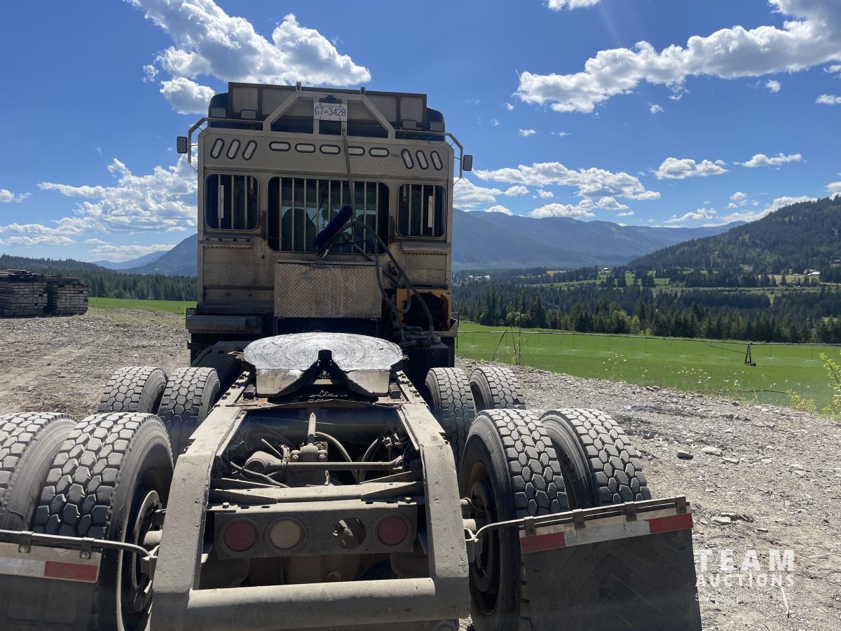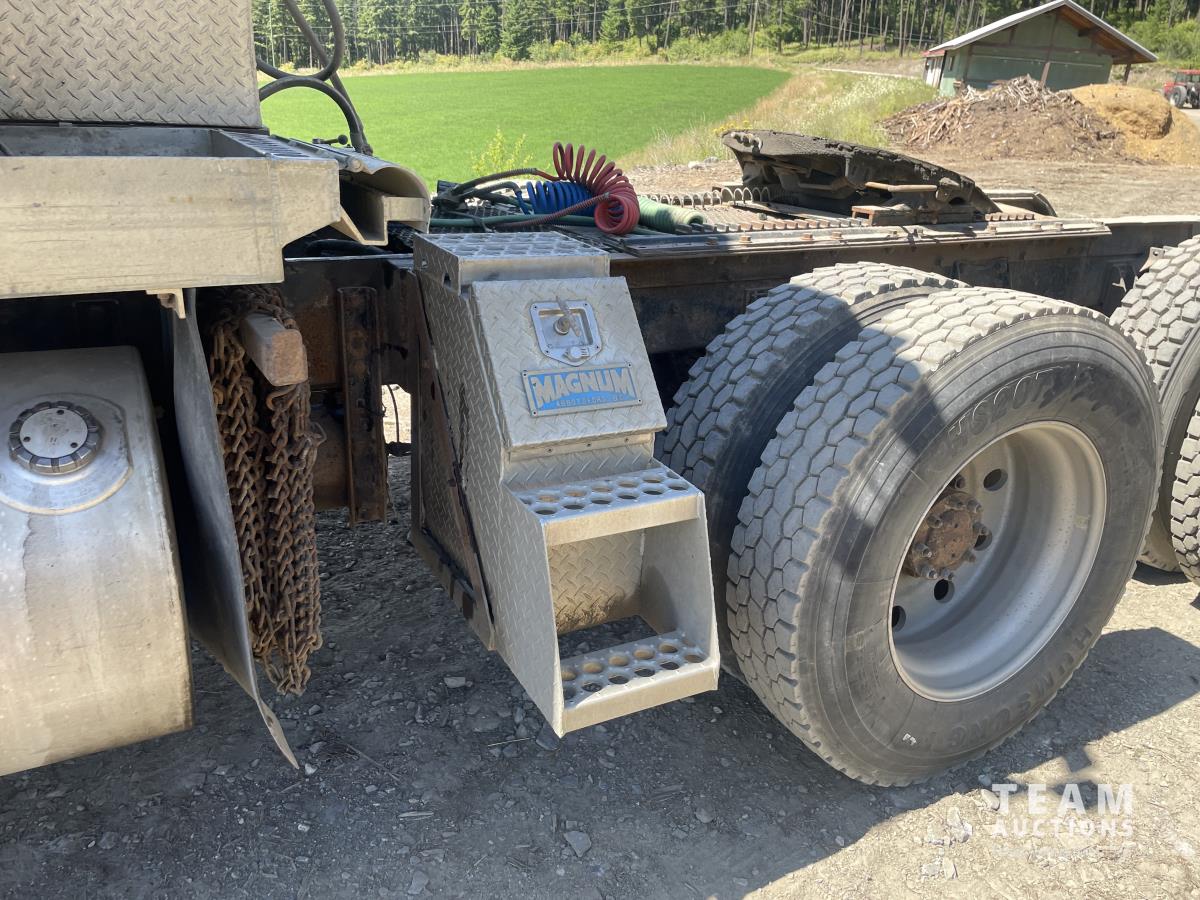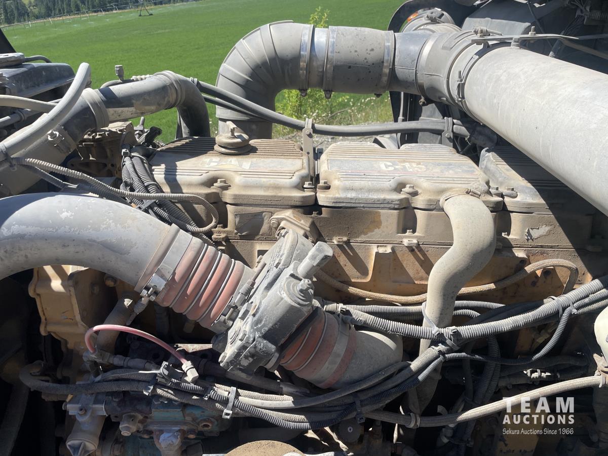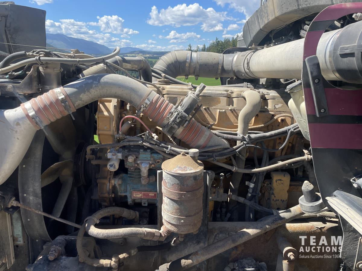 Caterpillar, s/n 6NZ, Eaton Fuller 18 speed transmission, NeWay air ride suspension, 4 way locking differential, fifth wheel slide, 20,000 lb front, 46,000 lb Eaton rears, 228 inch wheelbase, aluminum moose bumper, aluminum rims, 11R24.5