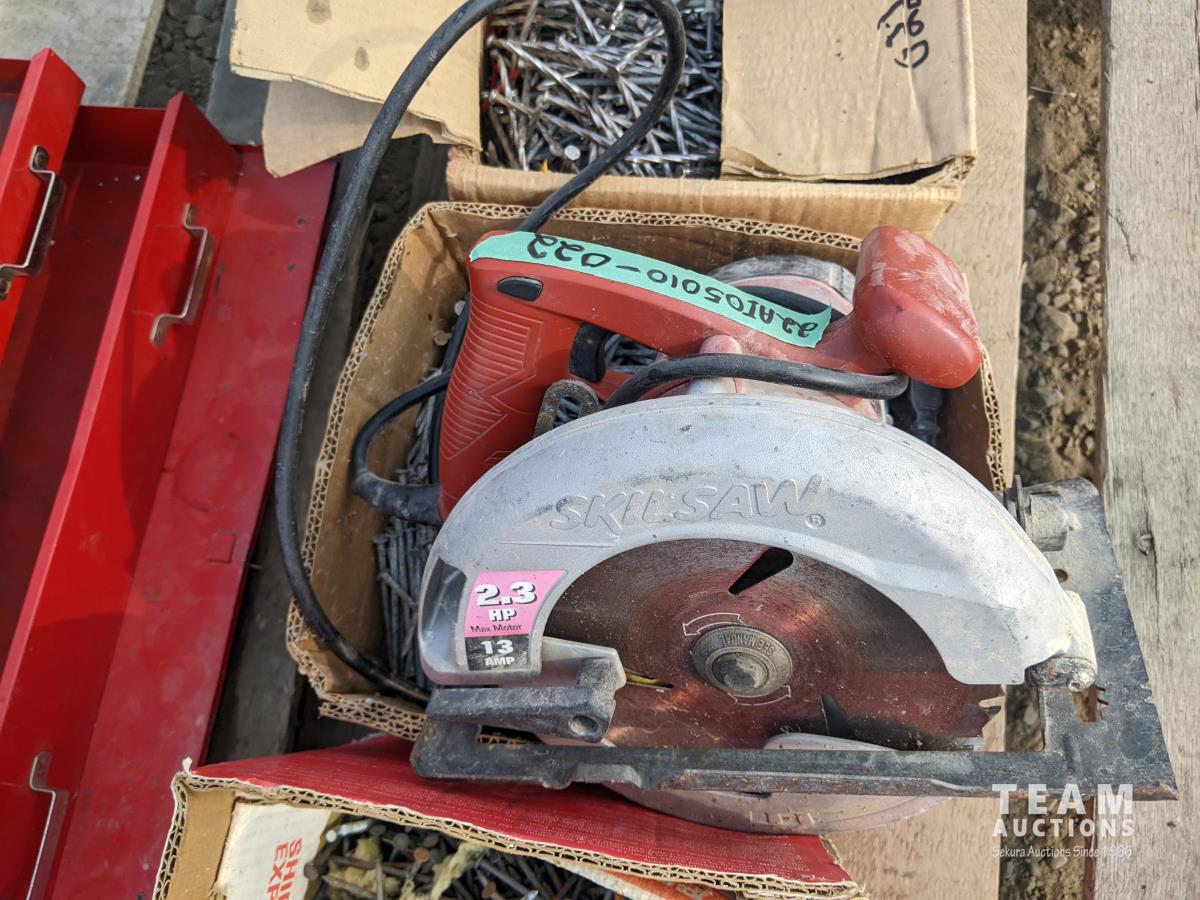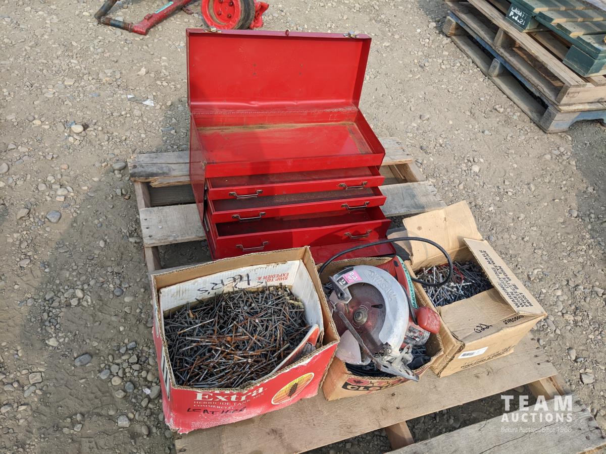 1471 Bench Tool Box, 7 /14 Inch Skil Saw and (3) Boxes of Nails