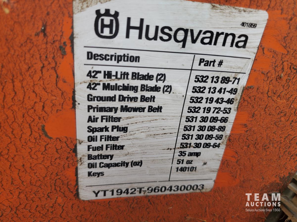 2221 Husqvarna Yt1942t Riding Lawn Mower (Inoperable)