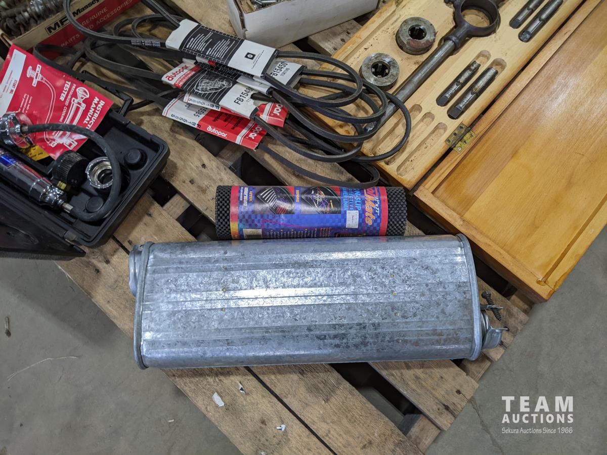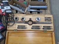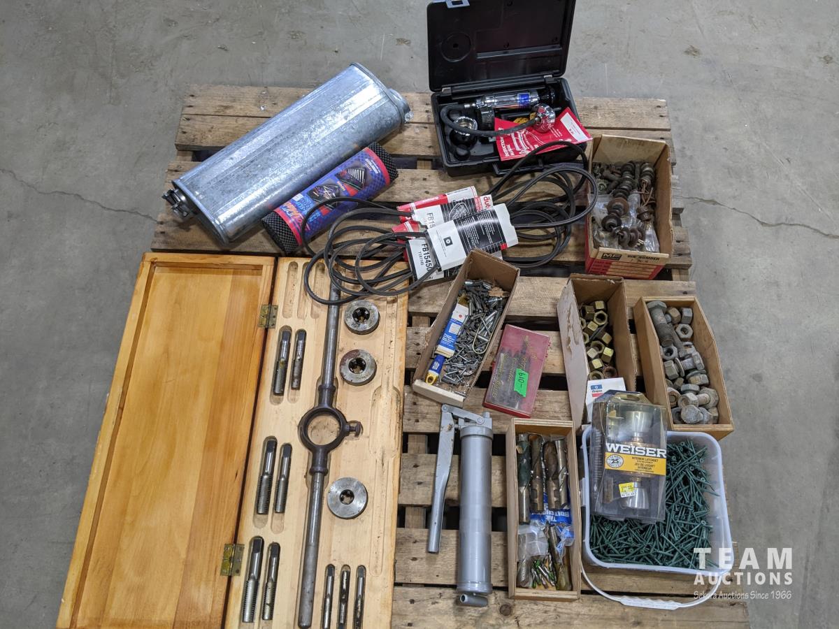 Tap and die incomplete set, assorted nuts and bolts, coolant pressure tester