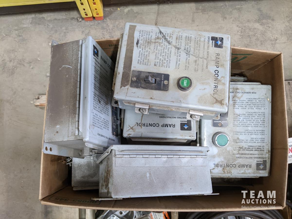 Box of ramp control boxes, gear puller, assorted bolts, welding rods