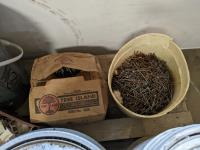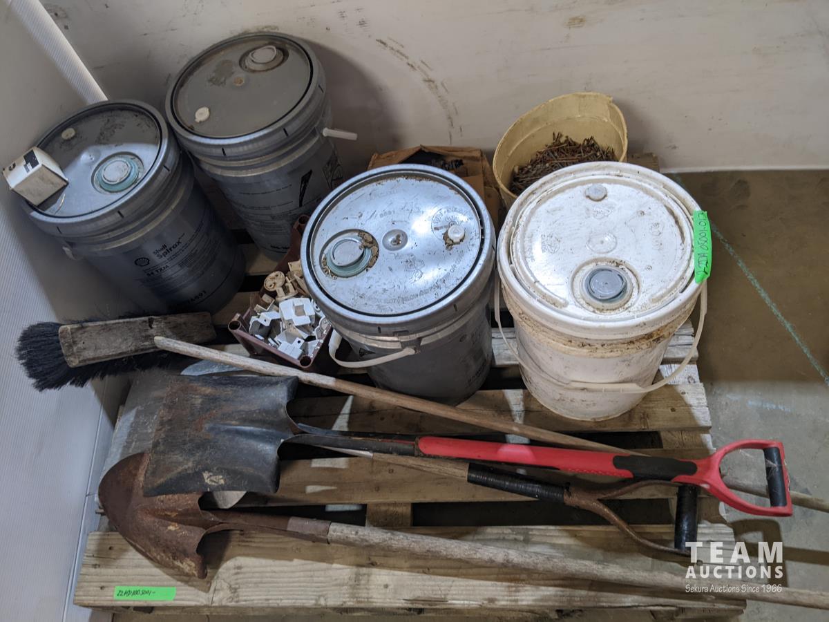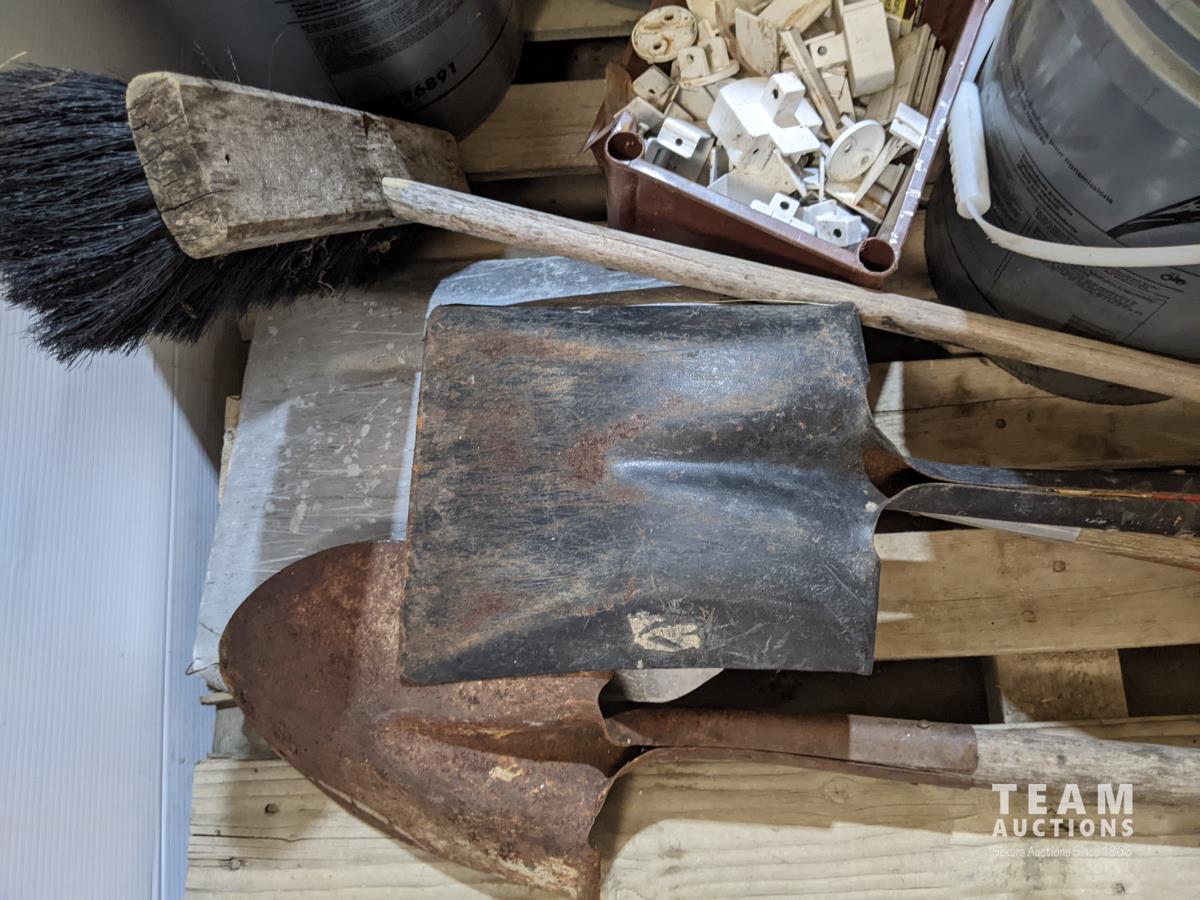 Assorted fluids, nails, shovels, broom