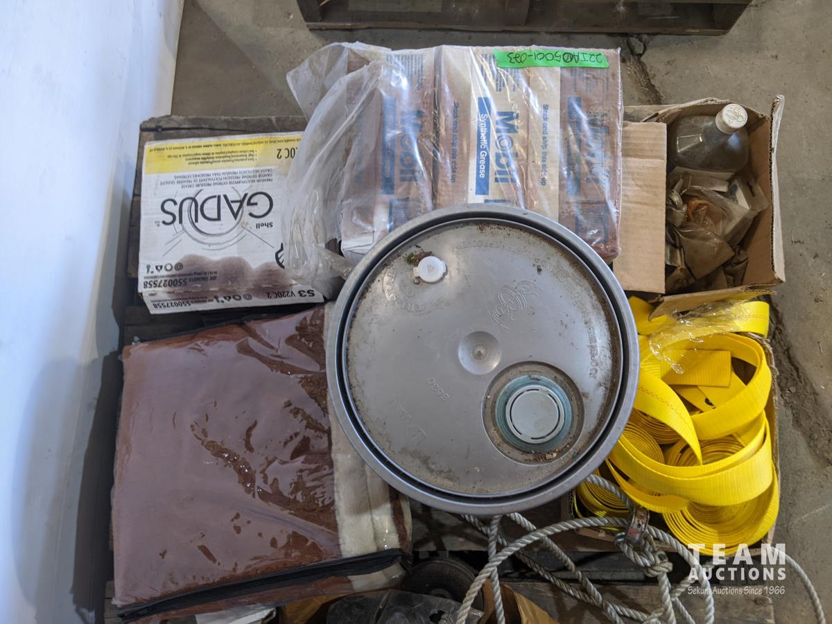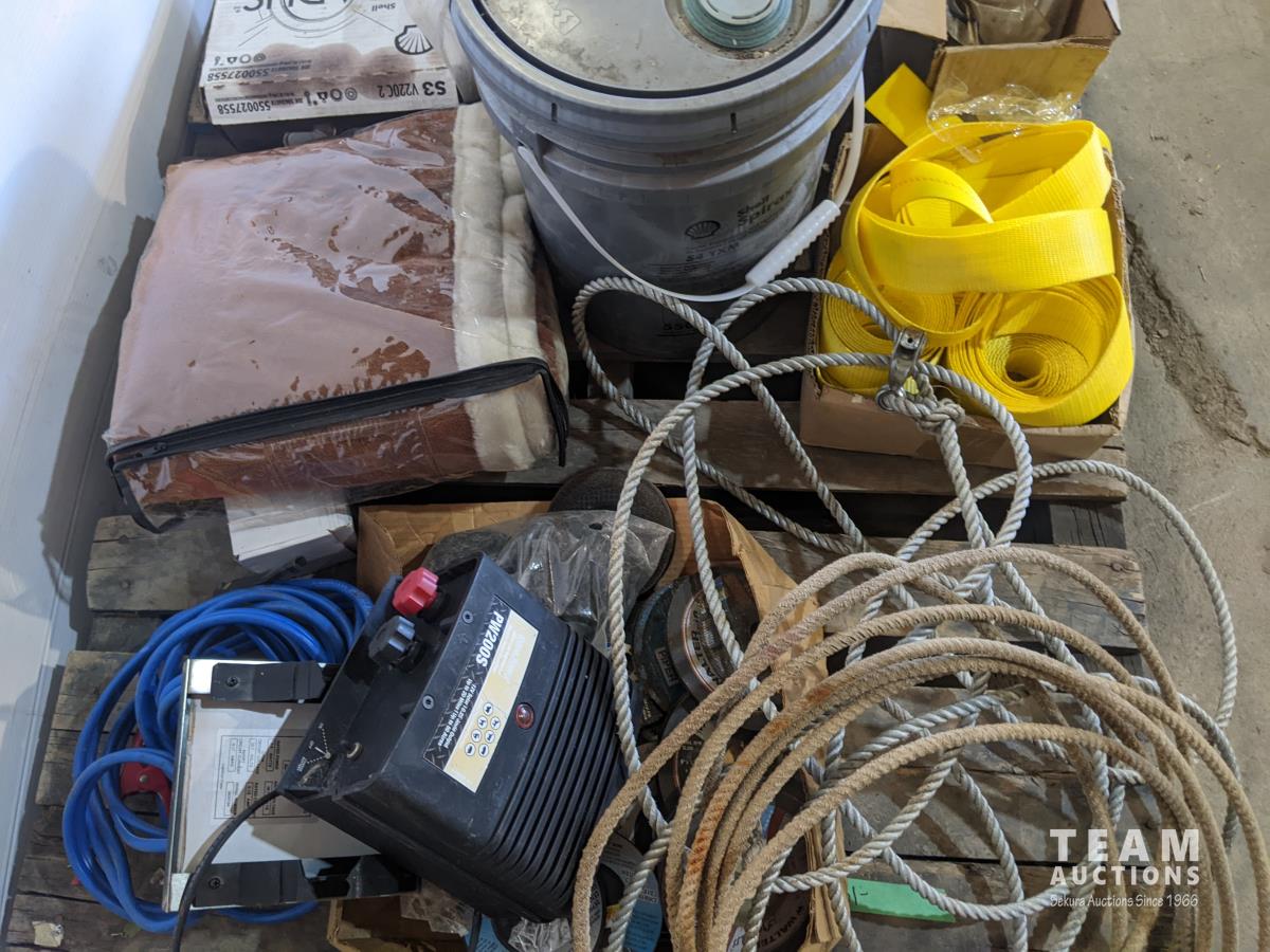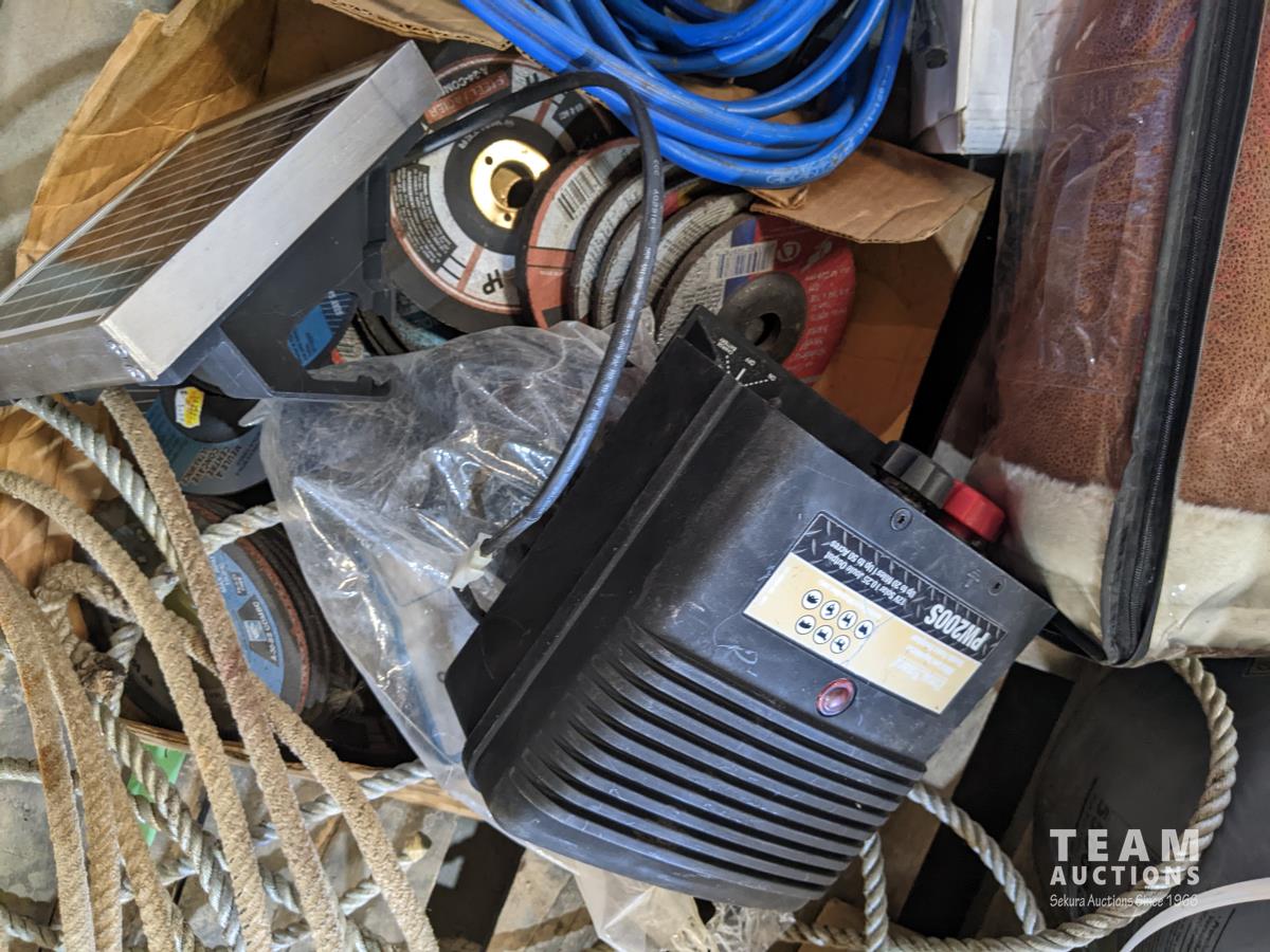 Boxes of grease tubes, jumper cable, shell S4TXM transmission and hydraulic oil, solar fence electrifier, nylon strapping, angle grinder discs, ropes