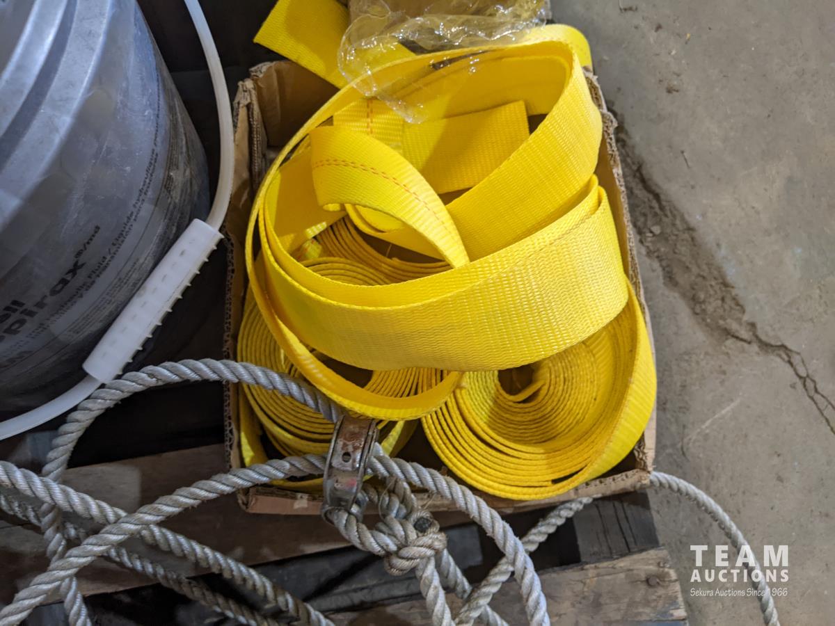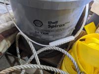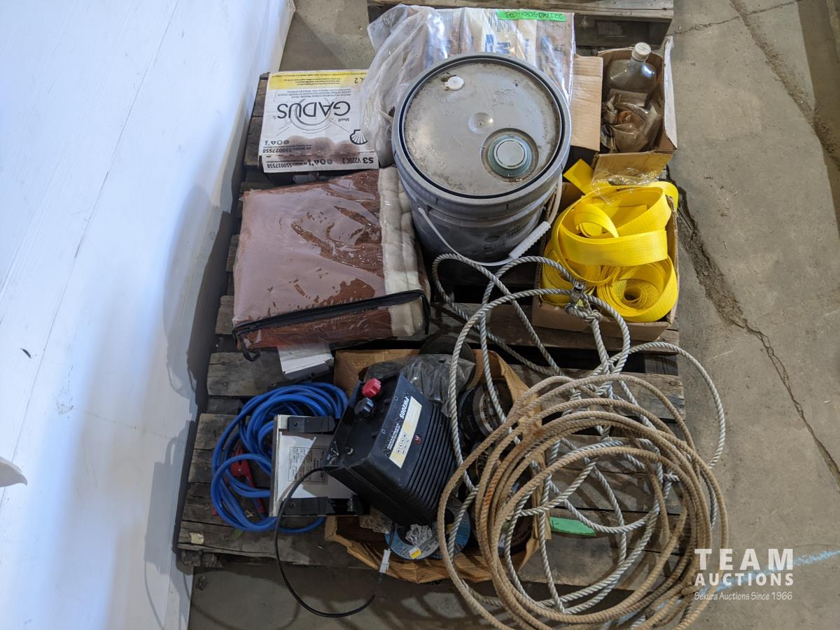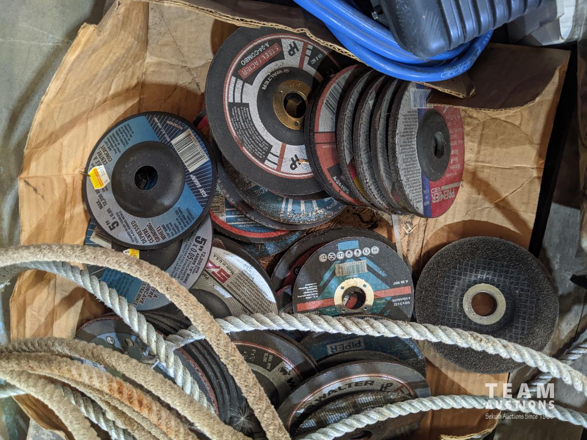 Boxes of grease tubes, jumper cable, shell S4TXM transmission and hydraulic oil, solar fence electrifier, nylon strapping, angle grinder discs, ropes