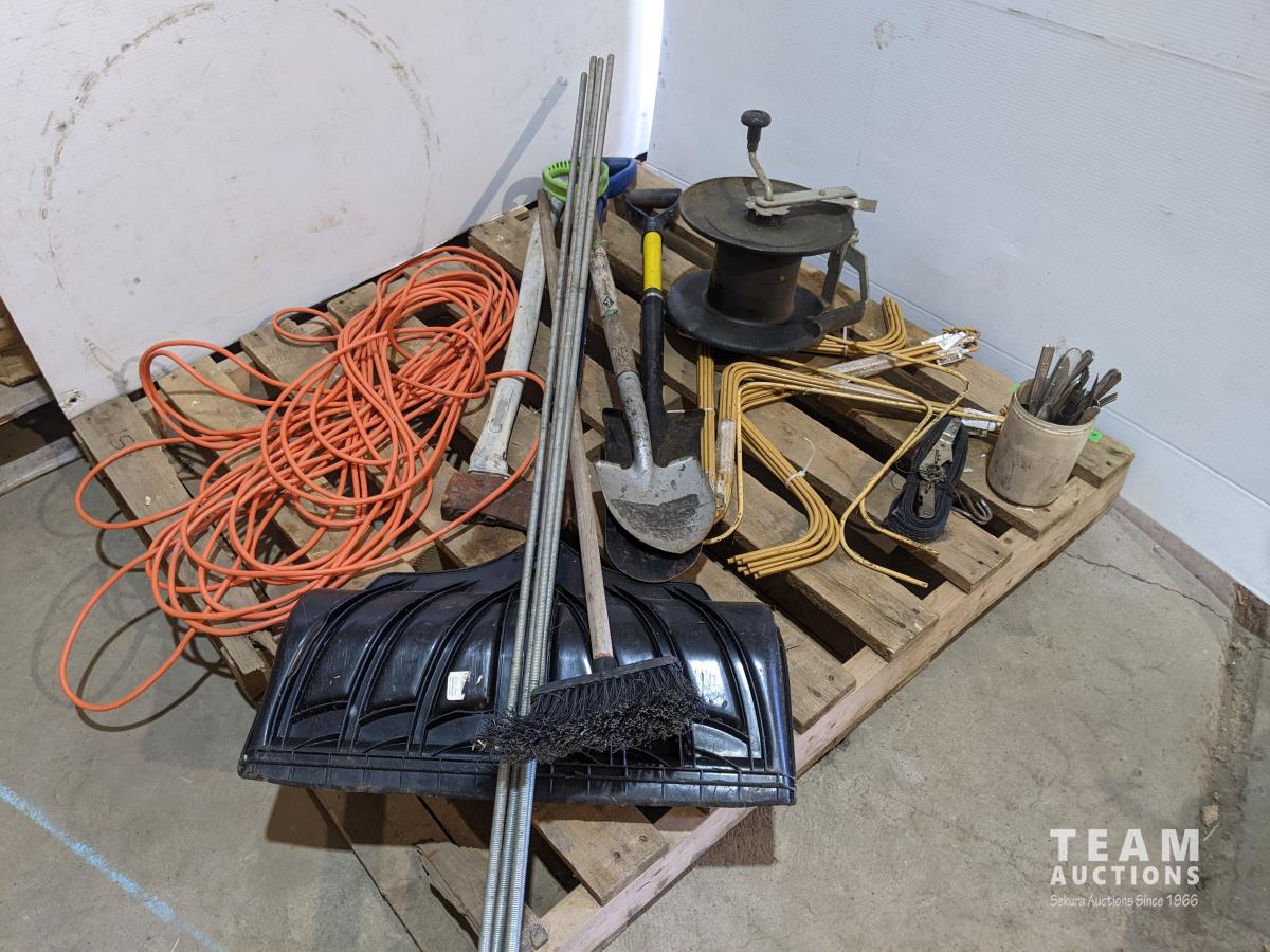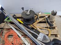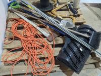 Shovels, ready rod, hay rake, parts, axe, extension cord