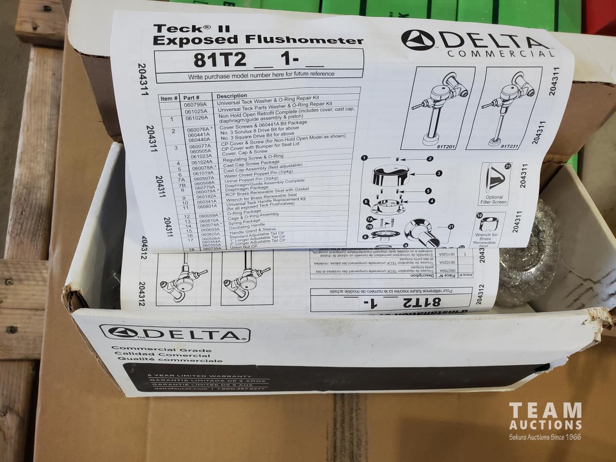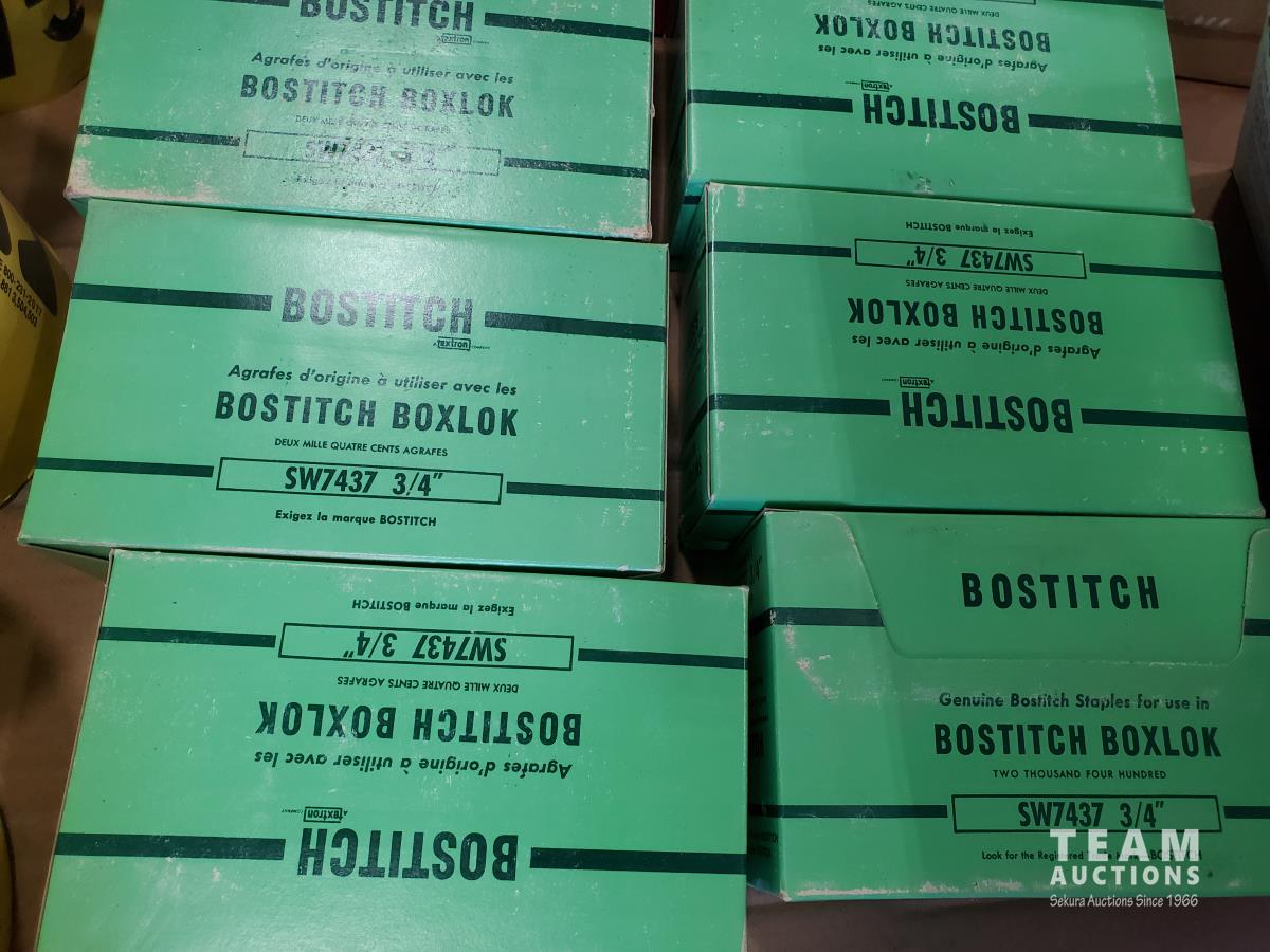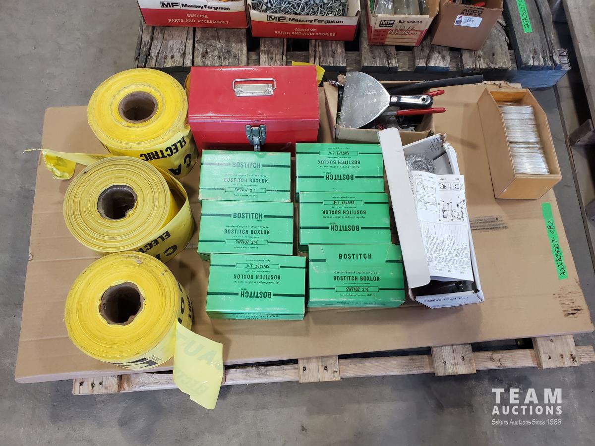Bostitch 3/4 staples, caution tape, Delta exposed flushometer, box of miscellaneous