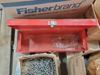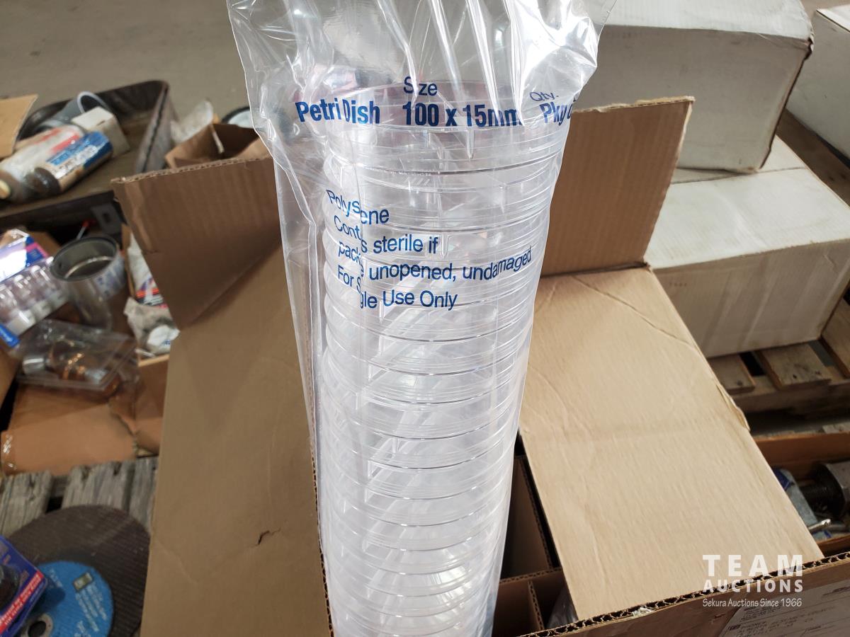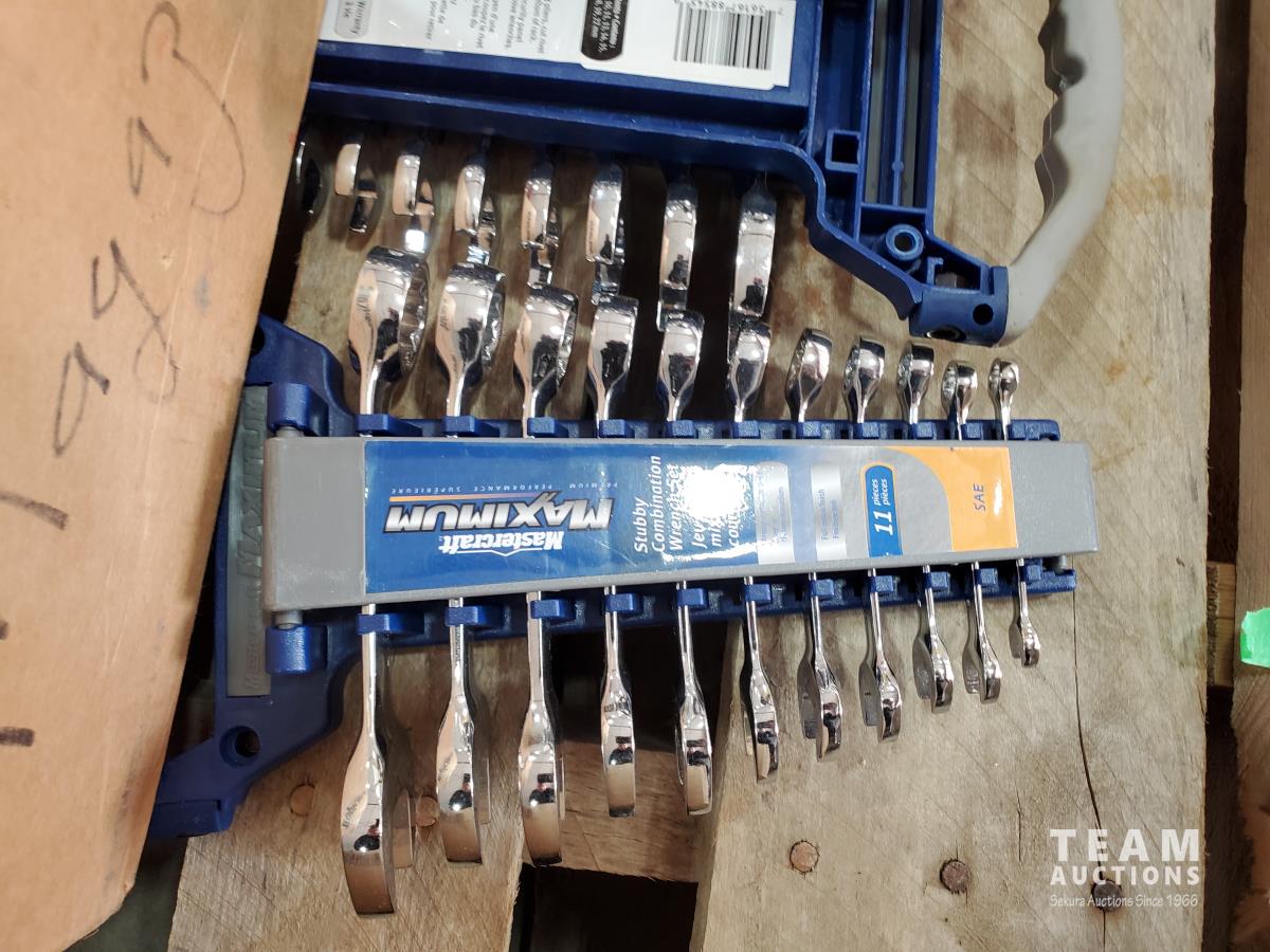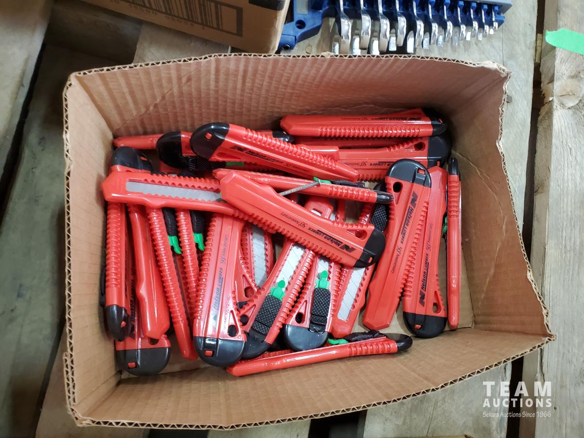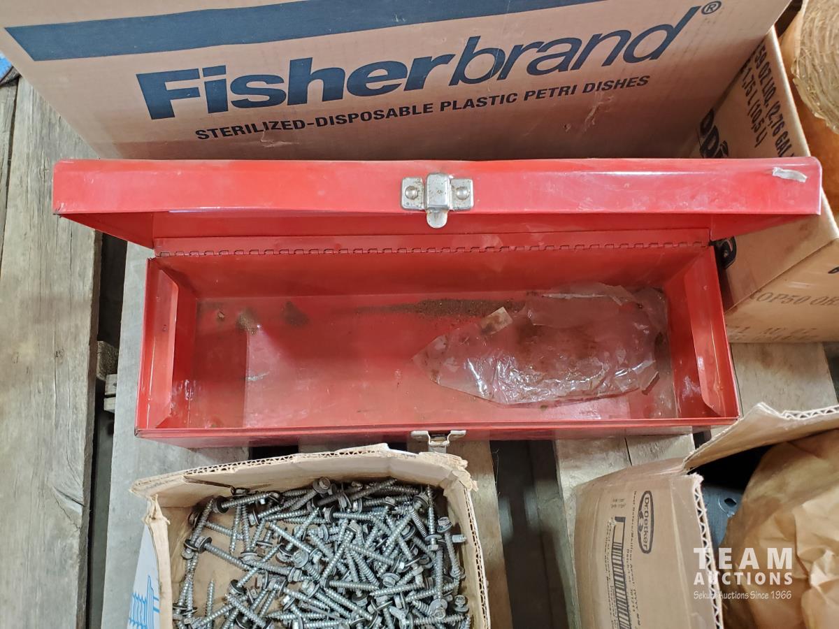 Petri dishes, mastercraft wrench sets, knives, roofing nails, screws, tool box
