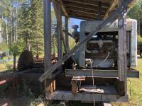 Hercules 6 cylinder gas engine (recently rebuilt), (2) hydraulic motors, 32 ft lumber conveyor w/ kick off and belt, 13 ft trolly w/ hydraulic/cable log roller operated with tracks, foot operated, new hydraulic motor, 46 inch saw, 14-1/2 inch belt