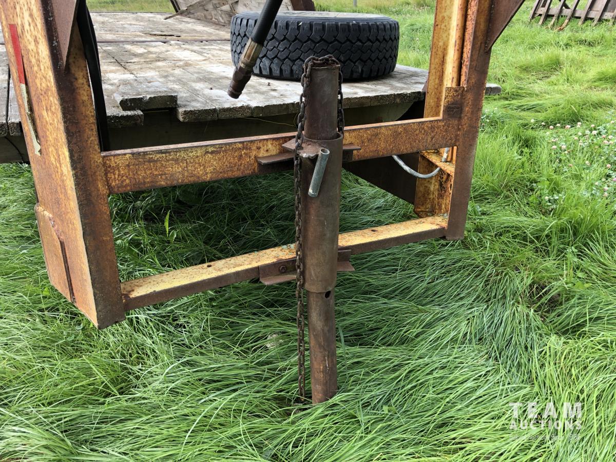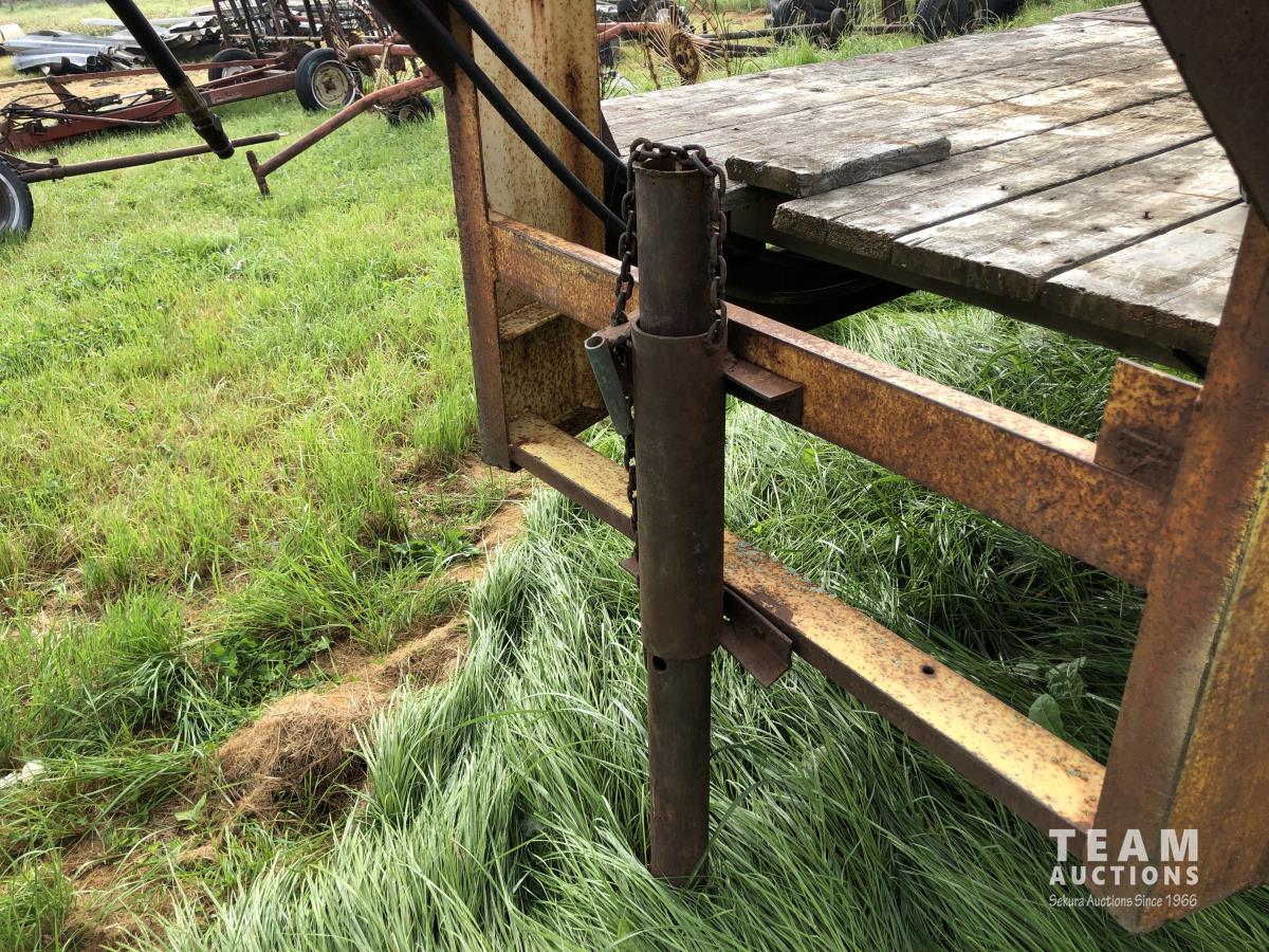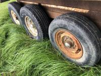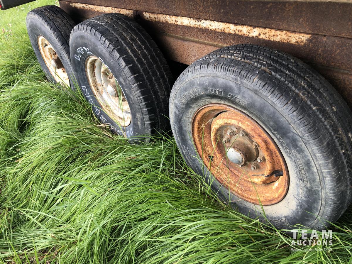 8 ft wide, 8 bolt axles, king pin, 12 ft sides for wood box, hoist with remote hydraulic connectors, stake pockets, 265/75R16, 245/75R16 & 235/85R16 tires