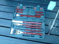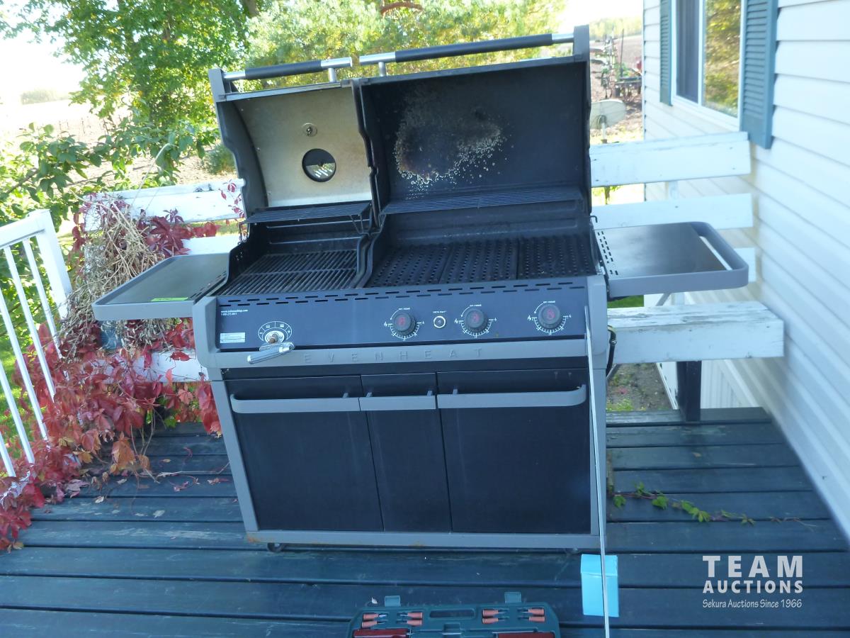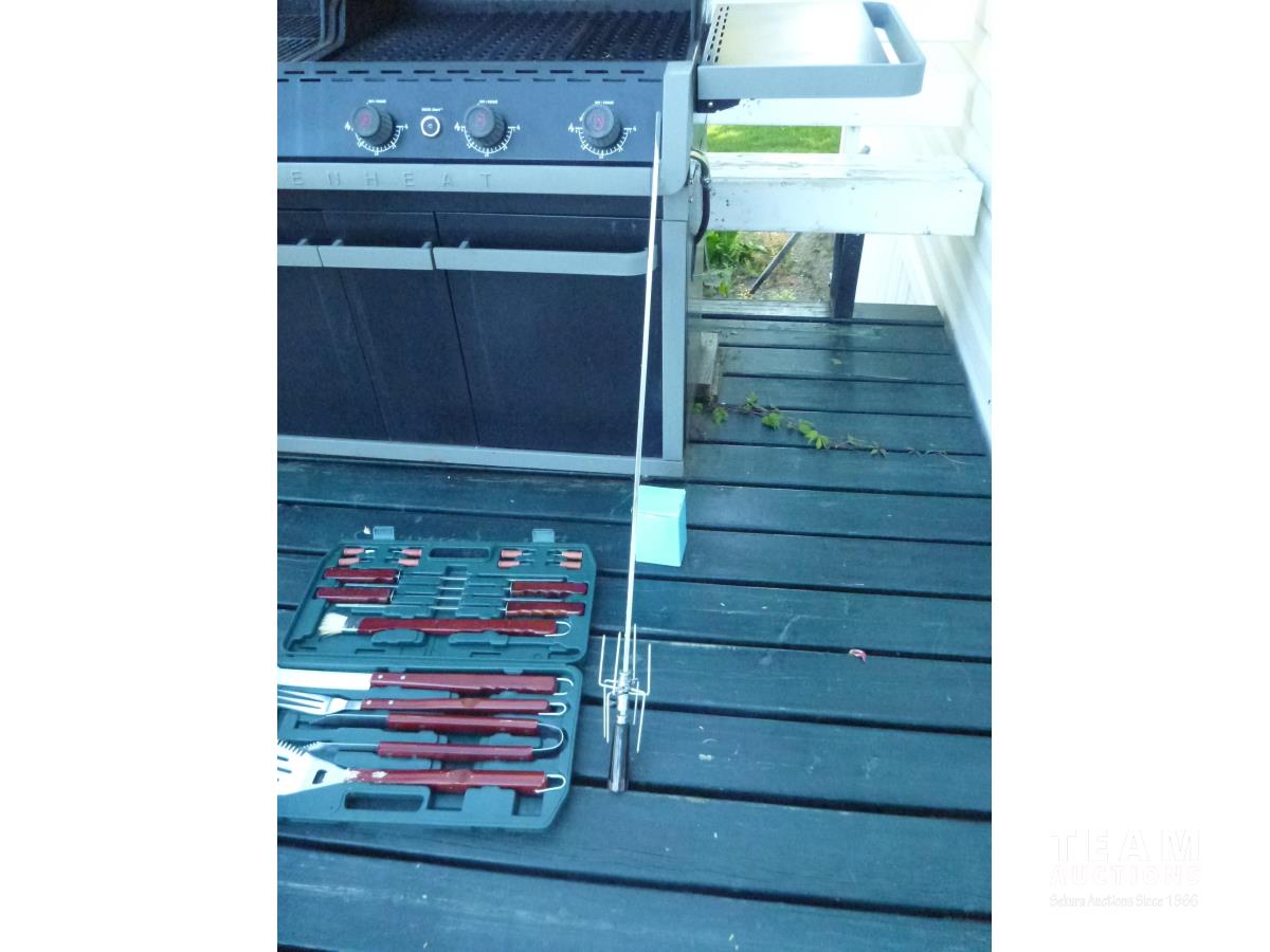 One side propane 3 burner, other side a briquette BBQ, rotisserie, BBQ utensil set, 20 lb propane bottle