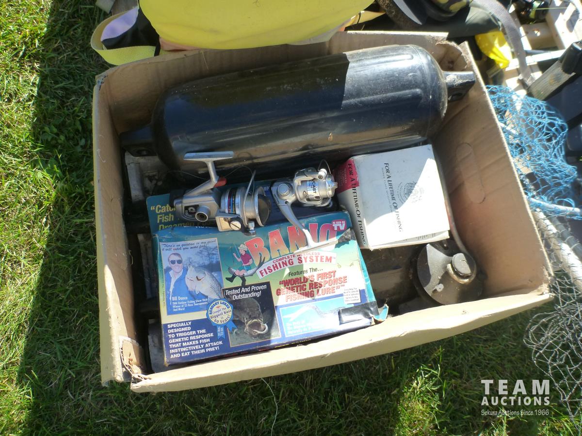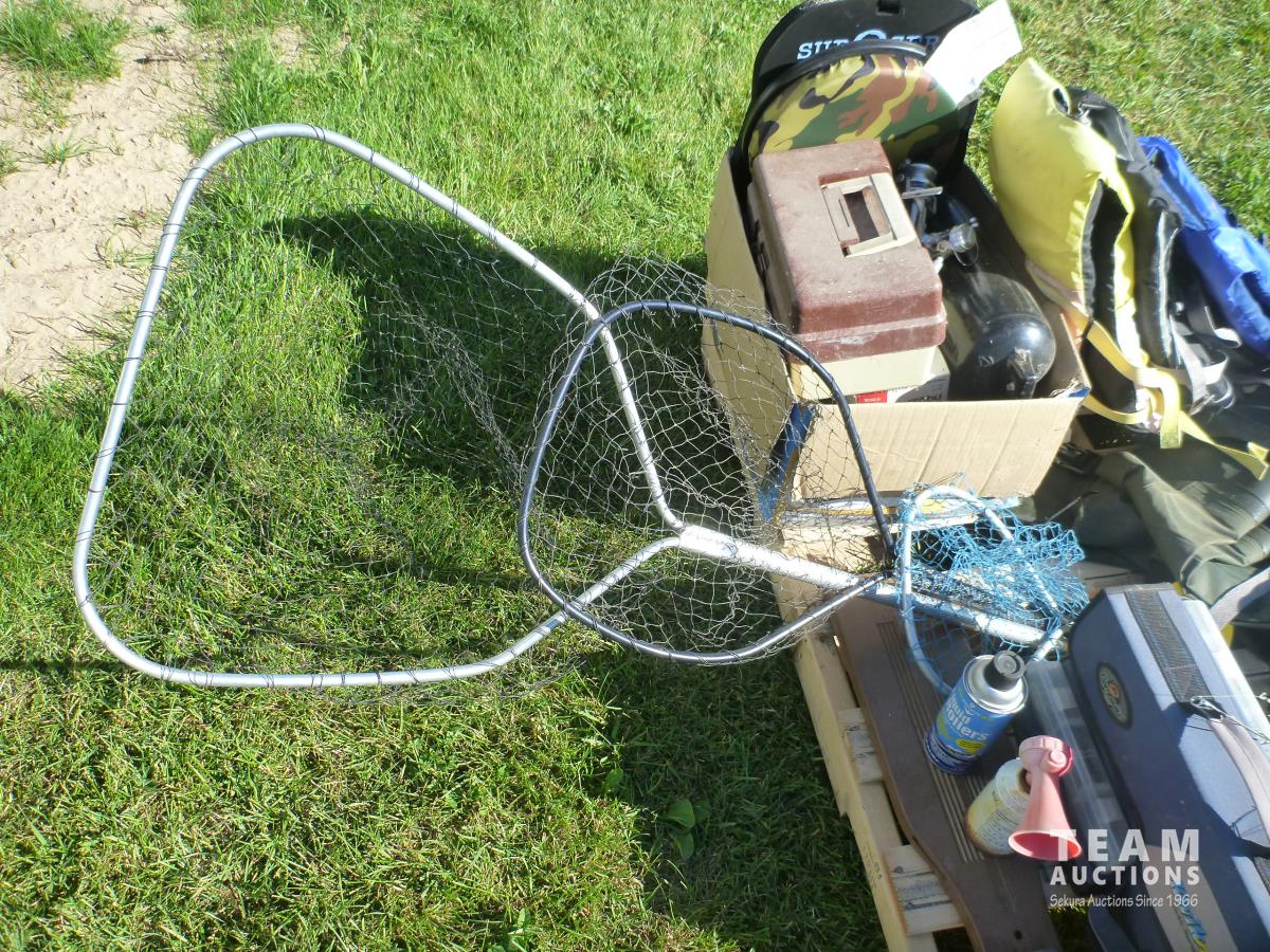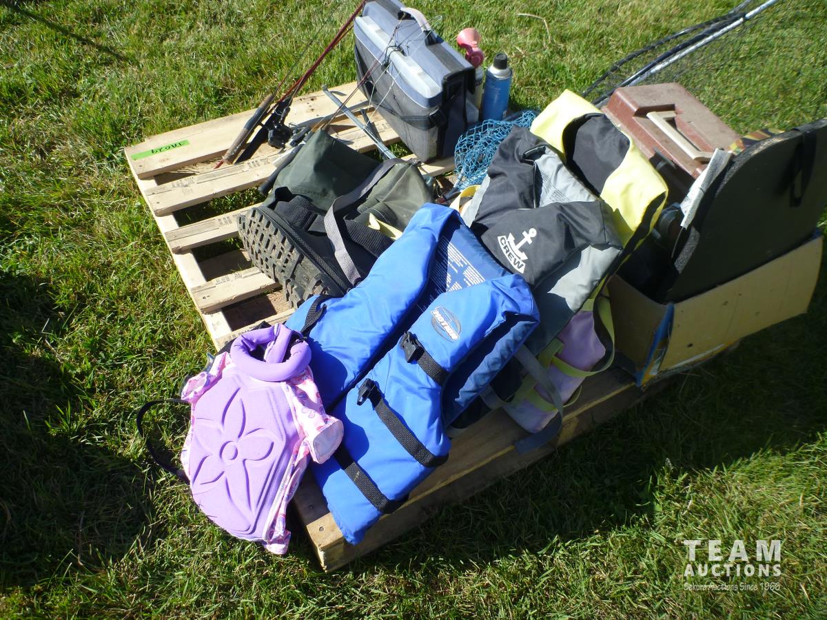 Tackle boxes, fish nets, hip waders, life jackets, fishing rods. etc