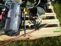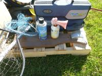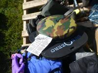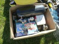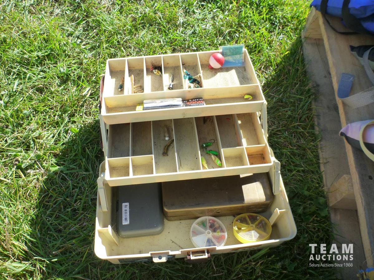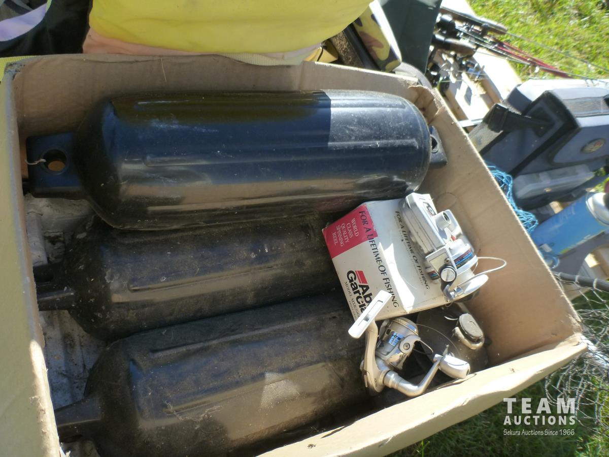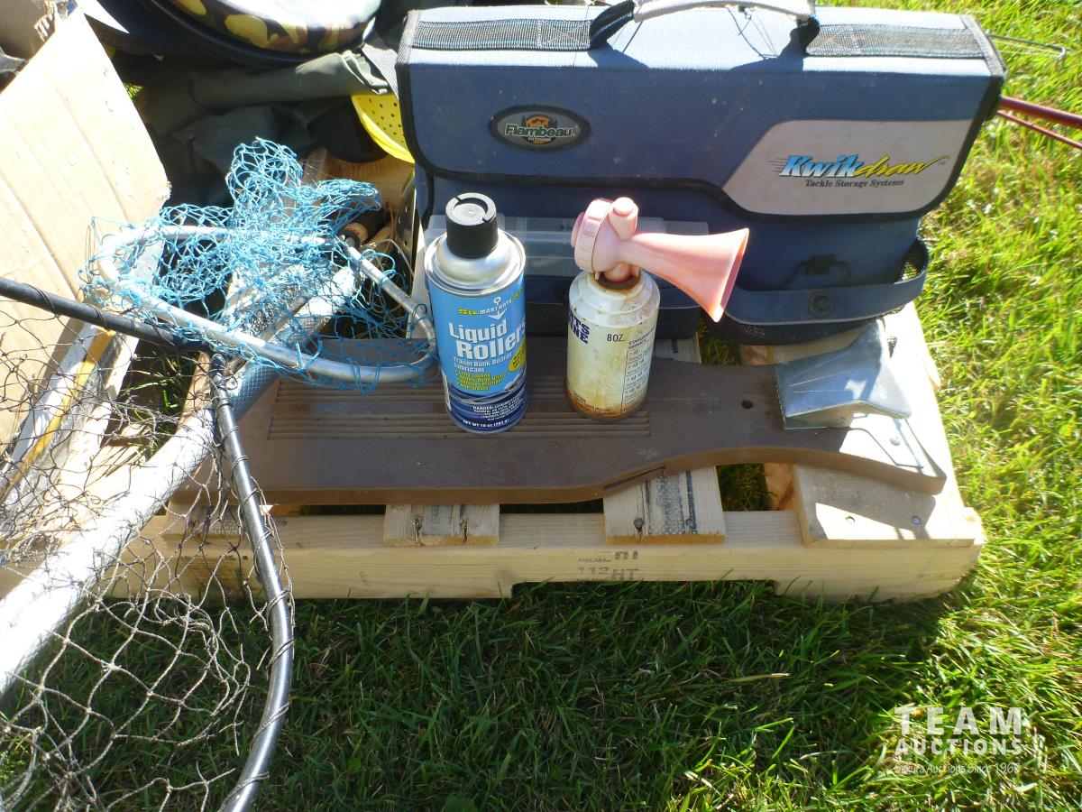 Tackle boxes, fish nets, hip waders, life jackets, fishing rods. etc