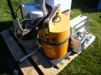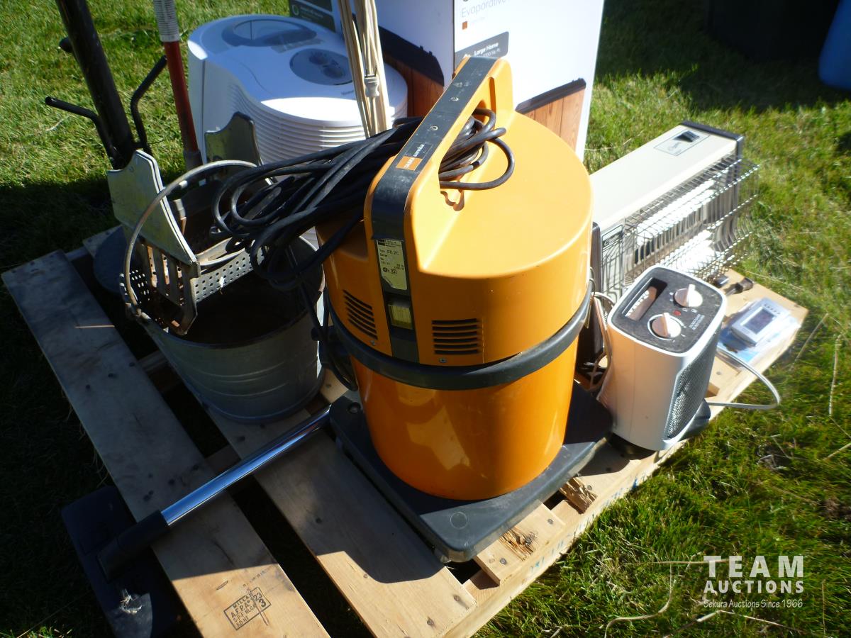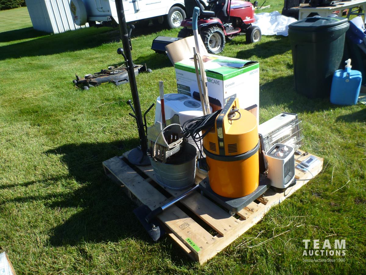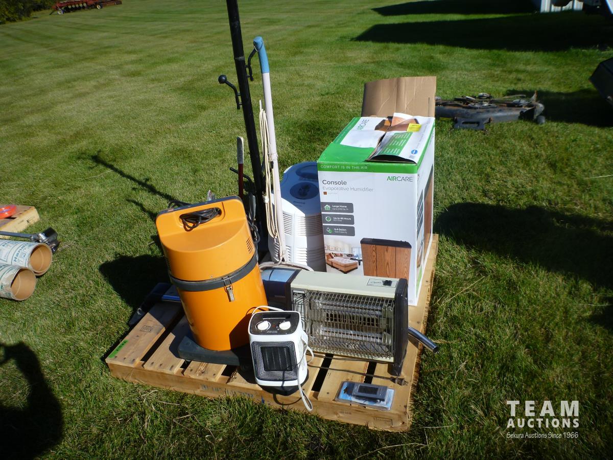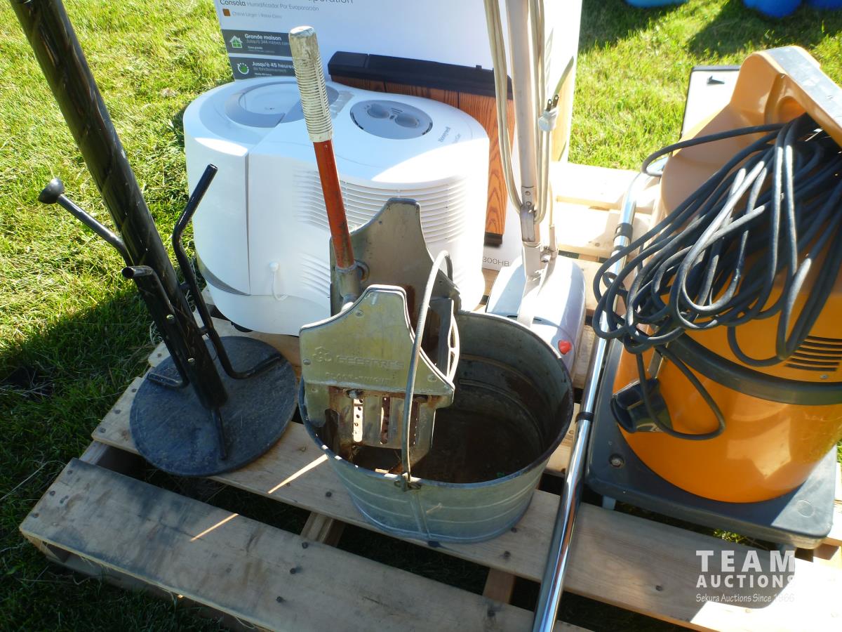 Taskisamba shop vac, (2) humidifiers, space heaters, polisher, floor mop pail, coat rack