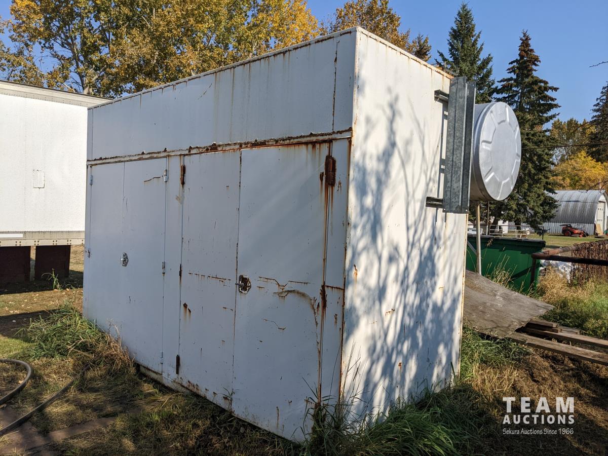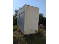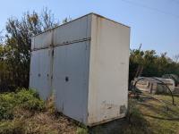140" wide X 58" deep X 96" high, doors on both sides with some shelving