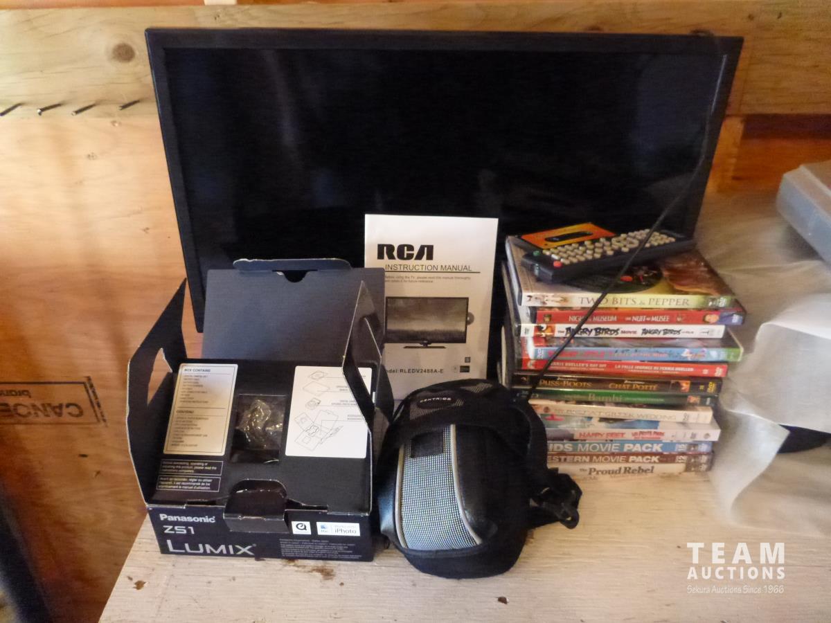 Flat screen TV, ice maker, DVD's cleaning supplies, speakers, etc.