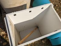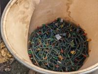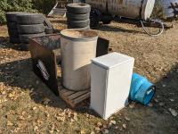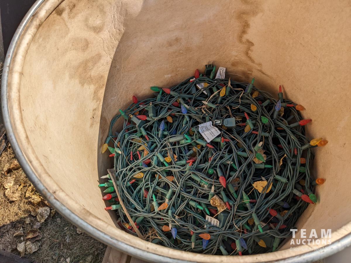 Barrel of Christmas lights, metal shield, Well Rite pressure tank, small cabinet
