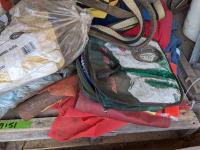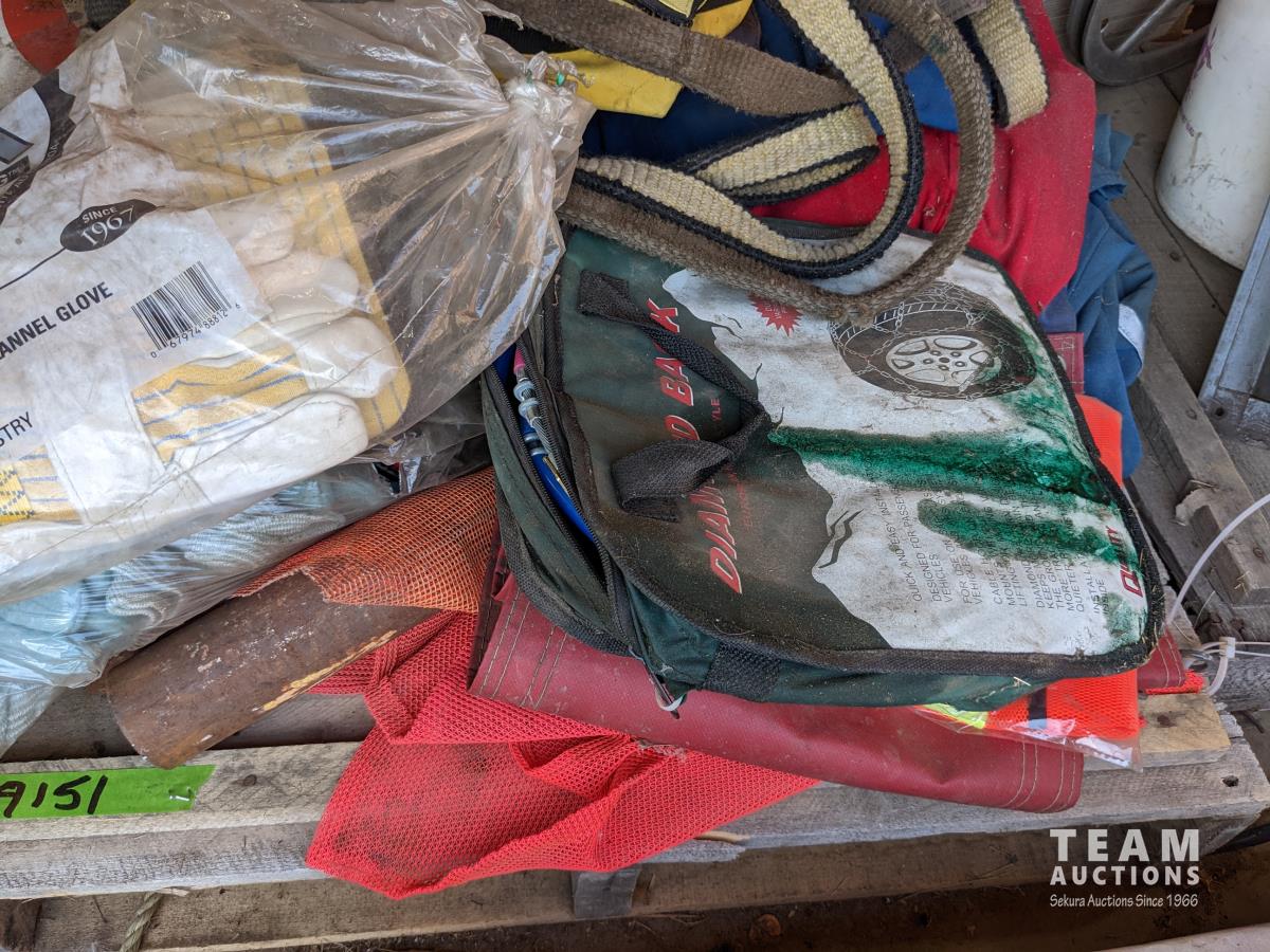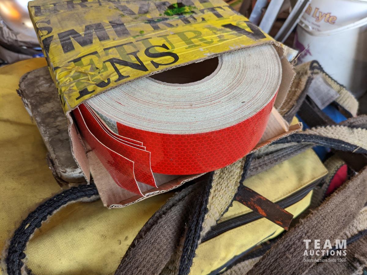 leather & cotton gloves, cable ties, chains, DOT roll of reflective tape, wide load sign & flags, safety vest, spill kit, welding helmet, welding gloves, coveralls