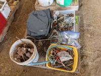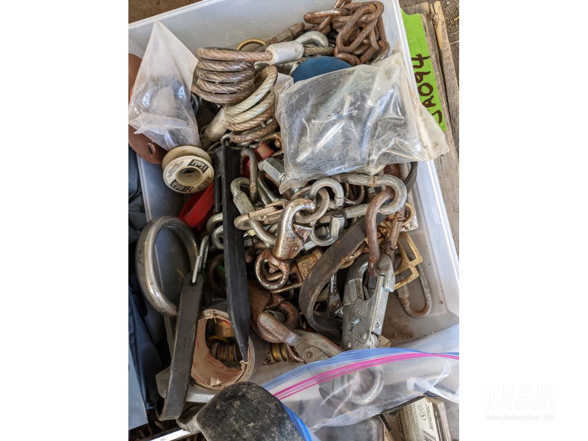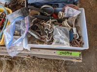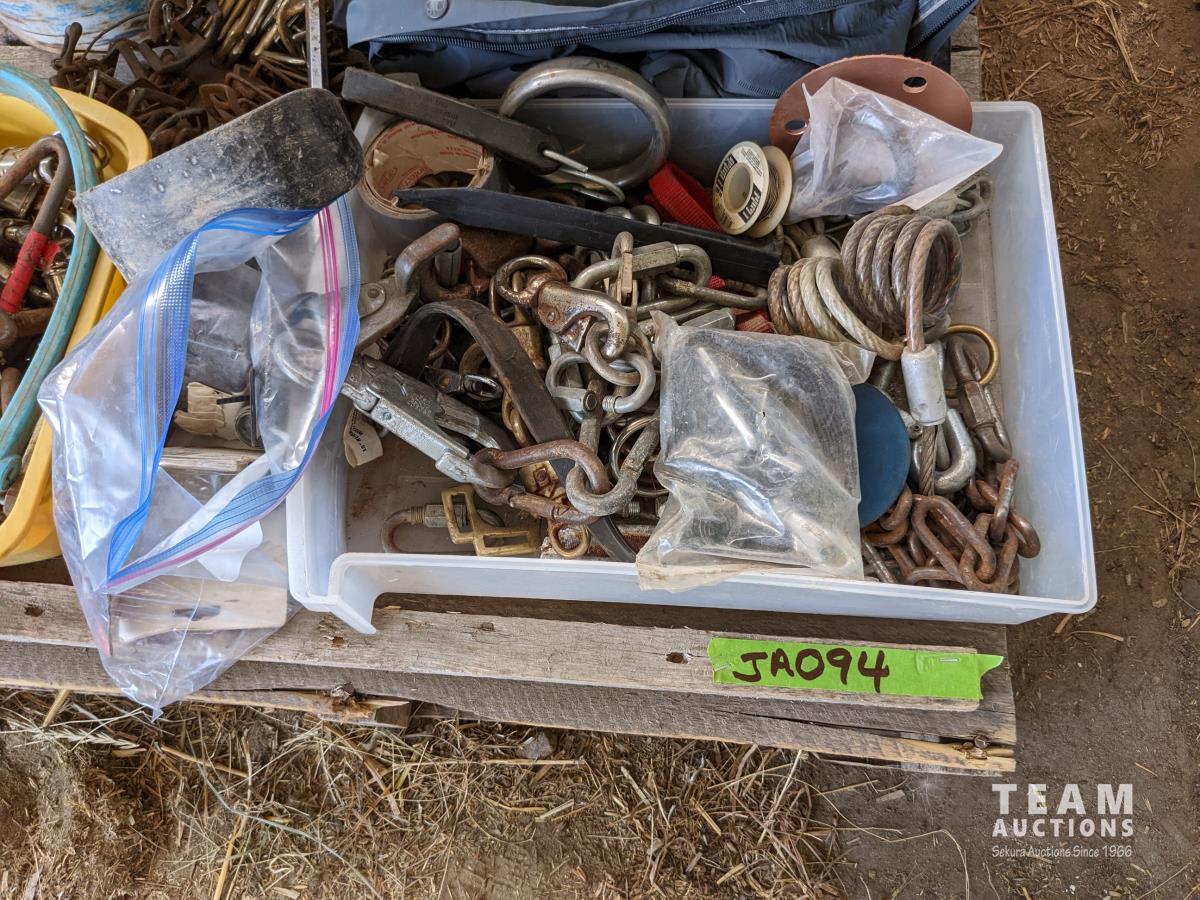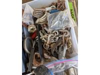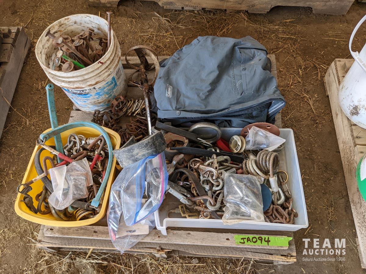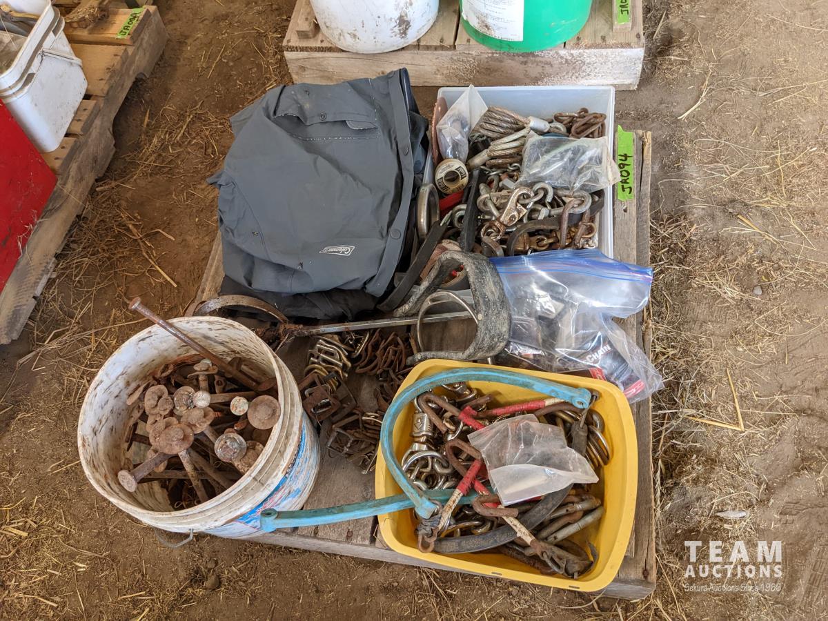 Pins, quick links, eye bolts with rings, hair snaps, buckles, (2) rain coats, miscellaneous hardware