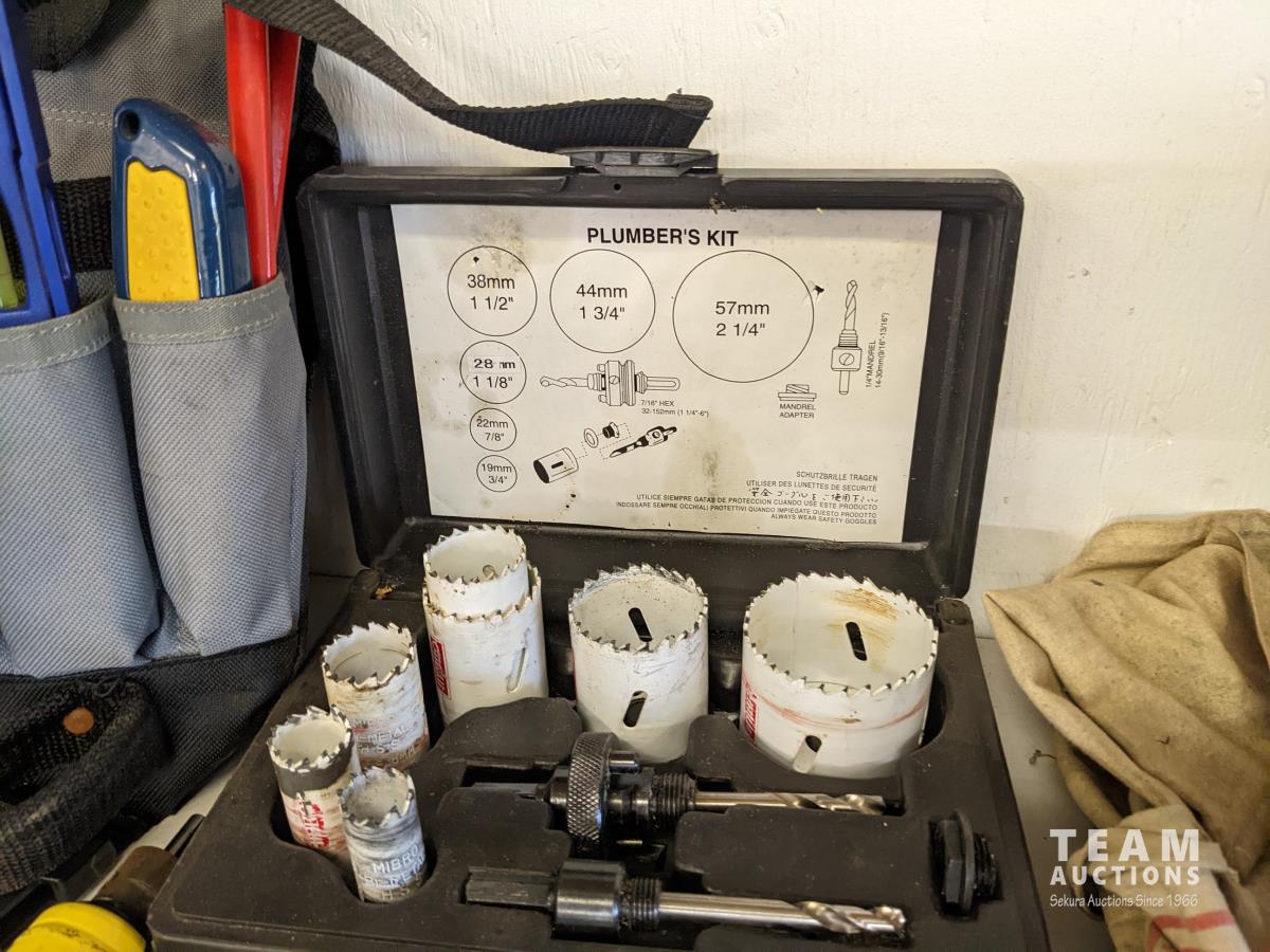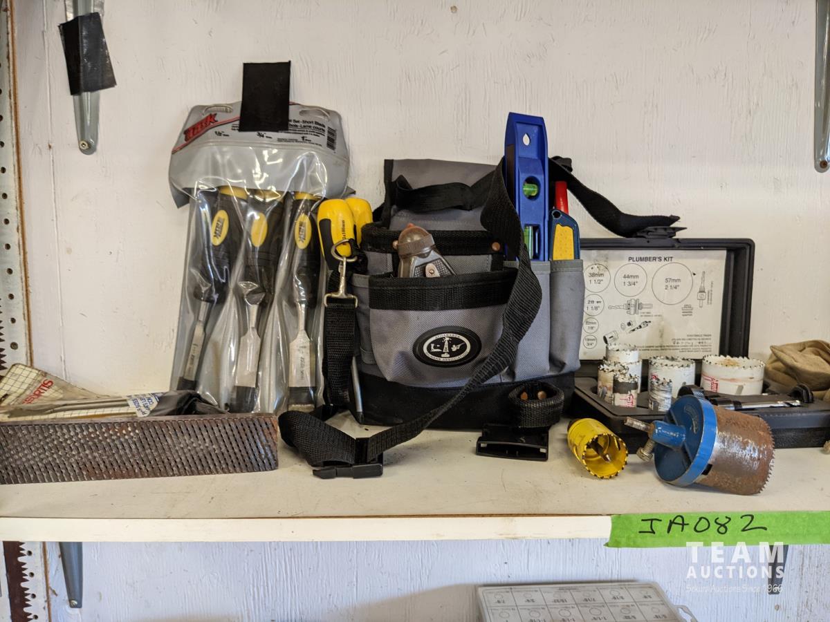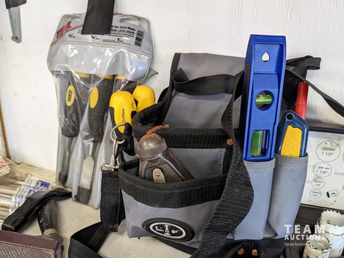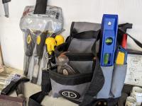 Squares, Dremel, carpenters belt, wood chiesels, hand plane, hole saws