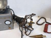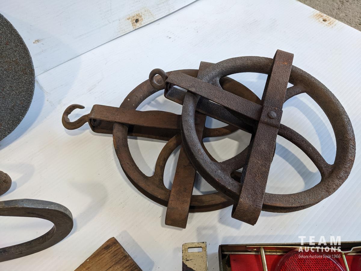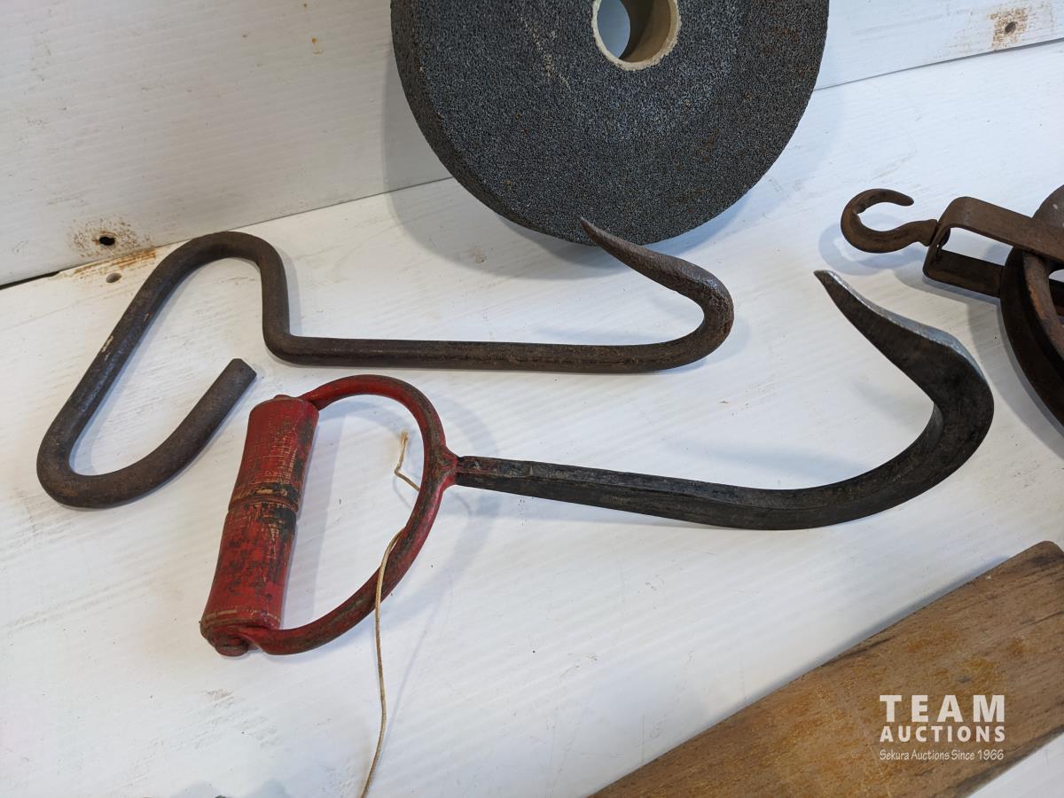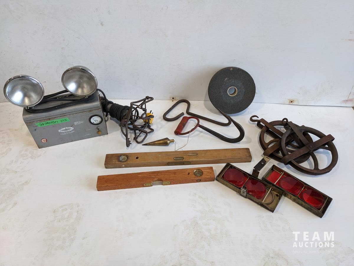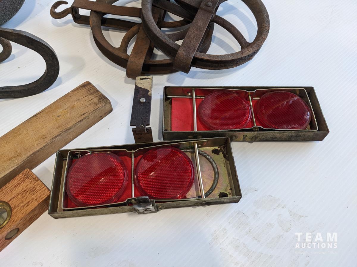 Bale hooks, emergency light, electric branding iron, (2) pulleys, plumb bob, levels