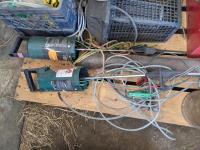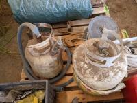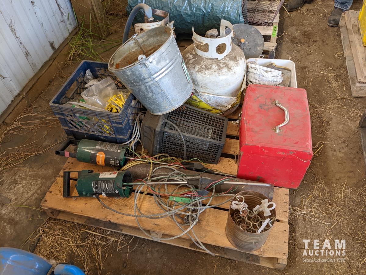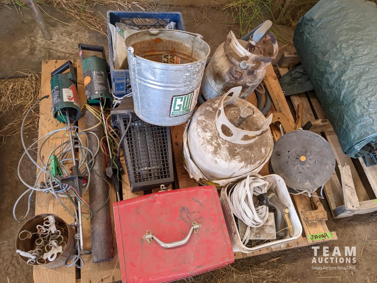 Fence insulators, (2) fencers, steamer, fence wire stretcher, Quad tire chains, propane tank, bug zapper