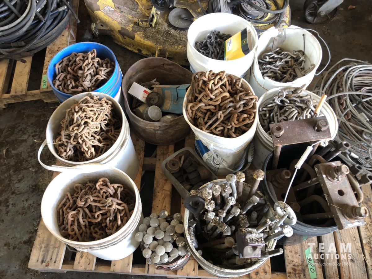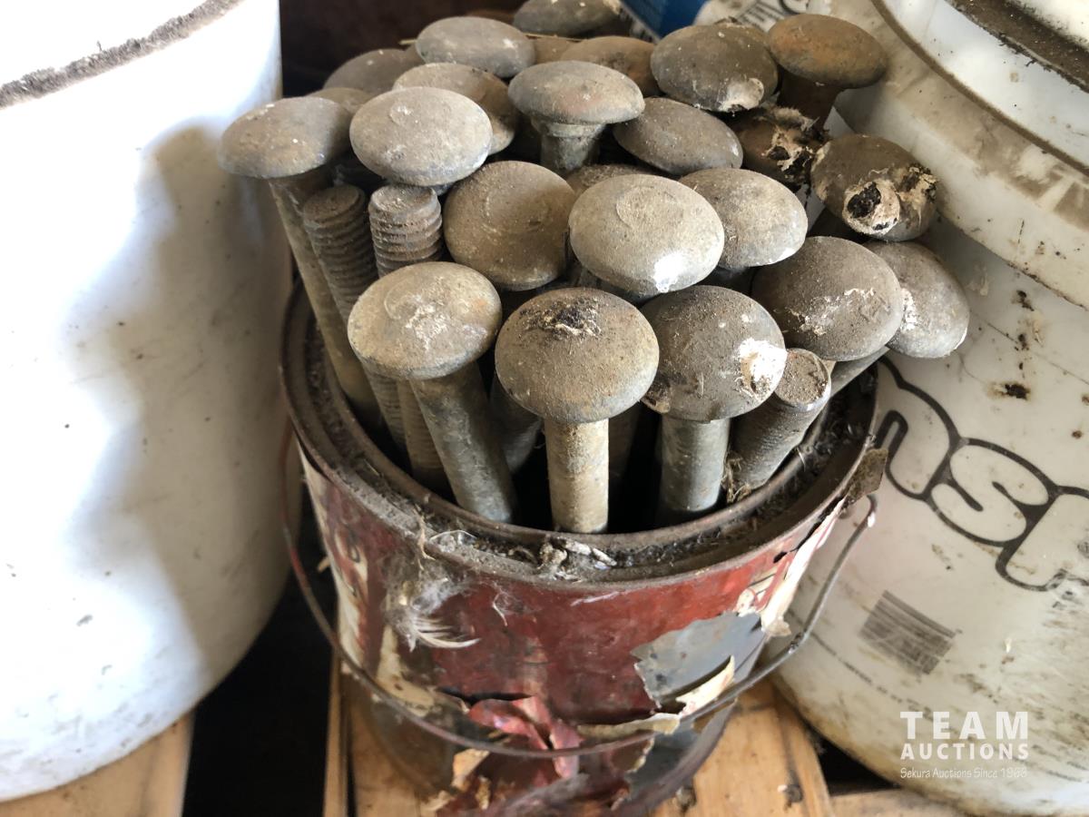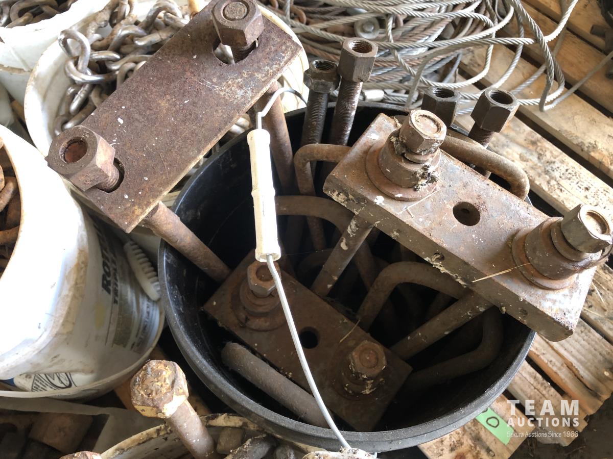 assortment of bolts, carriage bolts, u-bolts, rubber mounts, (4) pails of large equipment tire chains, (2) pails of truck tire chains & assortment of large light bulbs