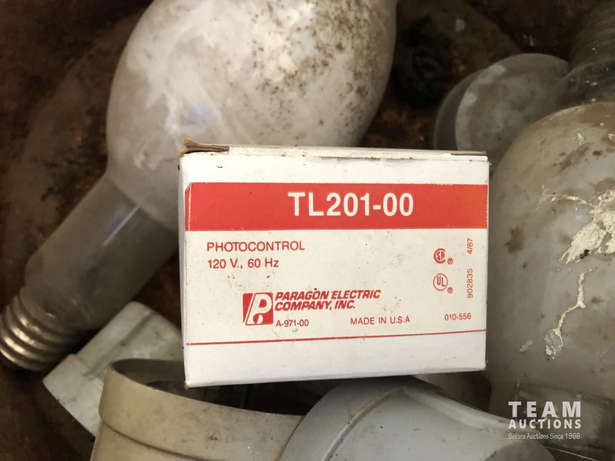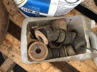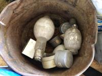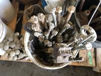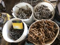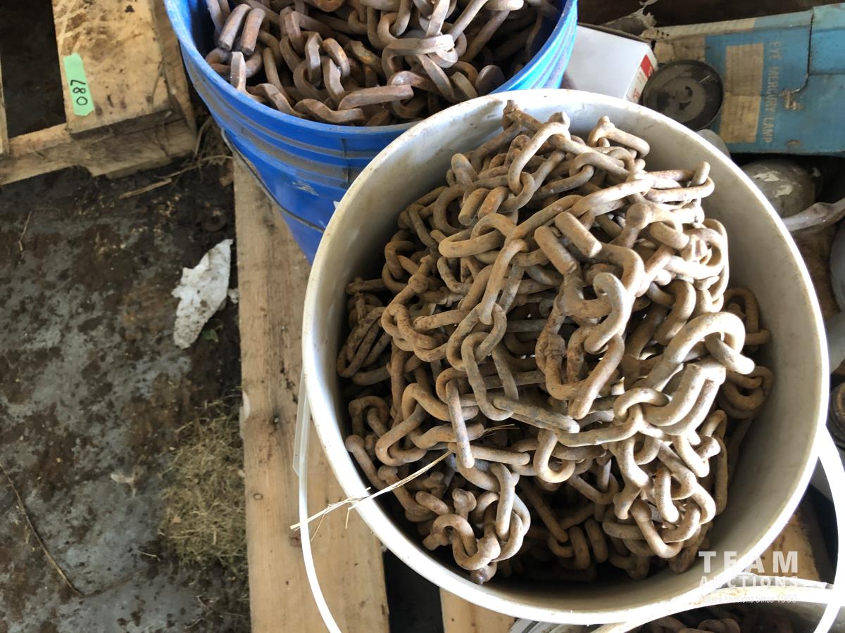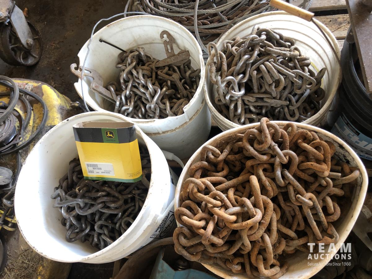 assortment of bolts, carriage bolts, u-bolts, rubber mounts, (4) pails of large equipment tire chains, (2) pails of truck tire chains & assortment of large light bulbs