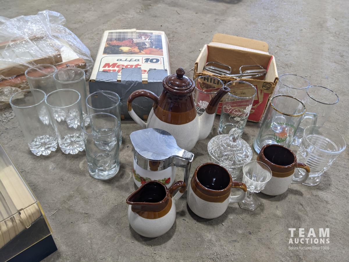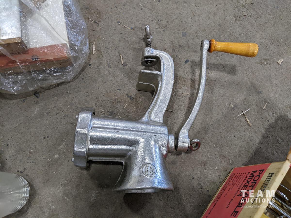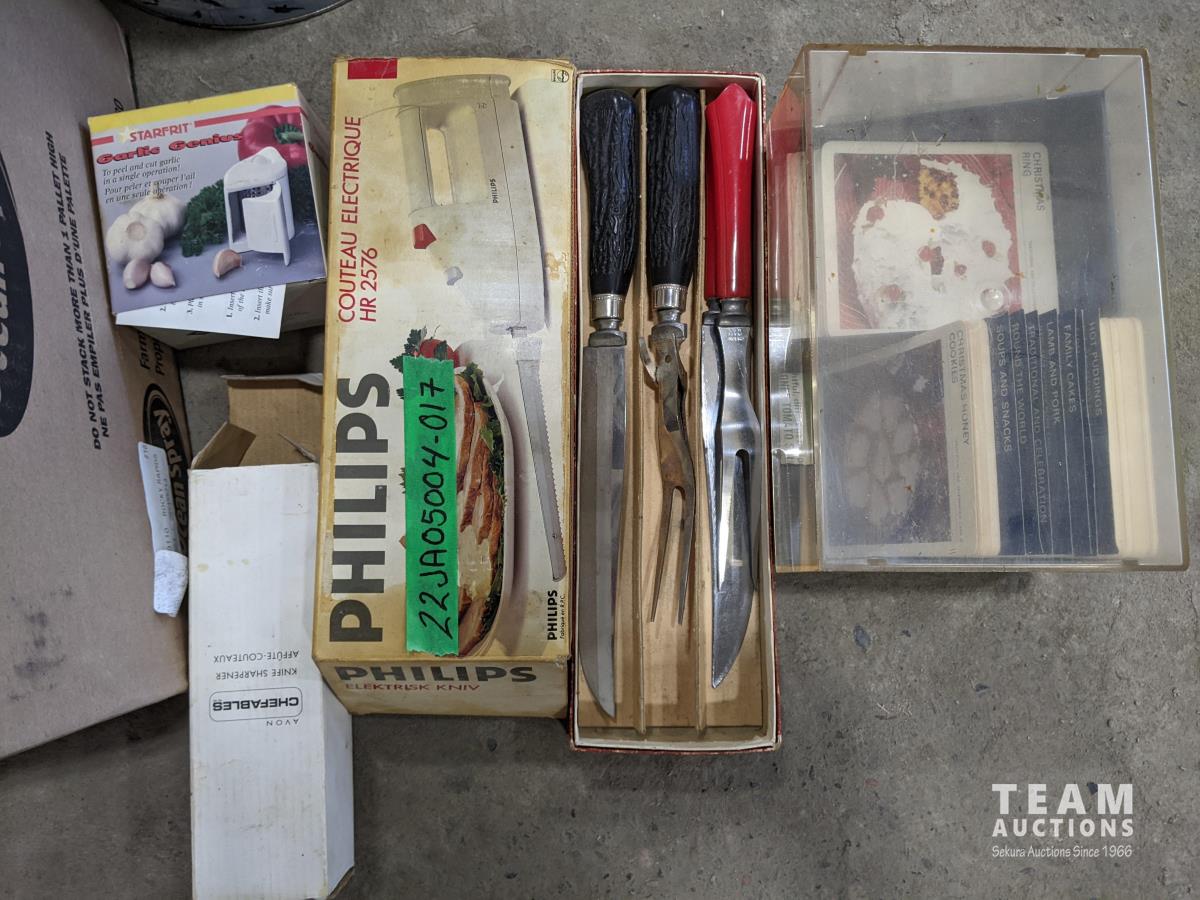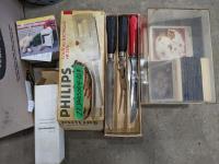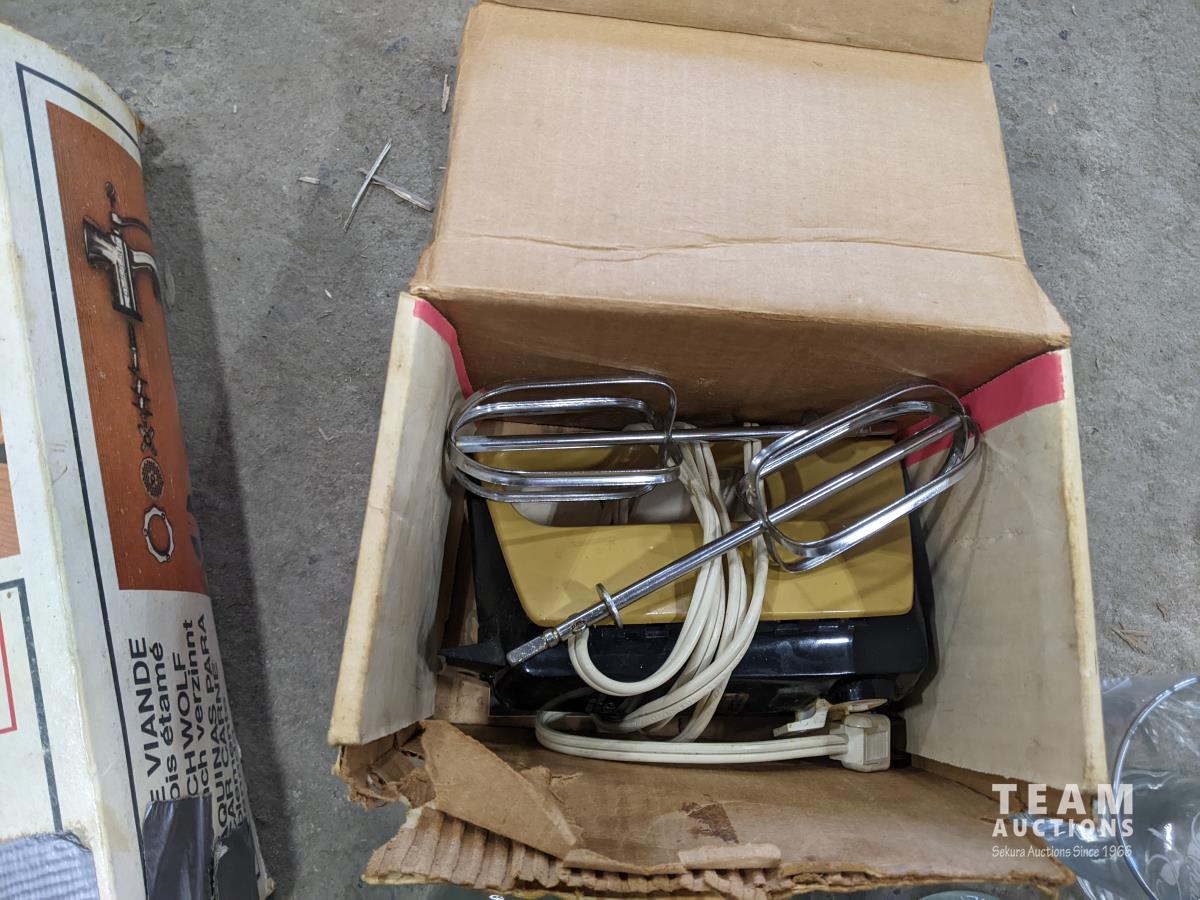Meat grinder, meat slicer, mixer, dished, recipe cards, glasses, electric knife