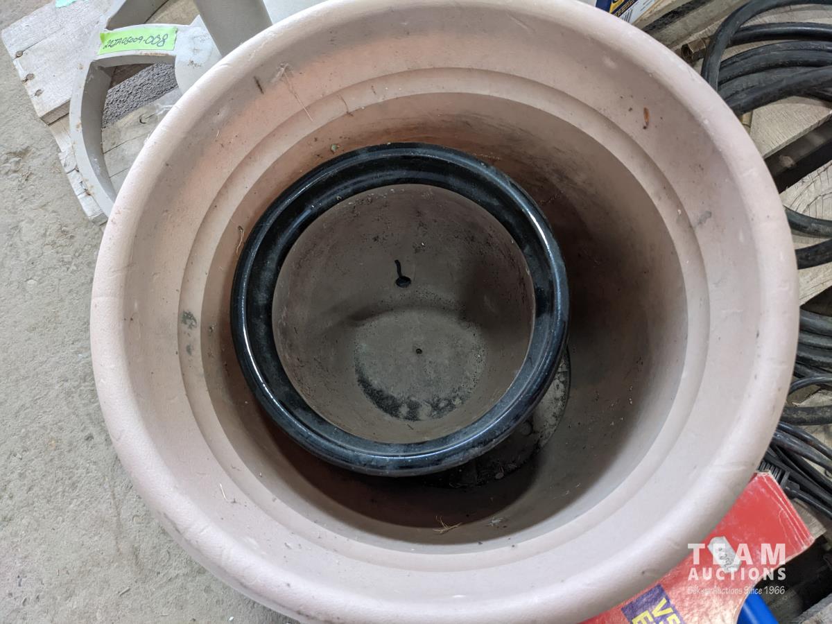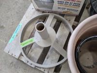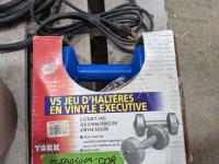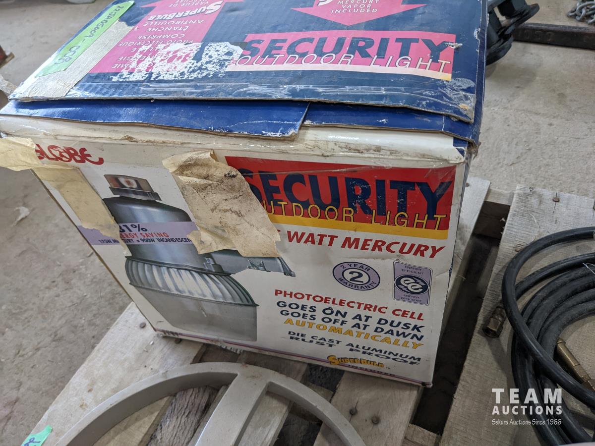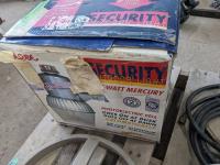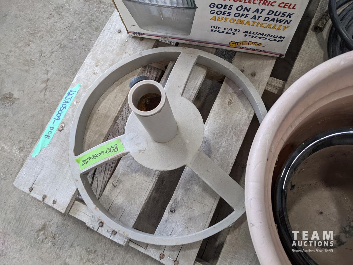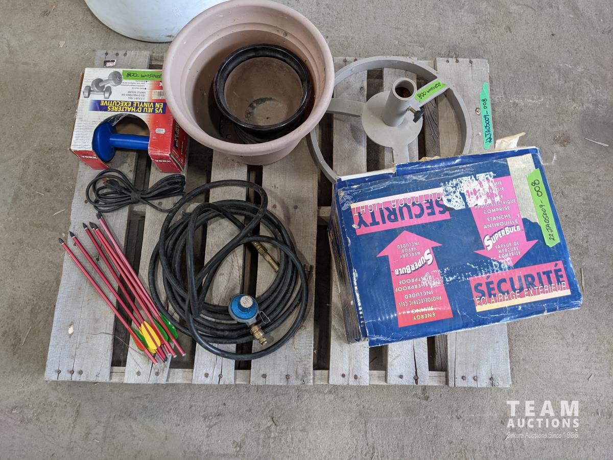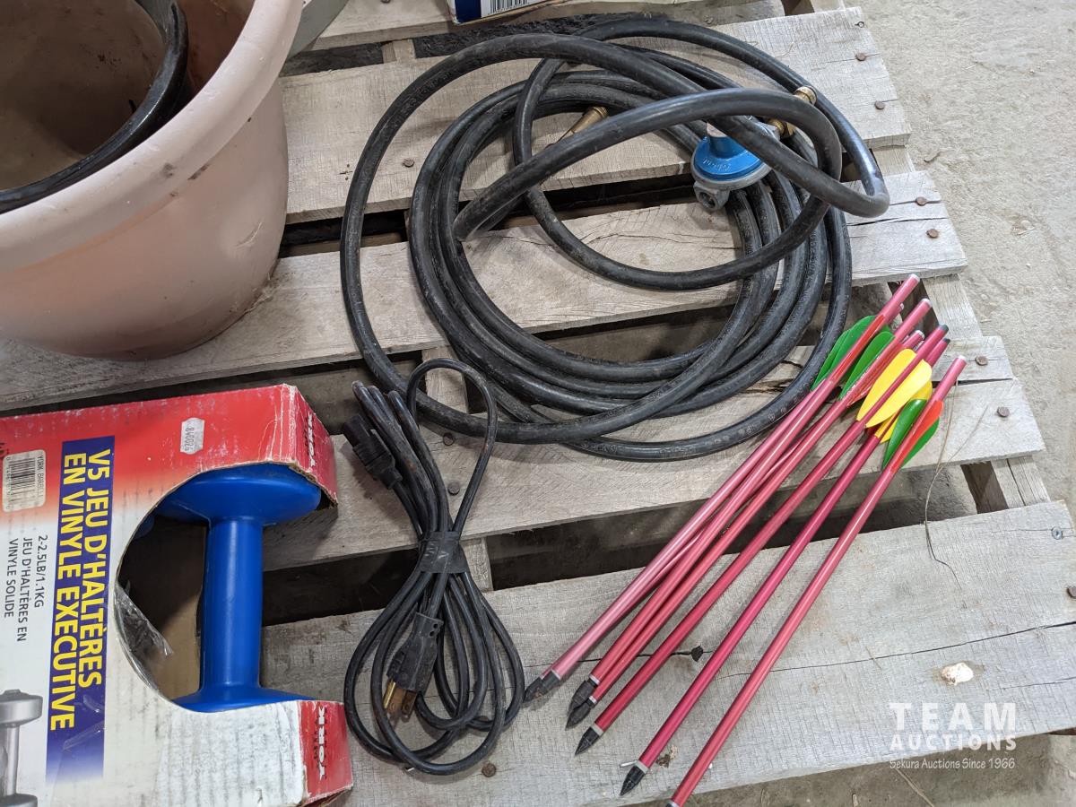 Outside security light, propane hose, arrows, weights, umbrella stand