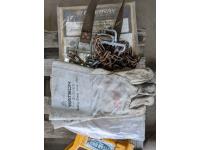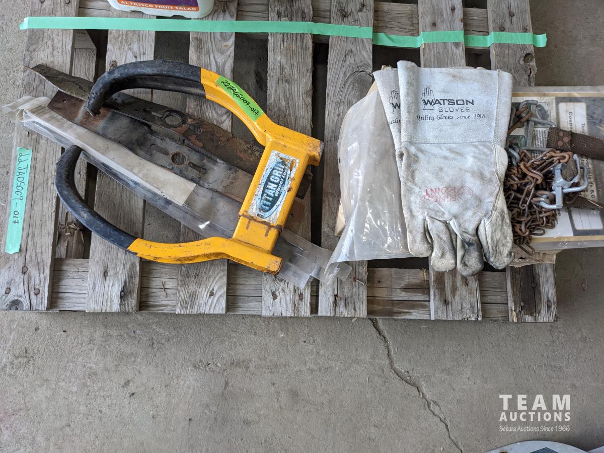 Mower blades, welding gloves, wheel lock, plastic bins