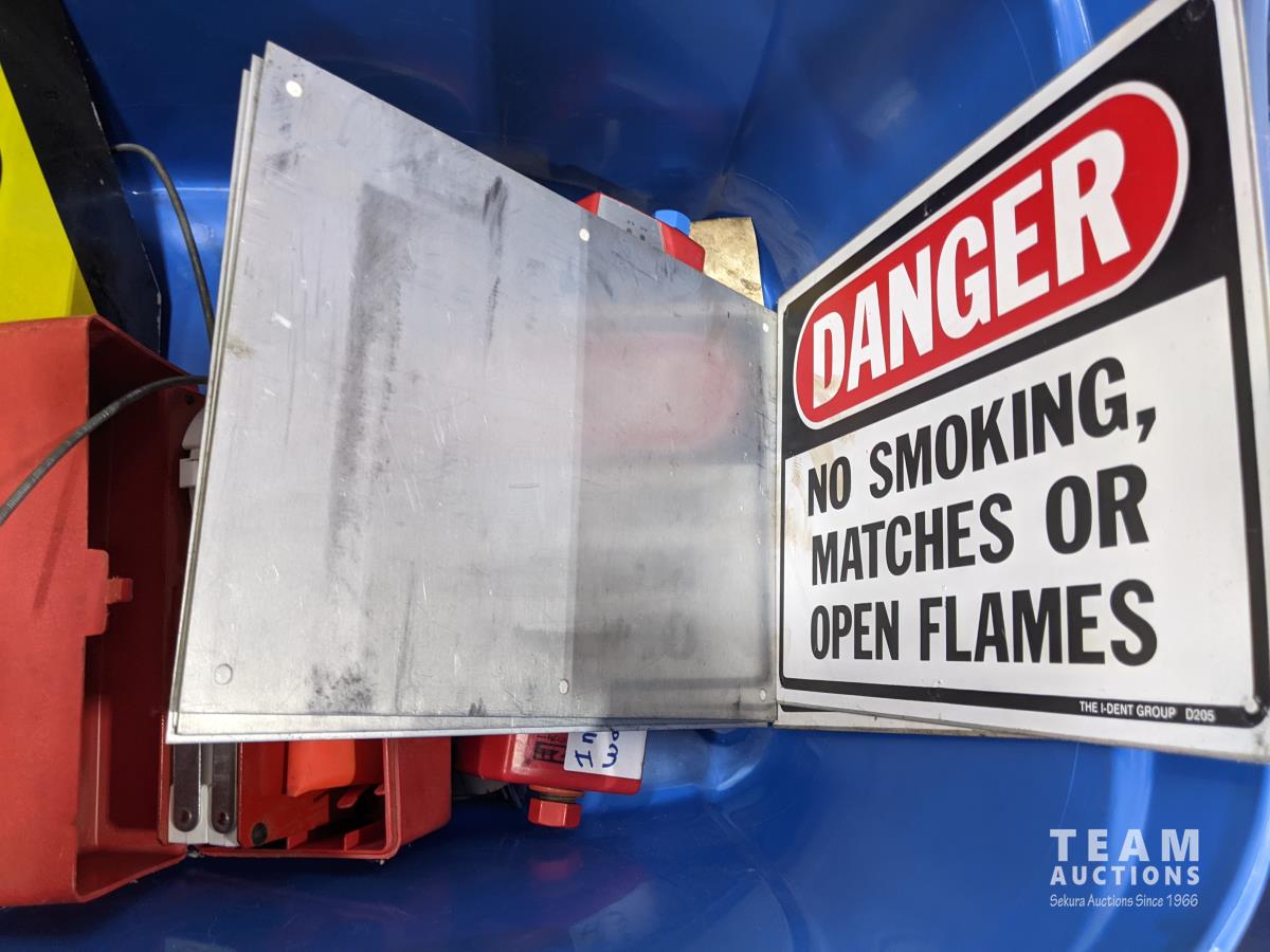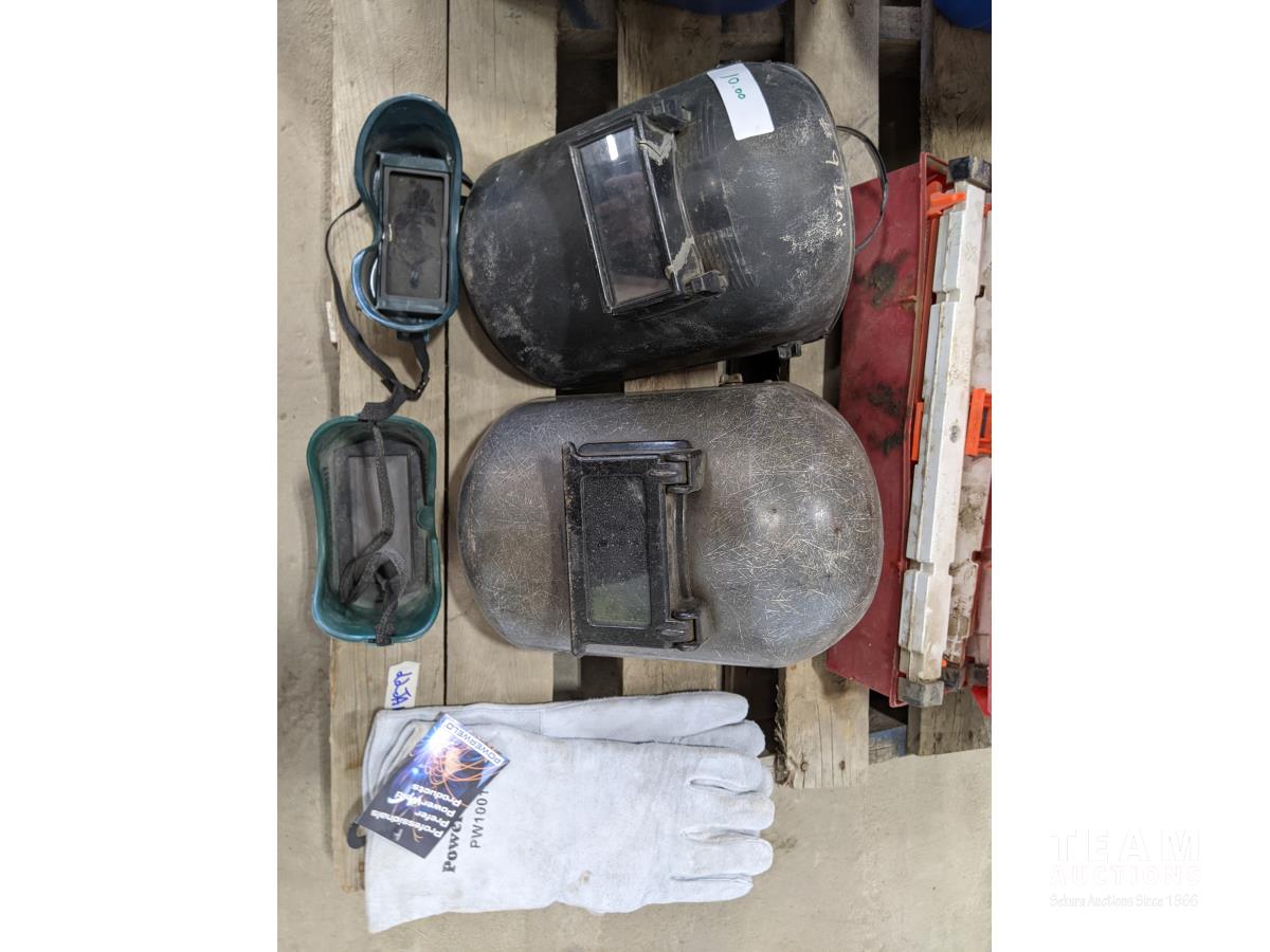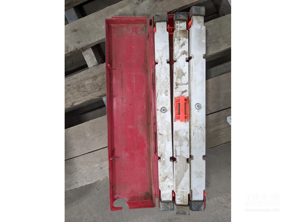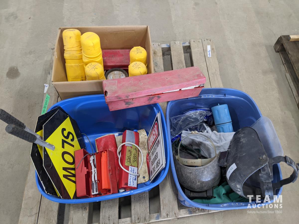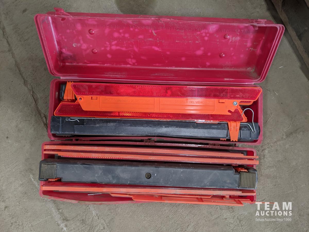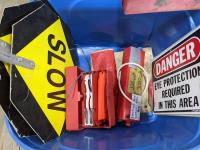 (2) sets of emergency triangles, assorted signs, welding helmets and gloves, emergency kit