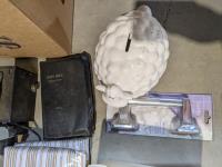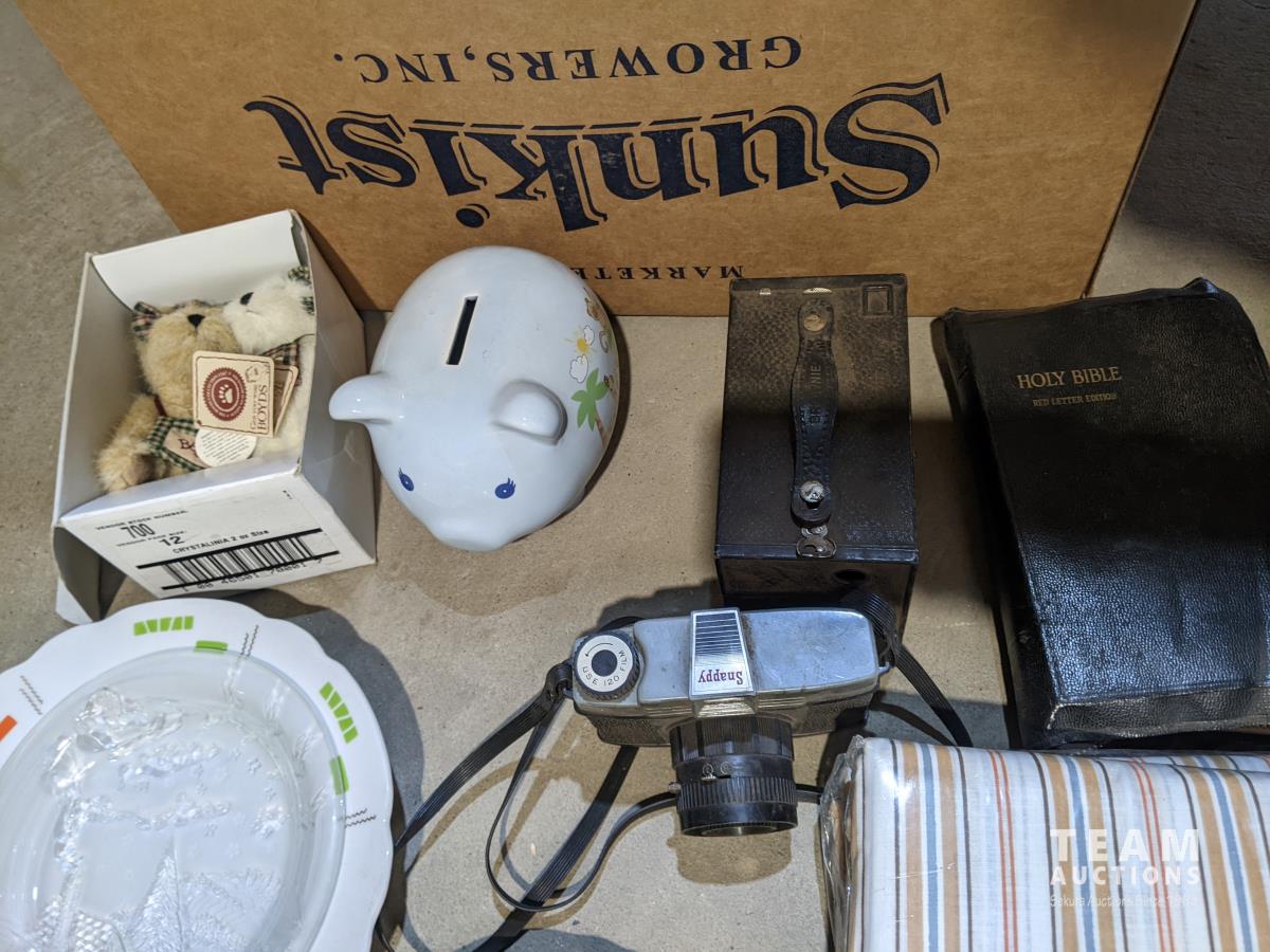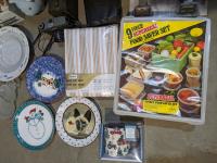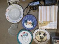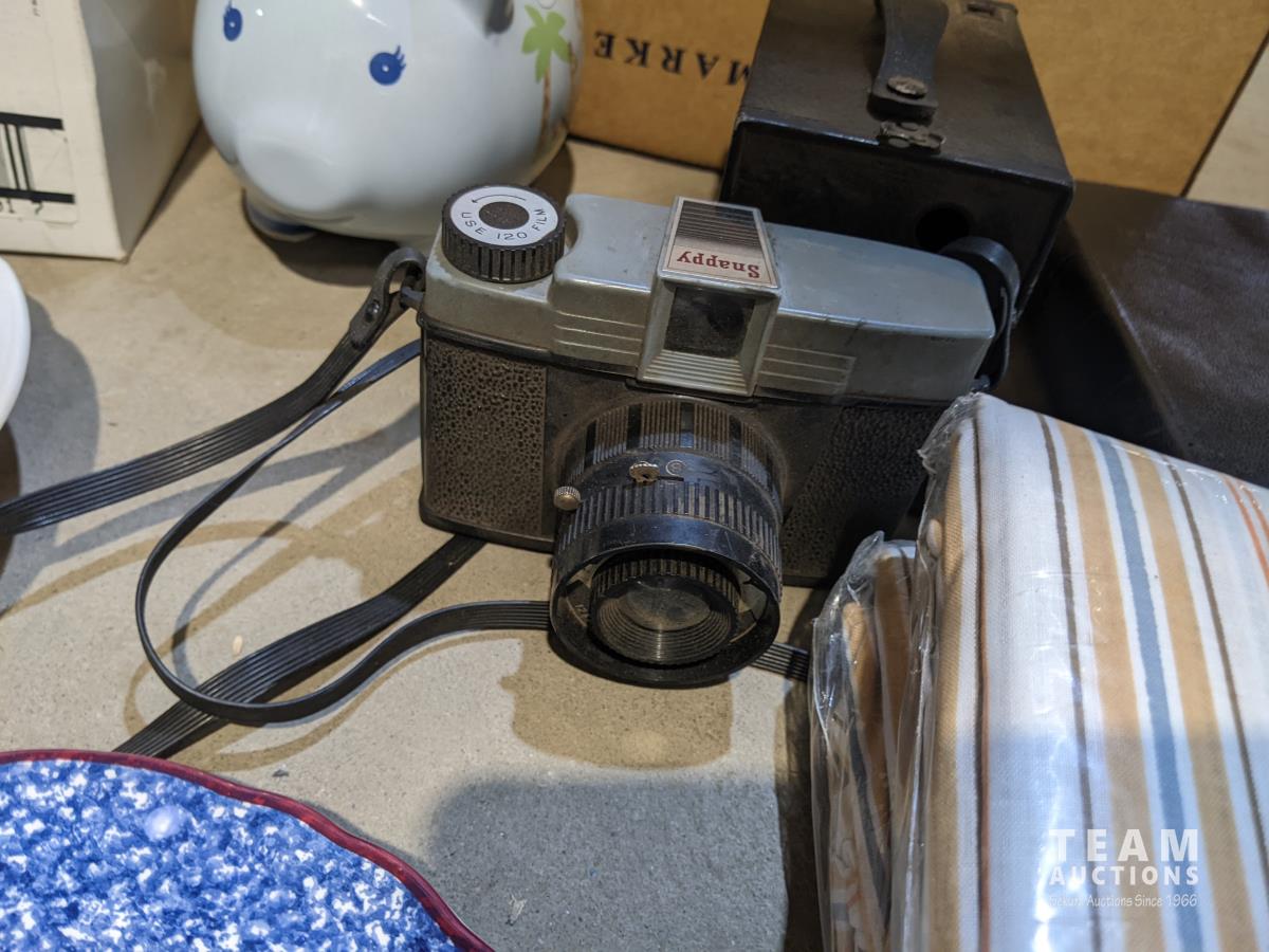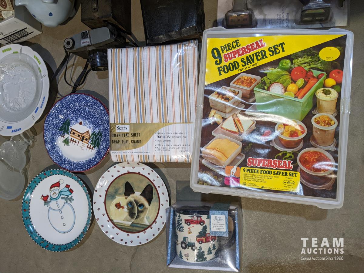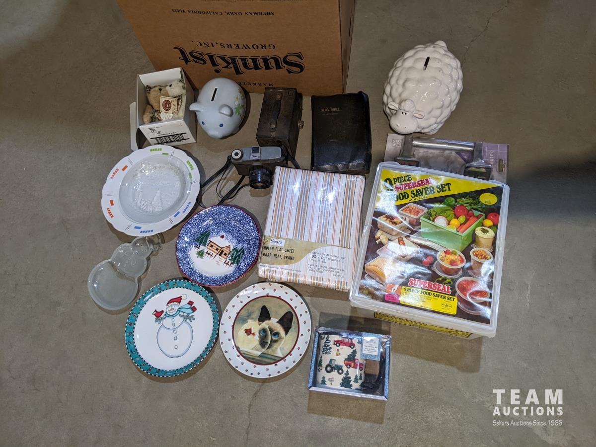 Food saver set, antique camera, decor plates, queen flat sheet & sheep piggy bank