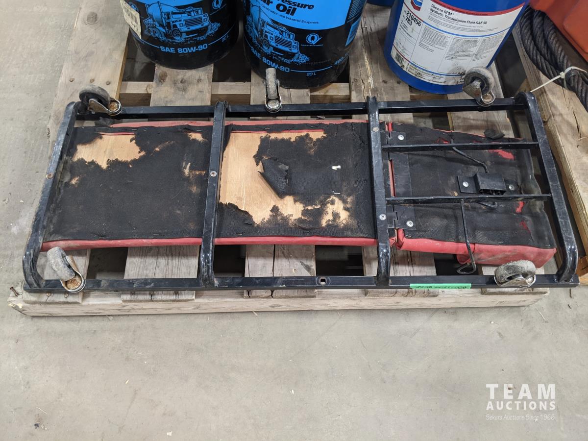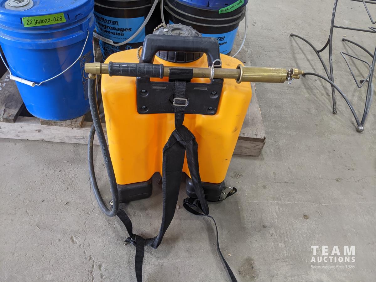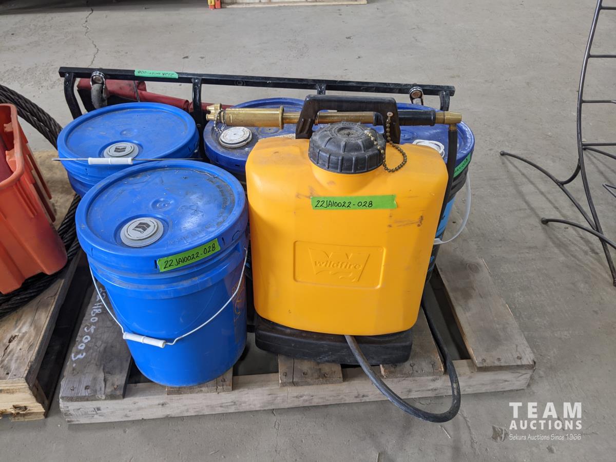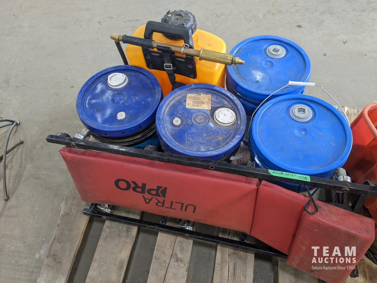 Creeper, (2) pails of gear oil, (2) pails of transmission fluid, backpack water sprayer