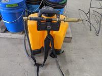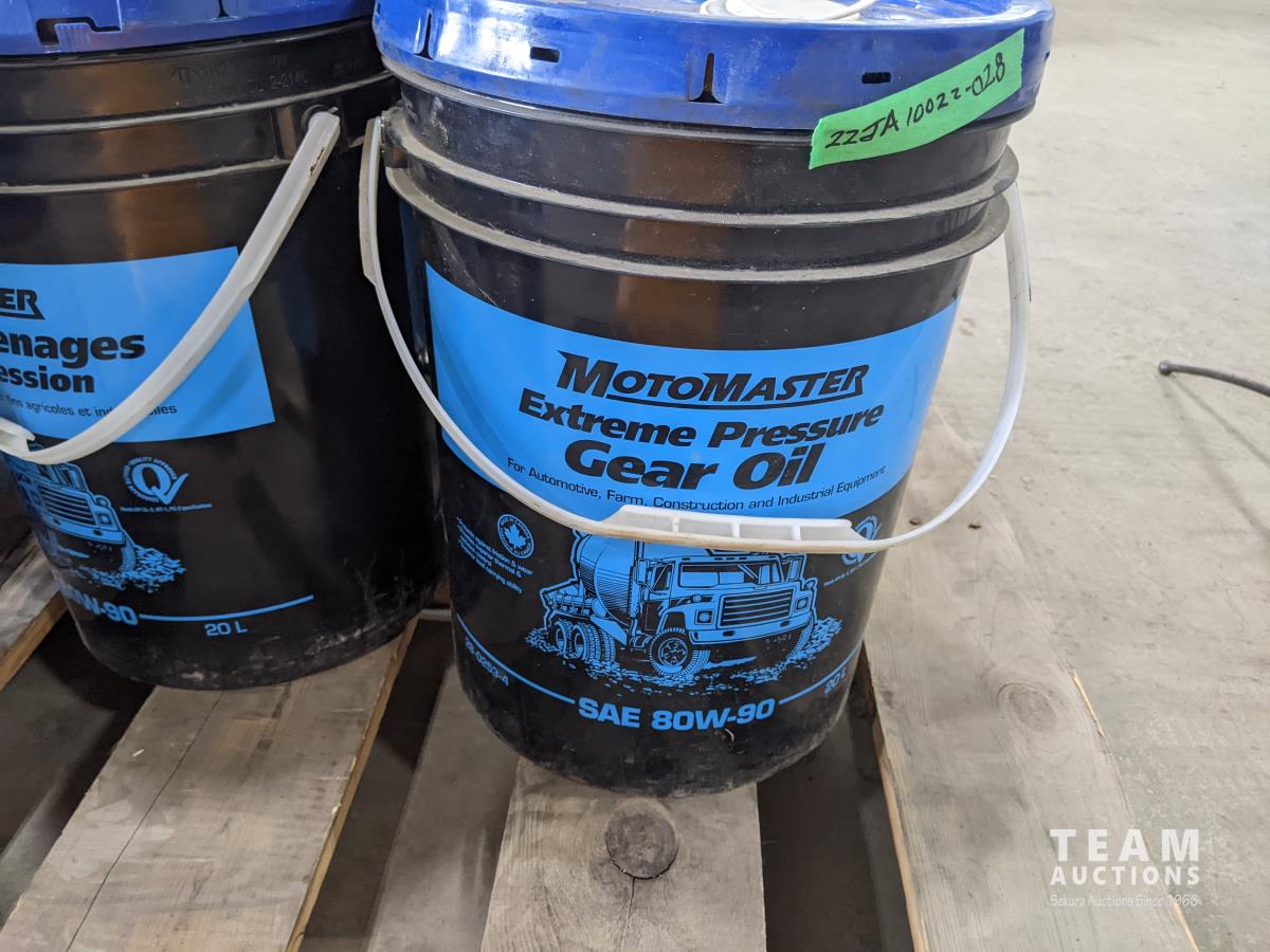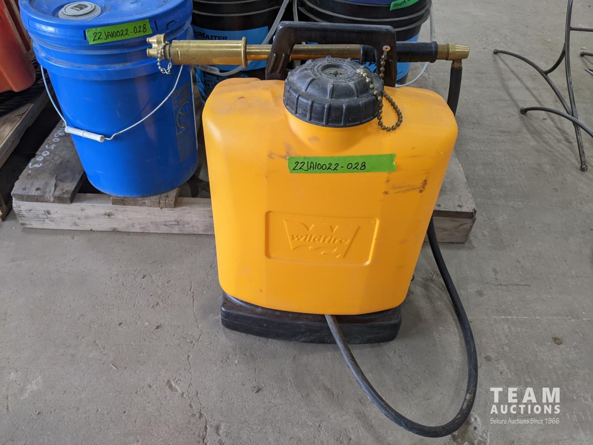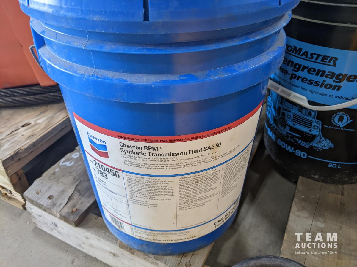 Creeper, (2) pails of gear oil, (2) pails of transmission fluid, backpack water sprayer