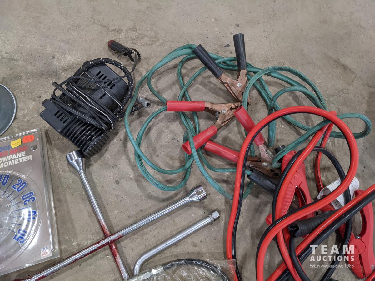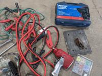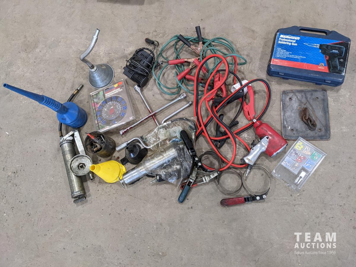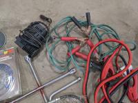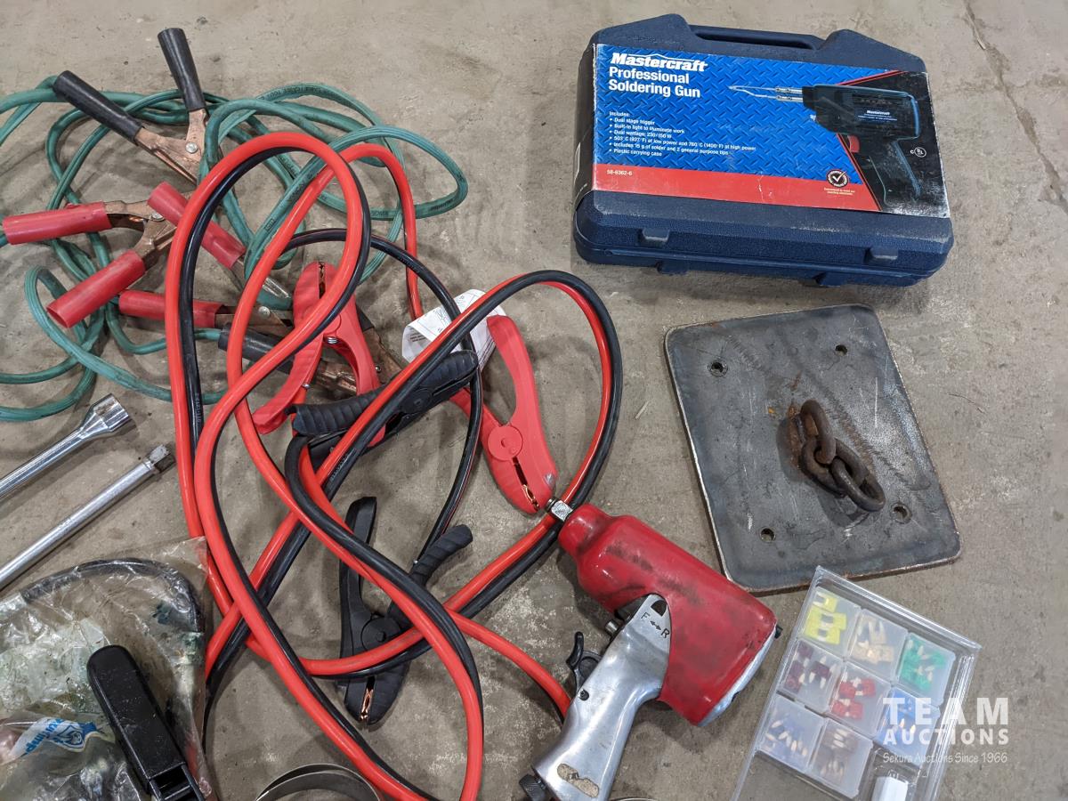 Tire iron, (2) booster cables, grease gun, oil filter wrench, Mastercraft professional soldering gun, miscellaneous tools