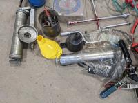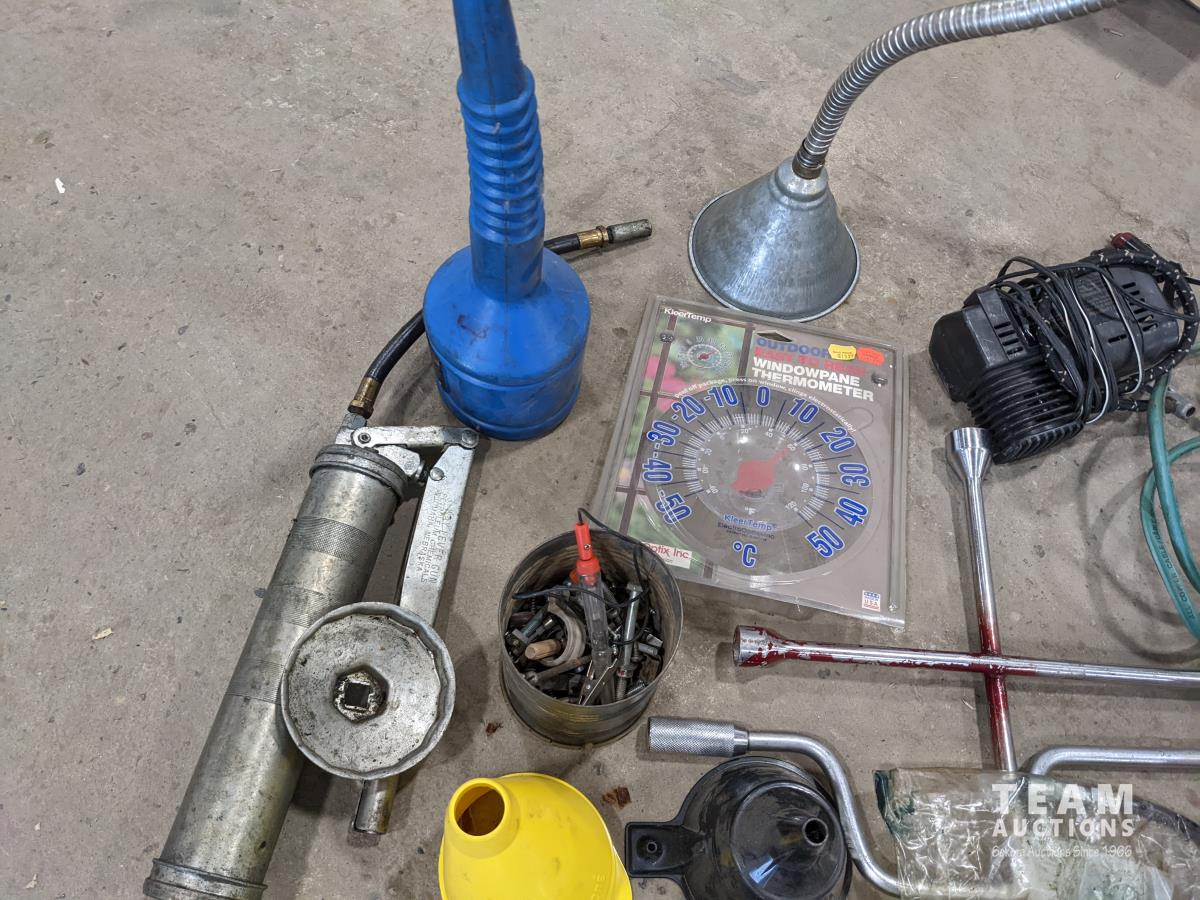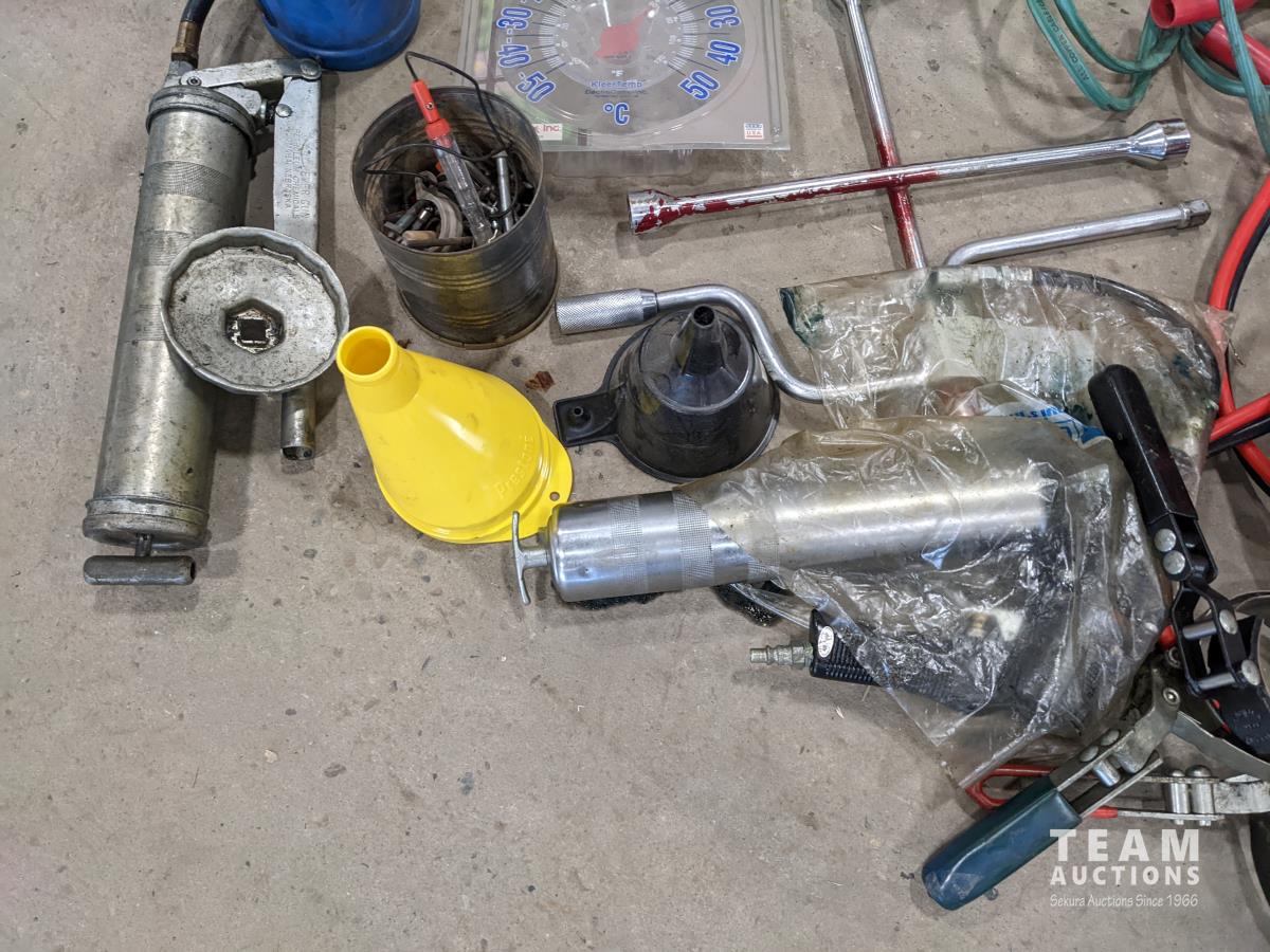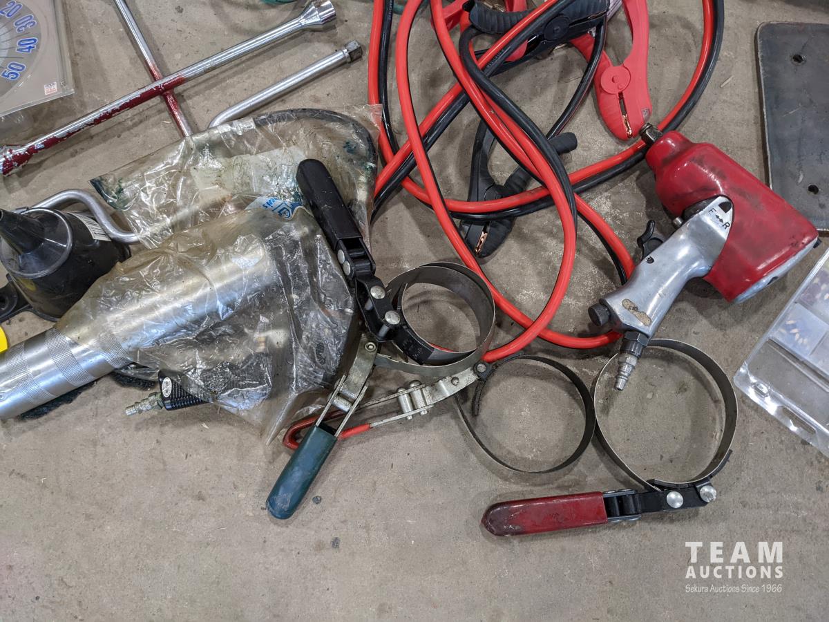 Tire iron, (2) booster cables, grease gun, oil filter wrench, Mastercraft professional soldering gun, miscellaneous tools