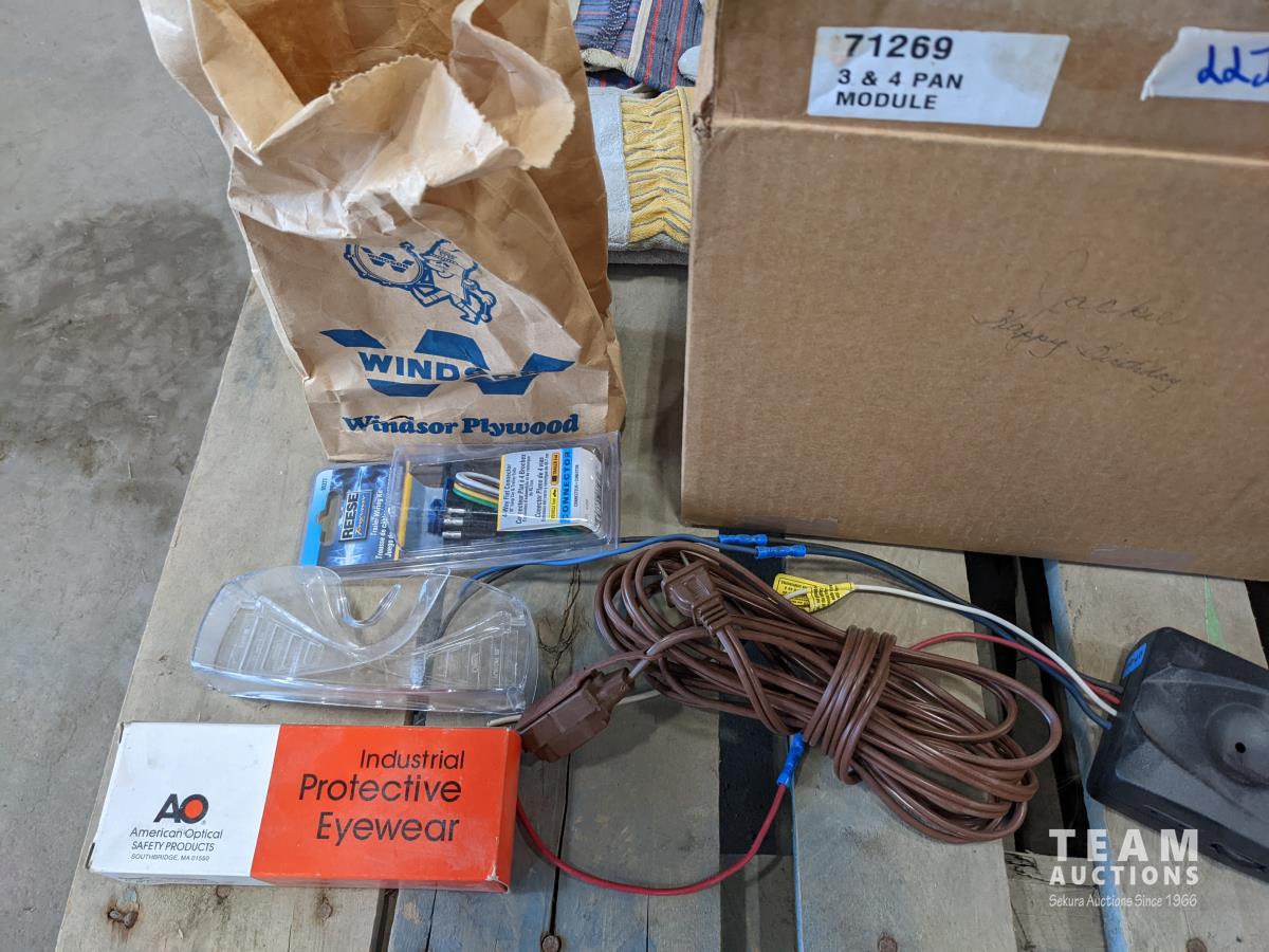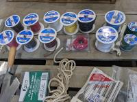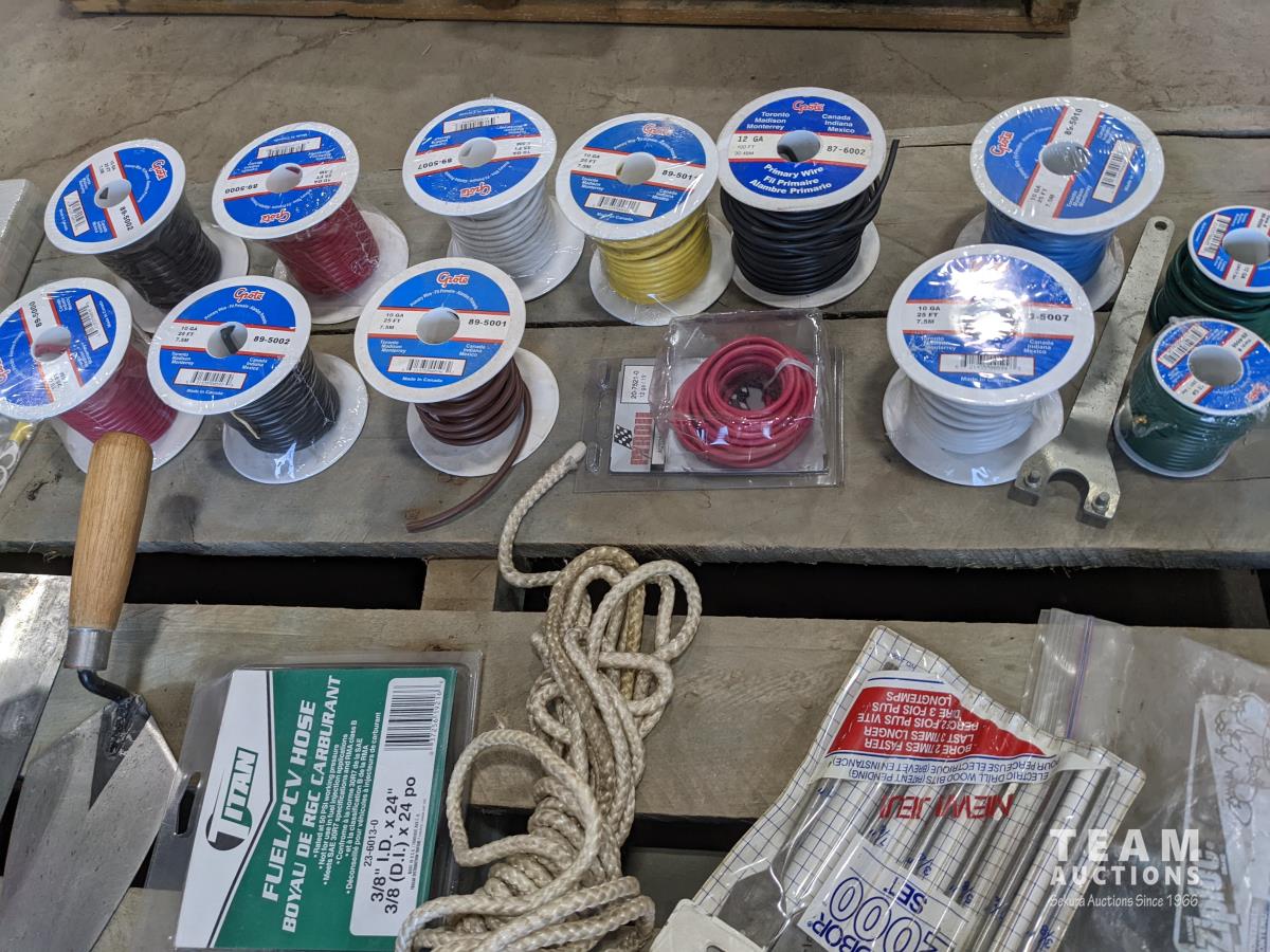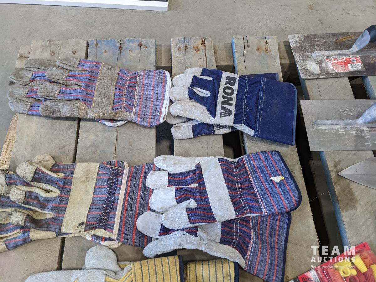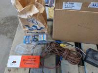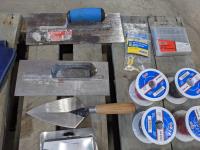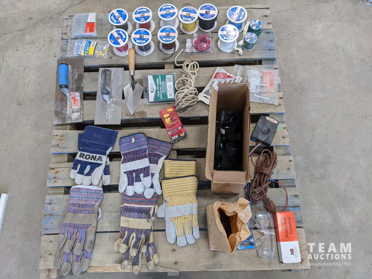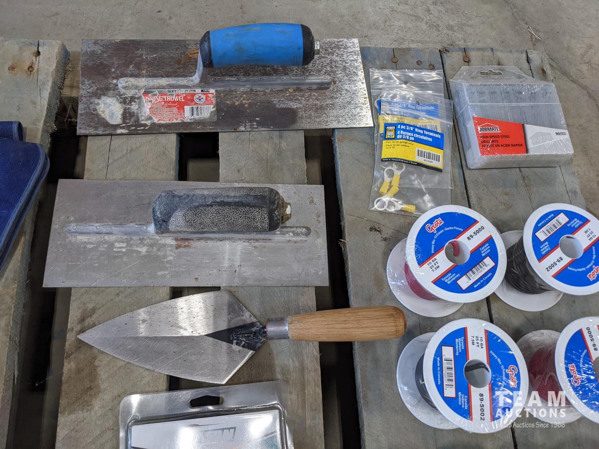 Rolls of electrical wire, (5) gloves, (3) float trowels, bag of nails, Speedbor 2000 set