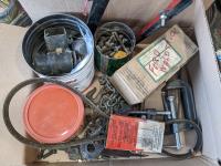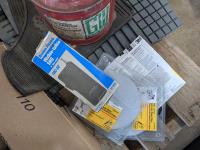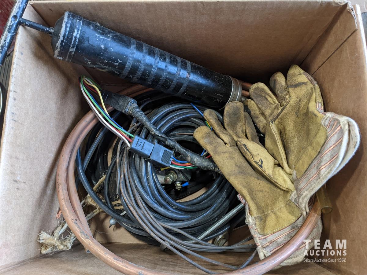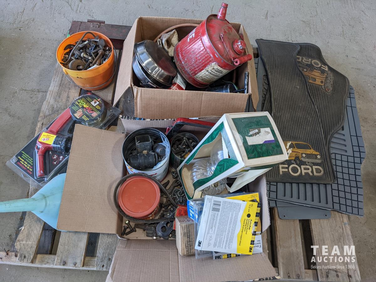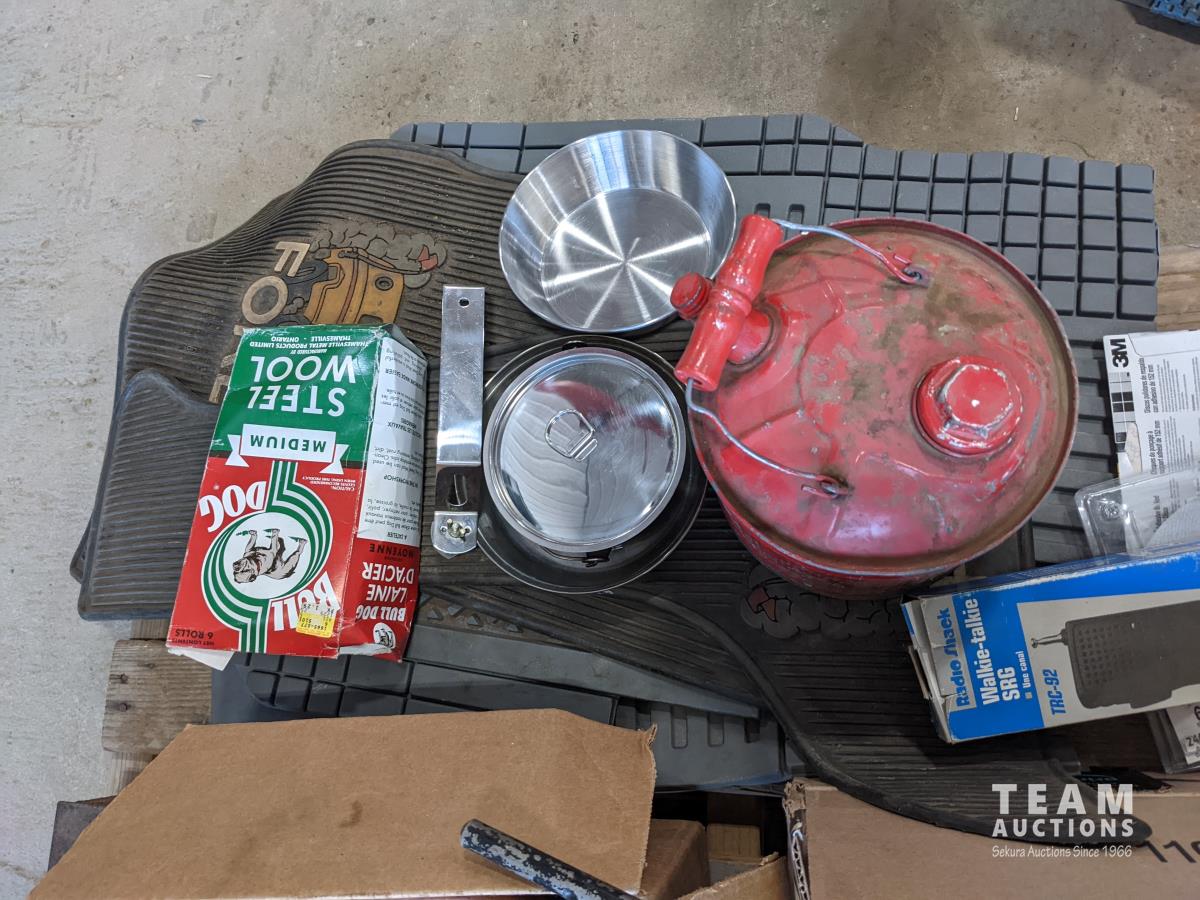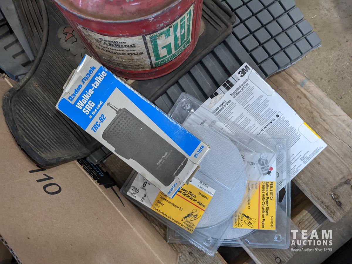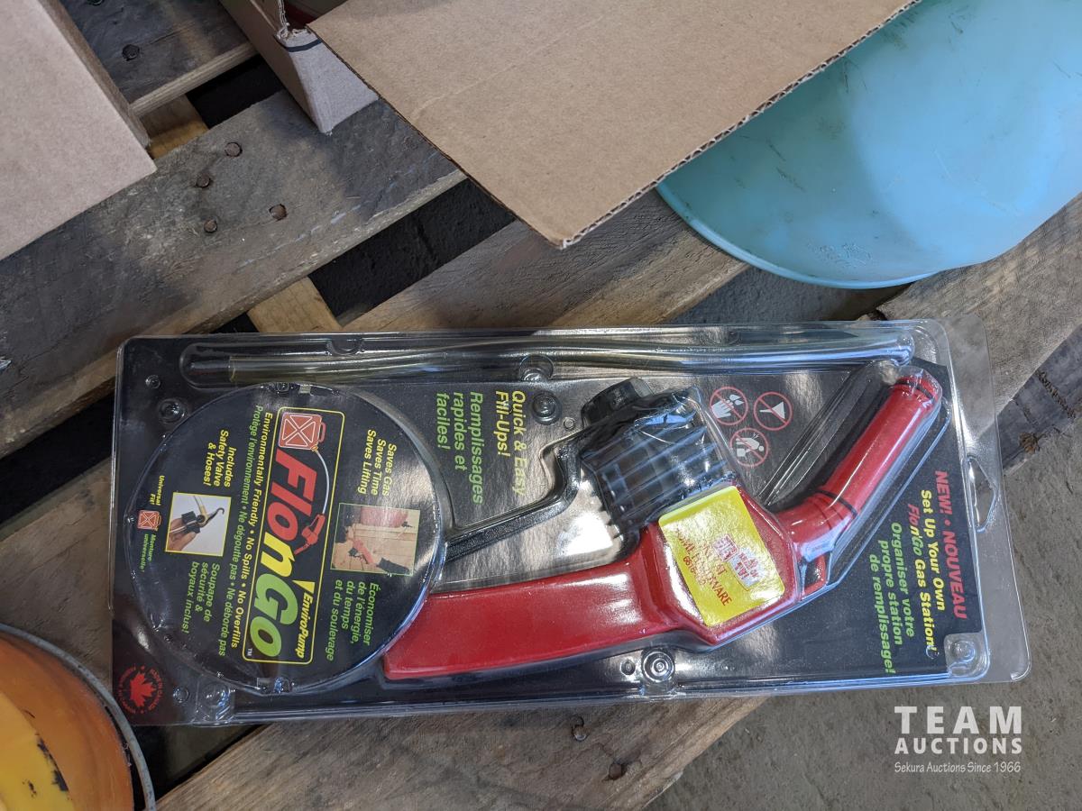 Bucket of bolts, socket set, household lamp, grease gun, oil pan, electrical, Flo'n'Go electrical gas pump, (4) vehicle floor mats