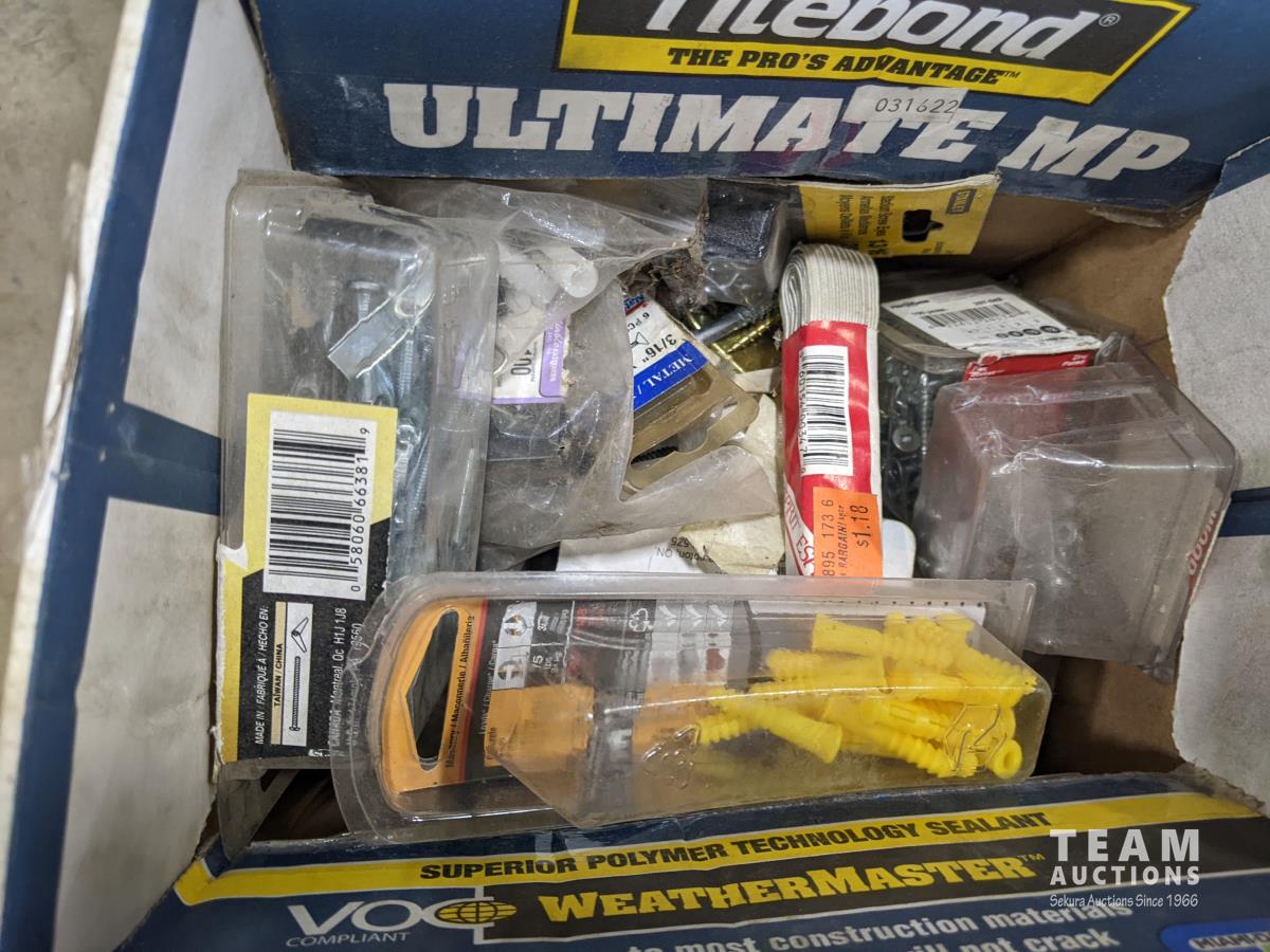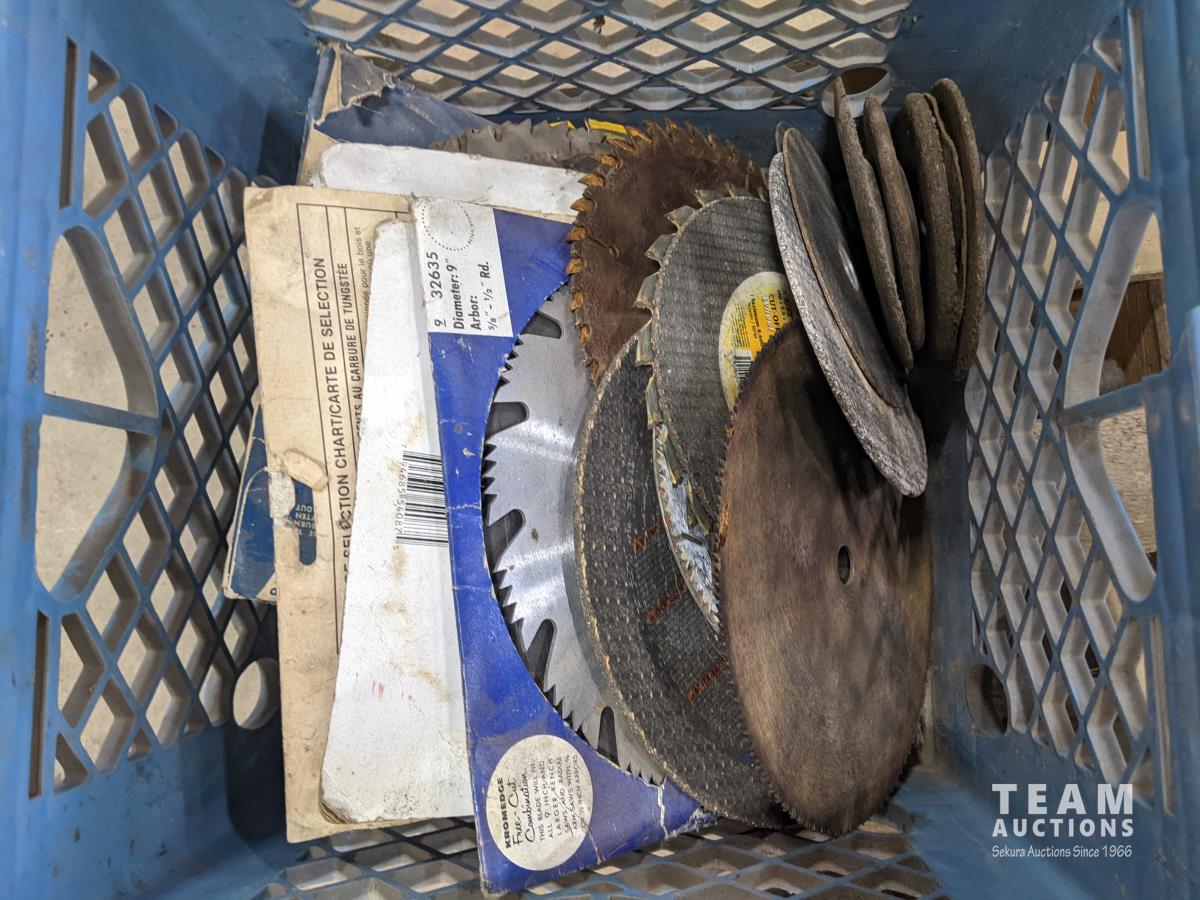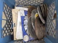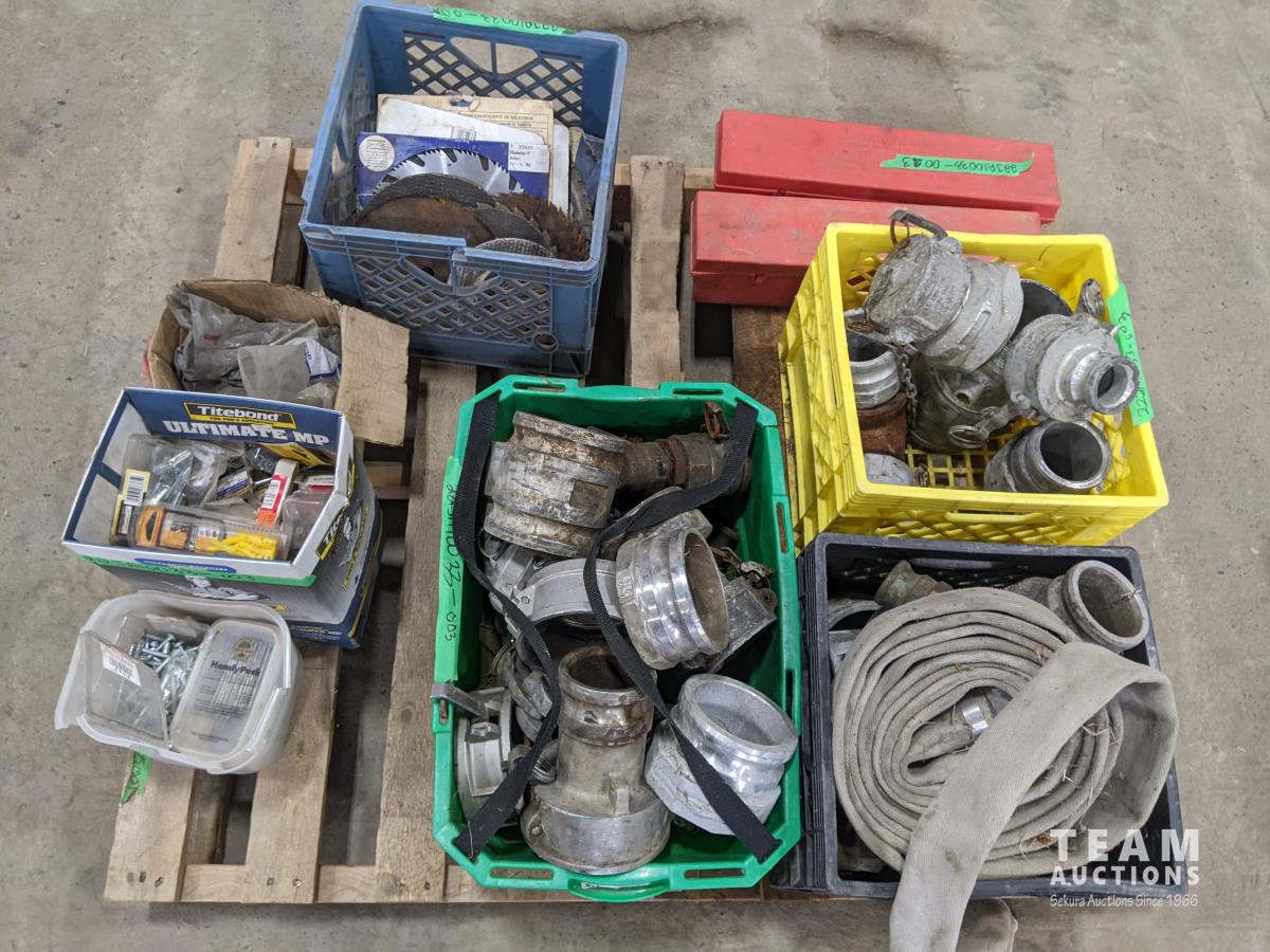 (3) crates of cam lock fittings for water, (3) boxes of screws/plugs/miscellaneous, crate of miscellaneous table saw blades, (2) boxes of roadside flare kits