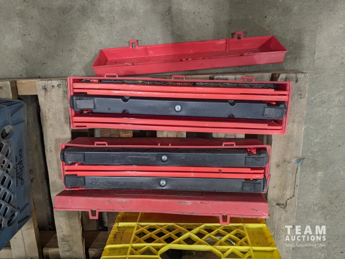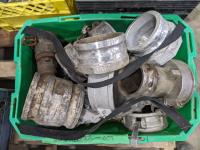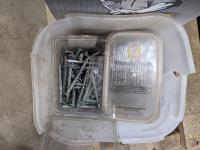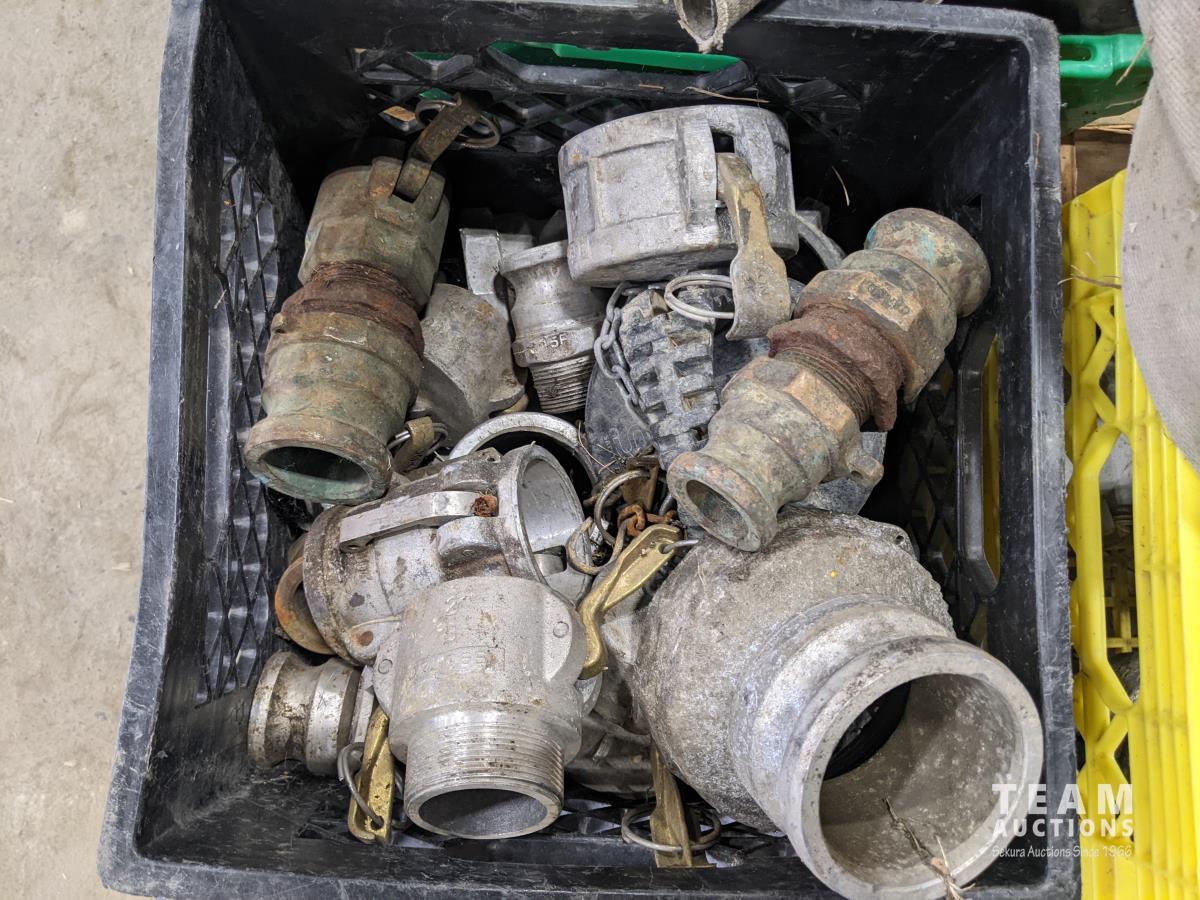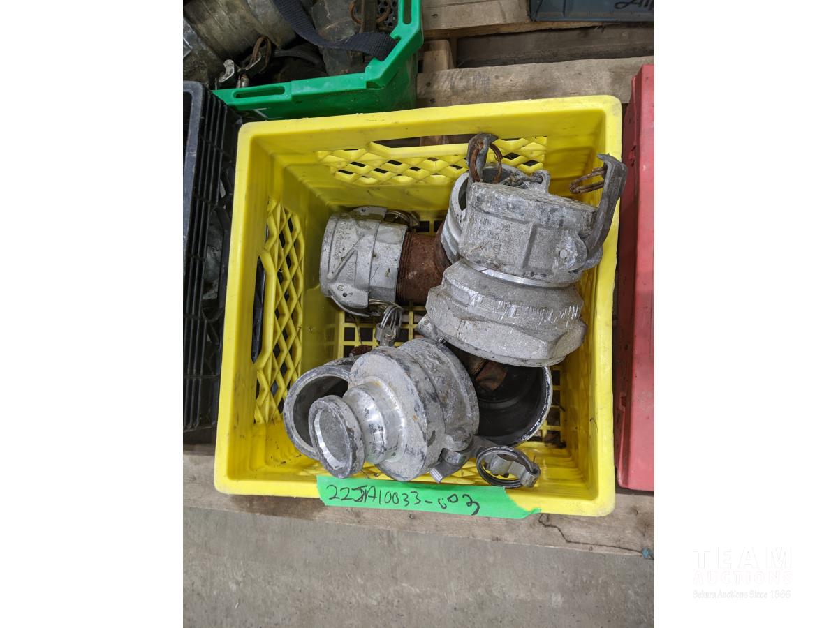 (3) crates of cam lock fittings for water, (3) boxes of screws/plugs/miscellaneous, crate of miscellaneous table saw blades, (2) boxes of roadside flare kits