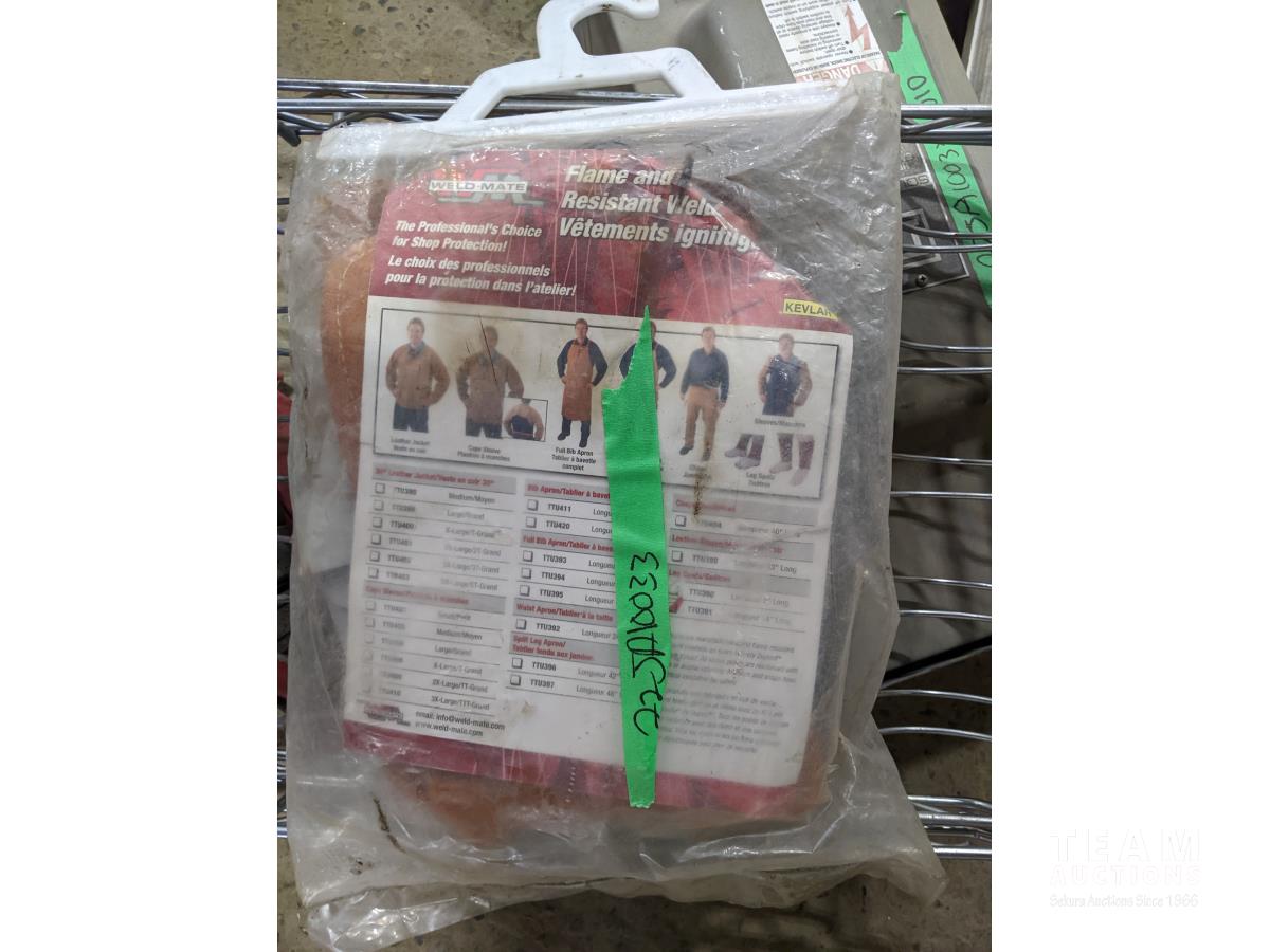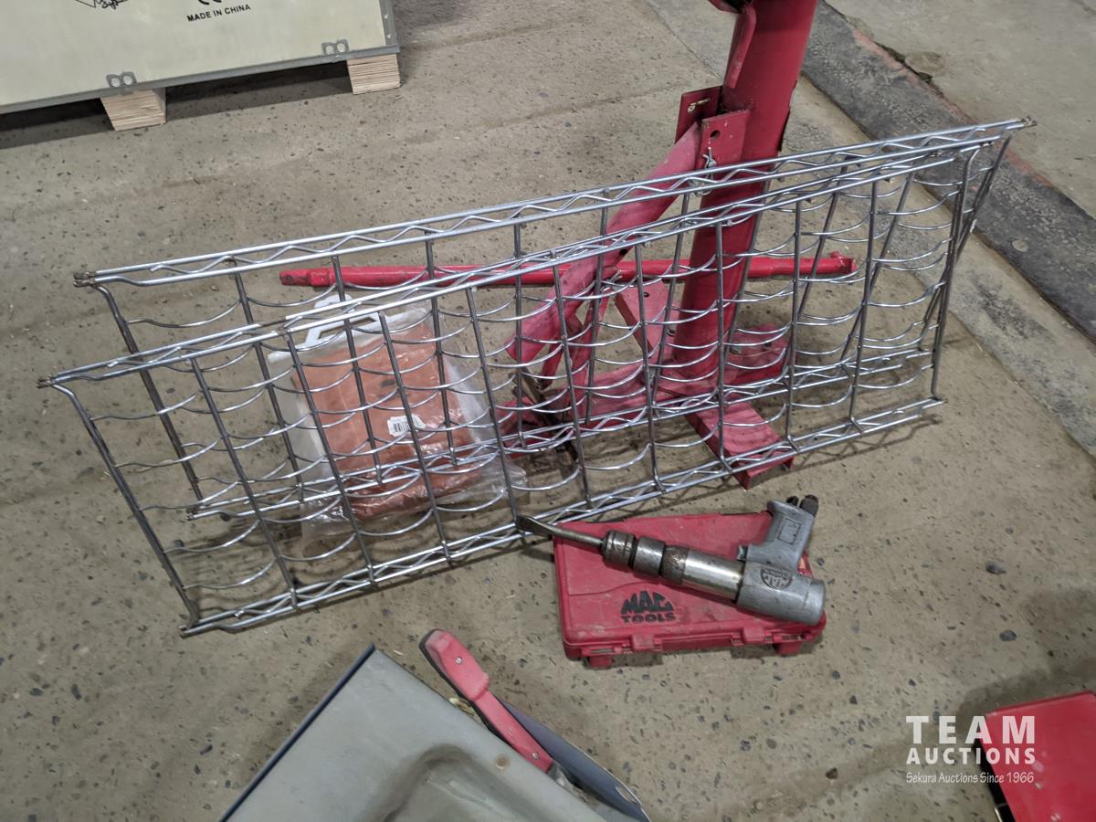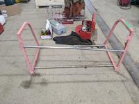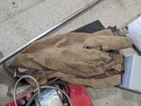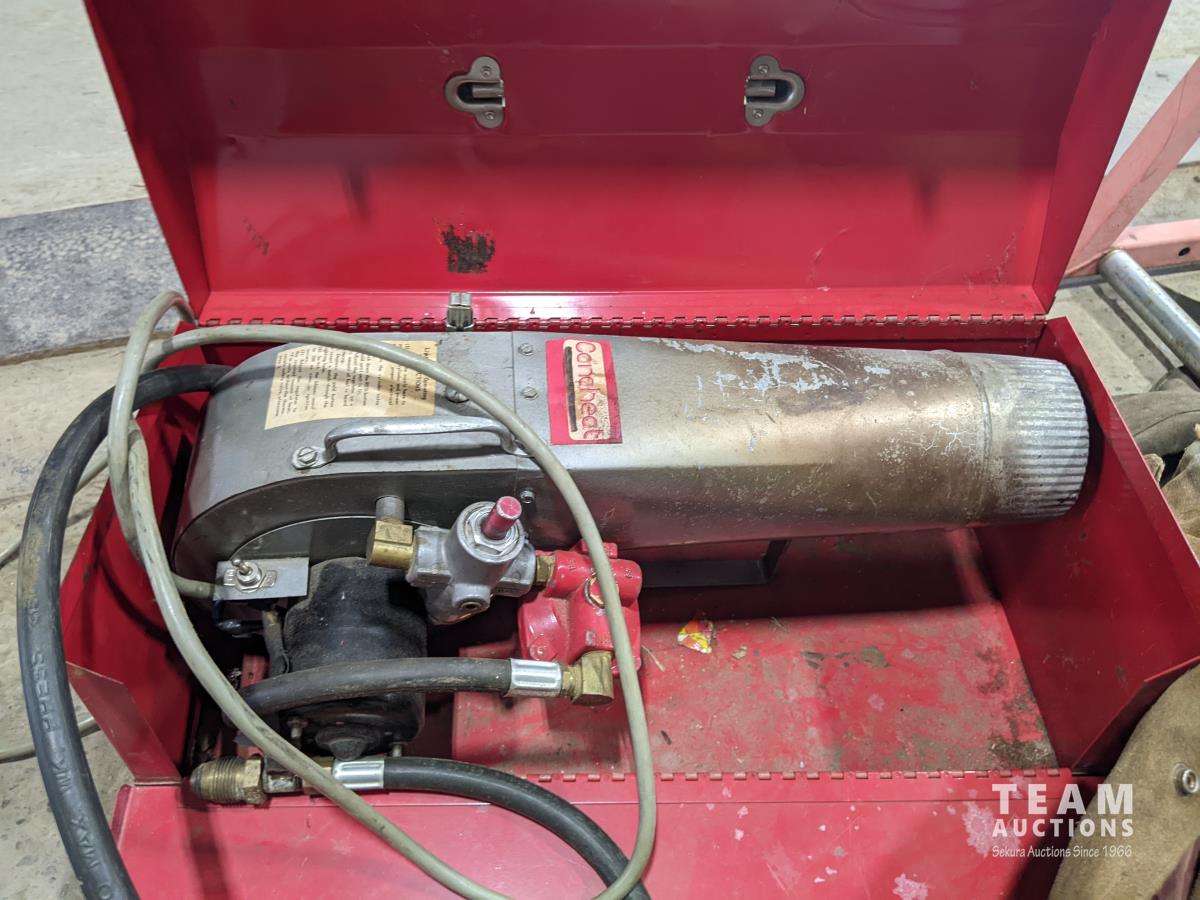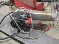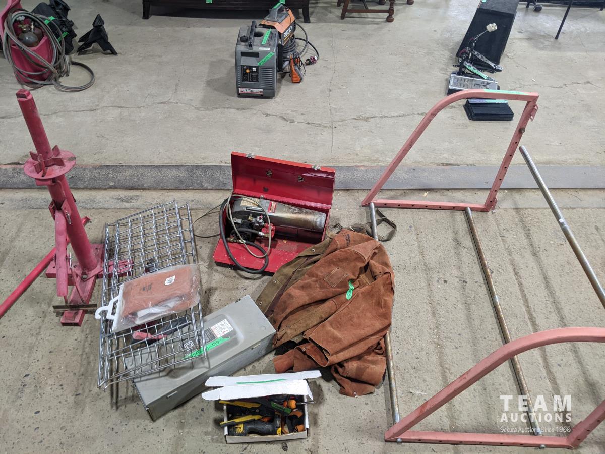 Portable industrial Cana Heater, propane blower, power box, box of miscellaneous hand tools, welding chaps/jacket, rack