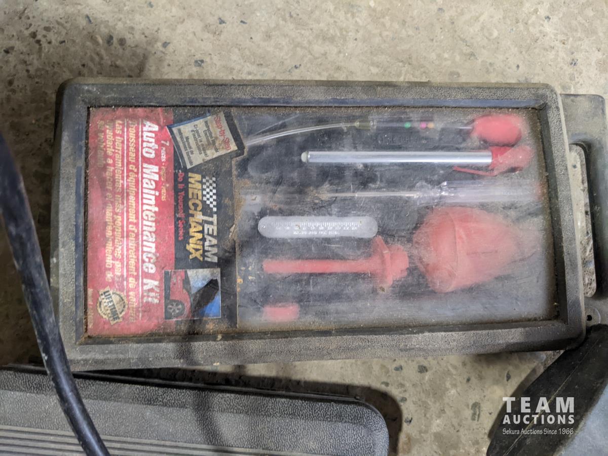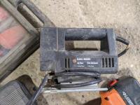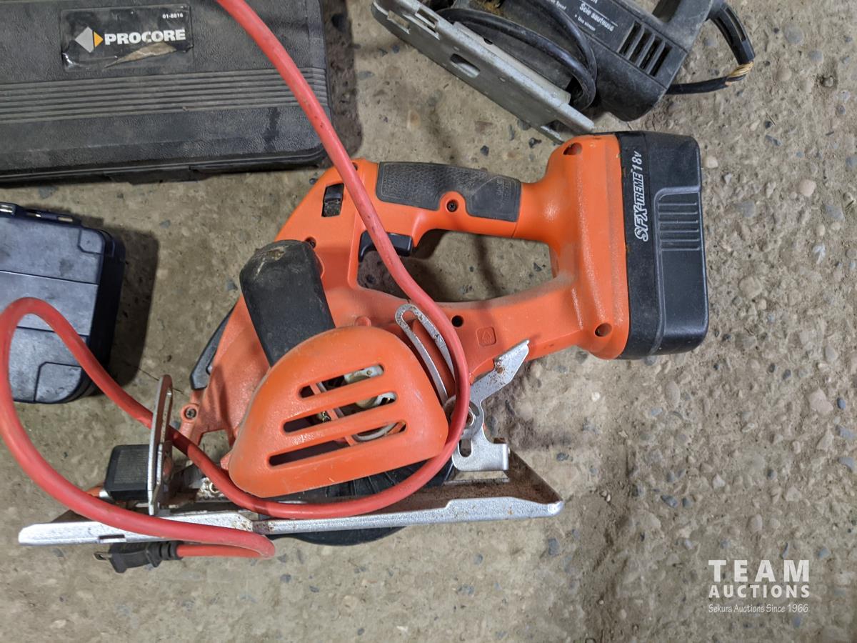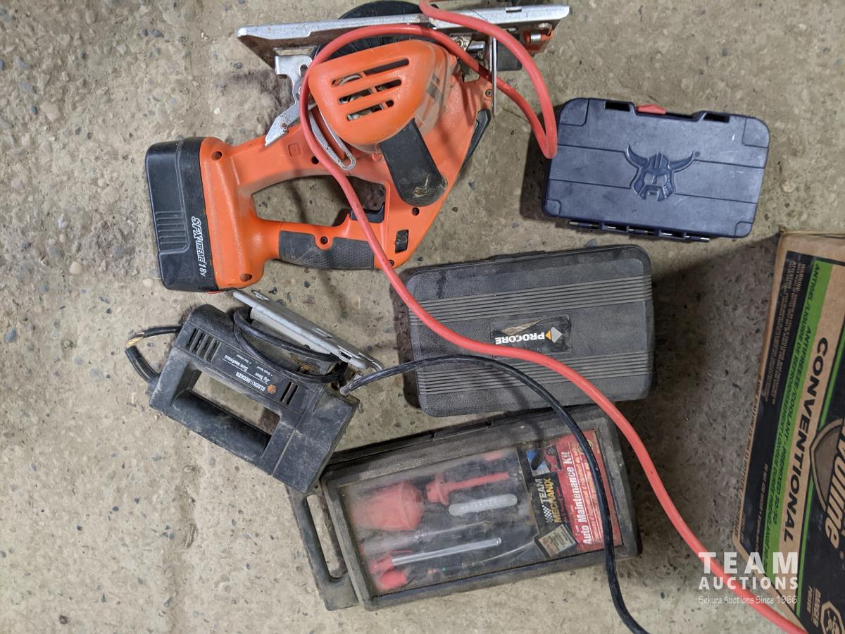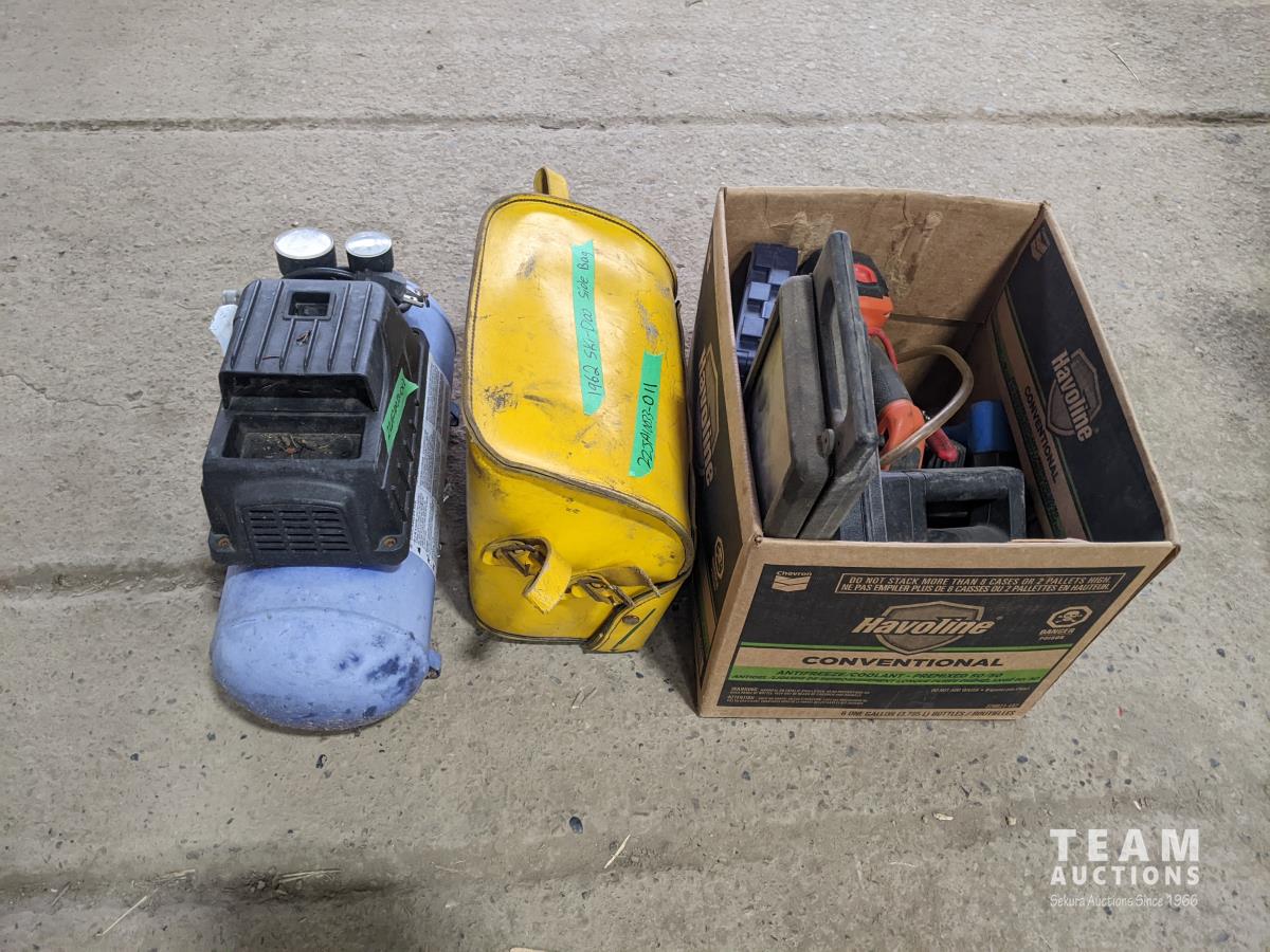 Skidoo side bag, small air compressor, qty of tools, jigsaw and skilsaw
